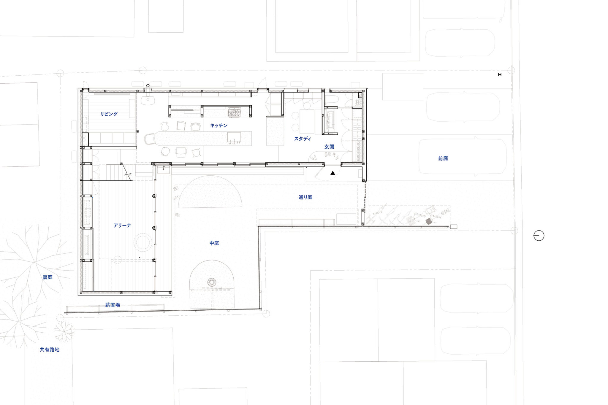 旗竿敷地がせめぎあい、街区の中心部は接道できない宅地も生まれてきており、それらは路地状の共有地によってそのアクセスが確保されていたりする。そんな街区の中の、旗竿形状ながら86坪のやや広めな敷地に住宅を設計することになった。