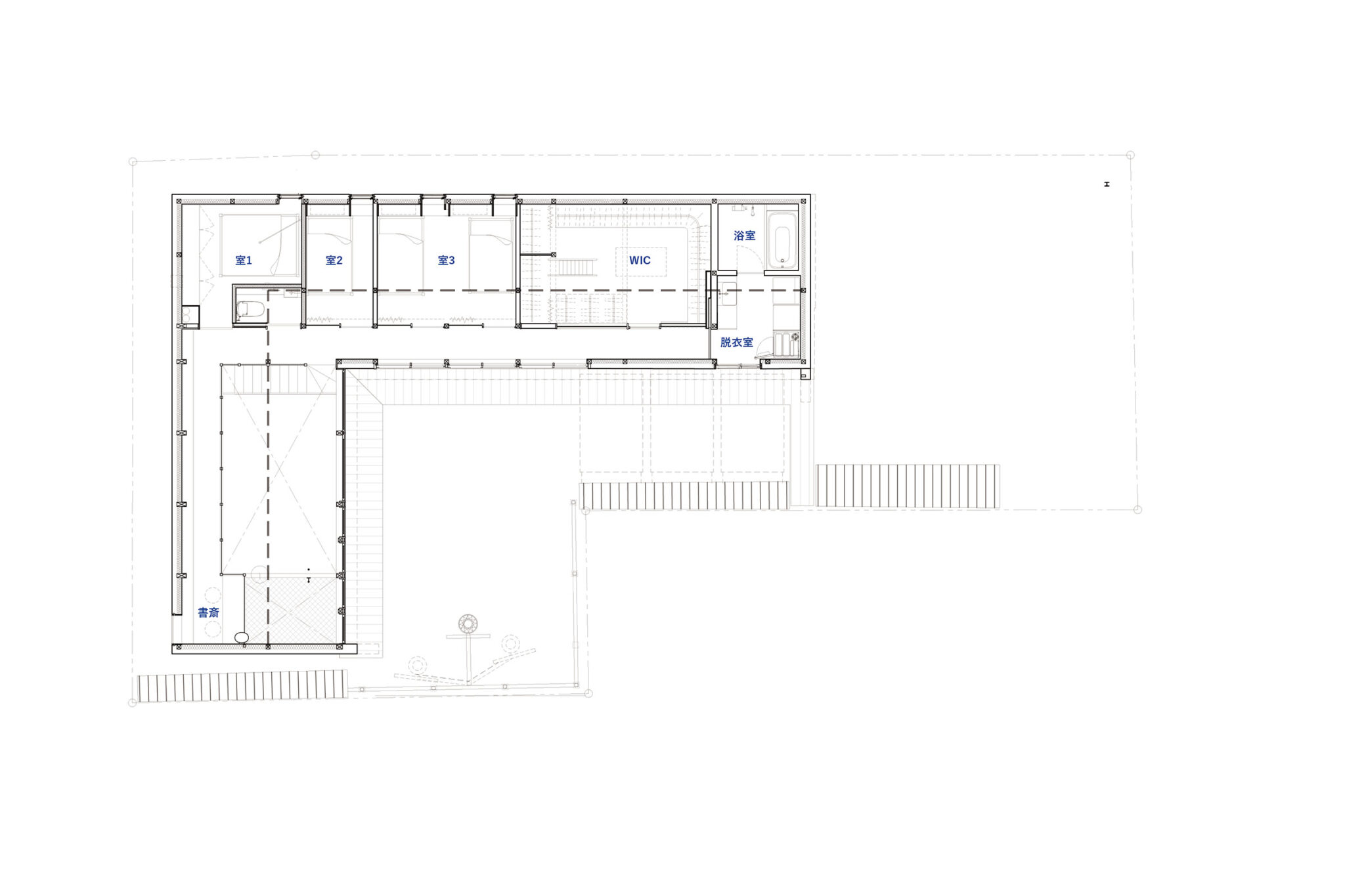 宮崎晃吉 / HAGISOによる、群馬の住宅「前橋の道の輪郭」。路地状の共有地などが見られる街区での計画。建築の時間と住み手の時間との折合いも主題とし、読み替えられながらも生き続ける存在を志向。路地の延長線上の“たまり”となる中庭の周りに諸室を配置する建築を考案2階平面図 image©HAGISO