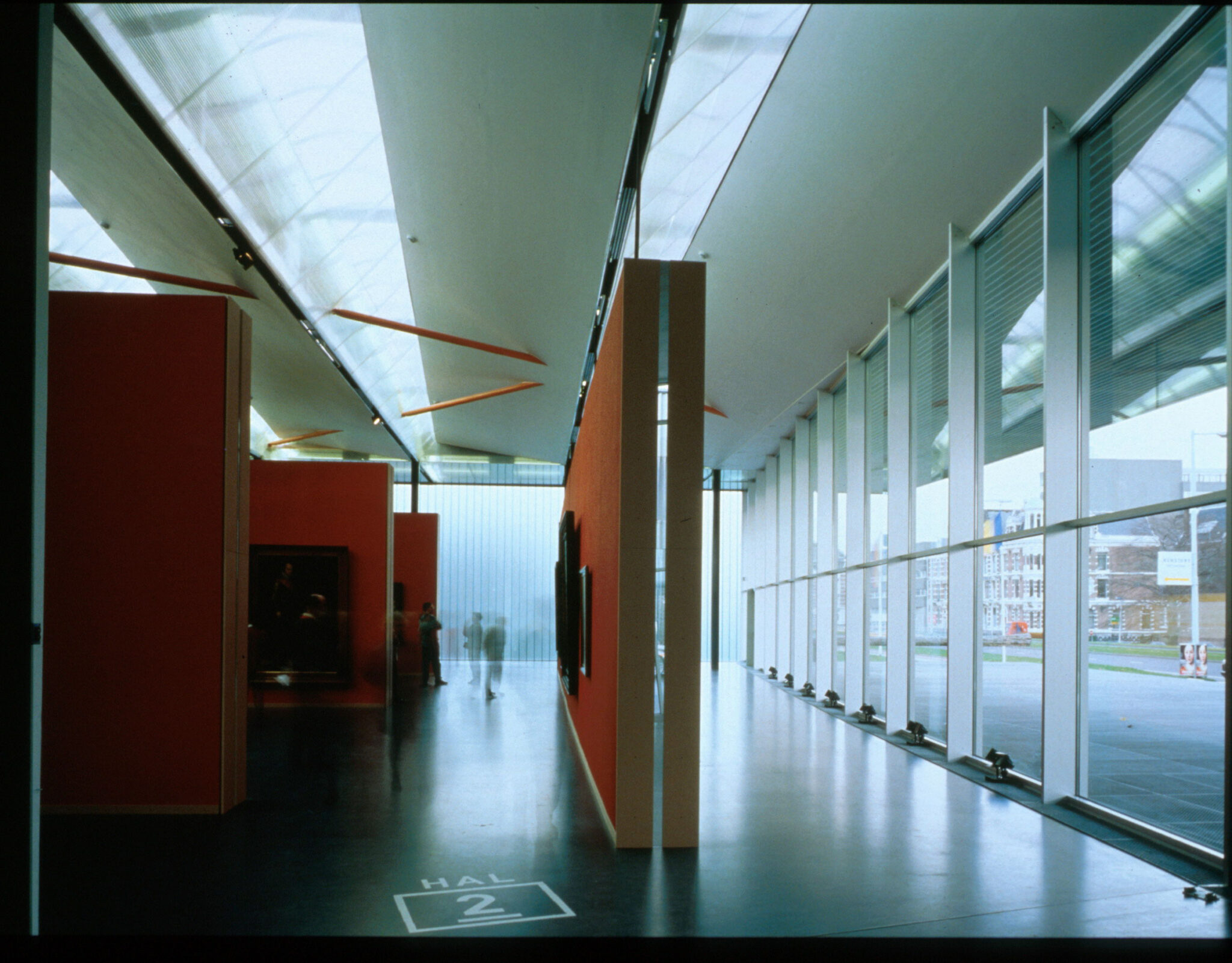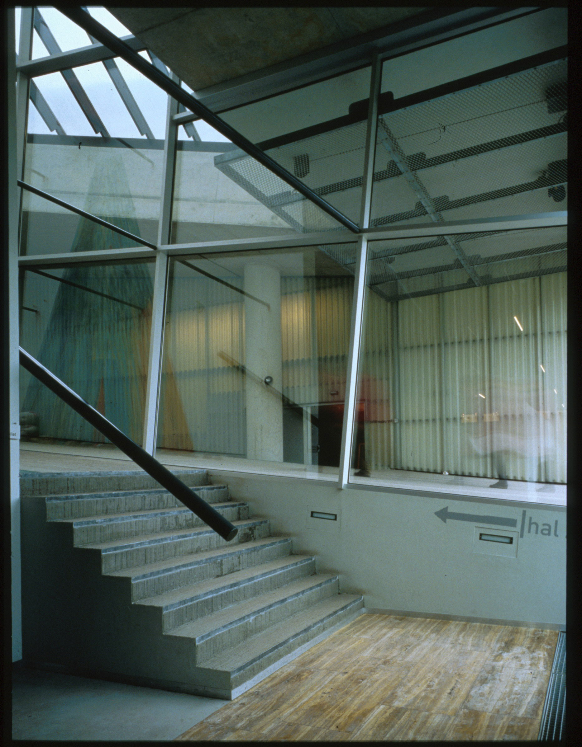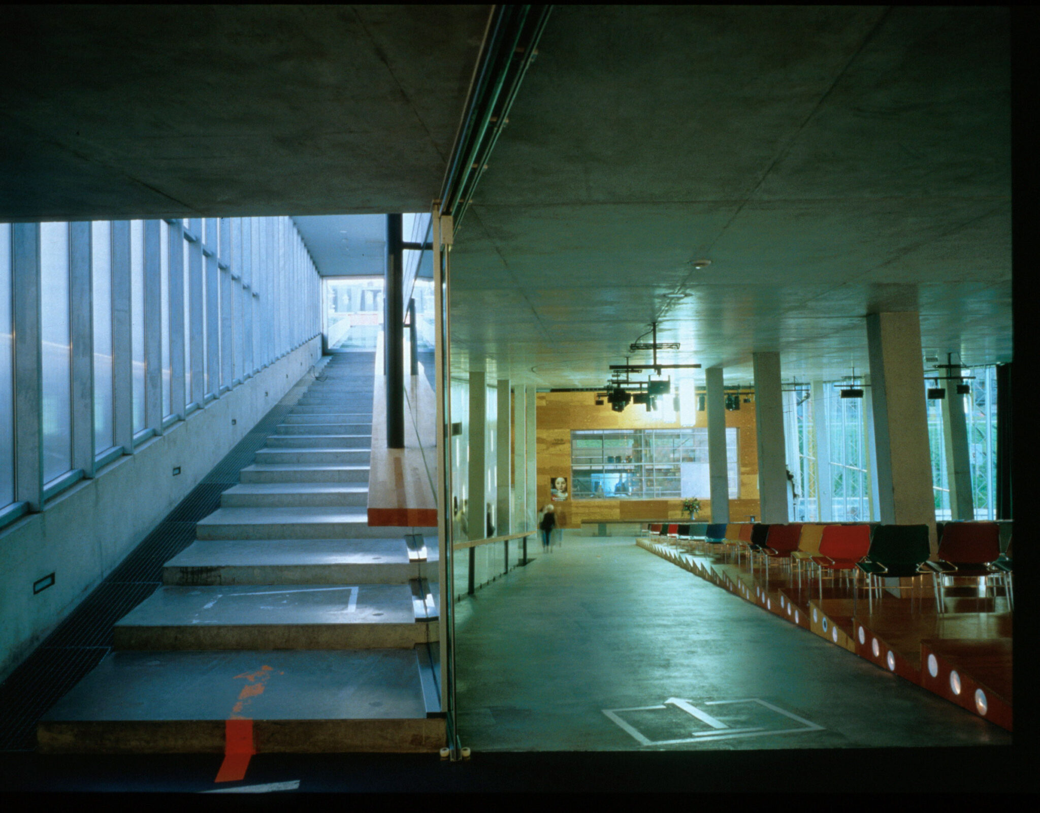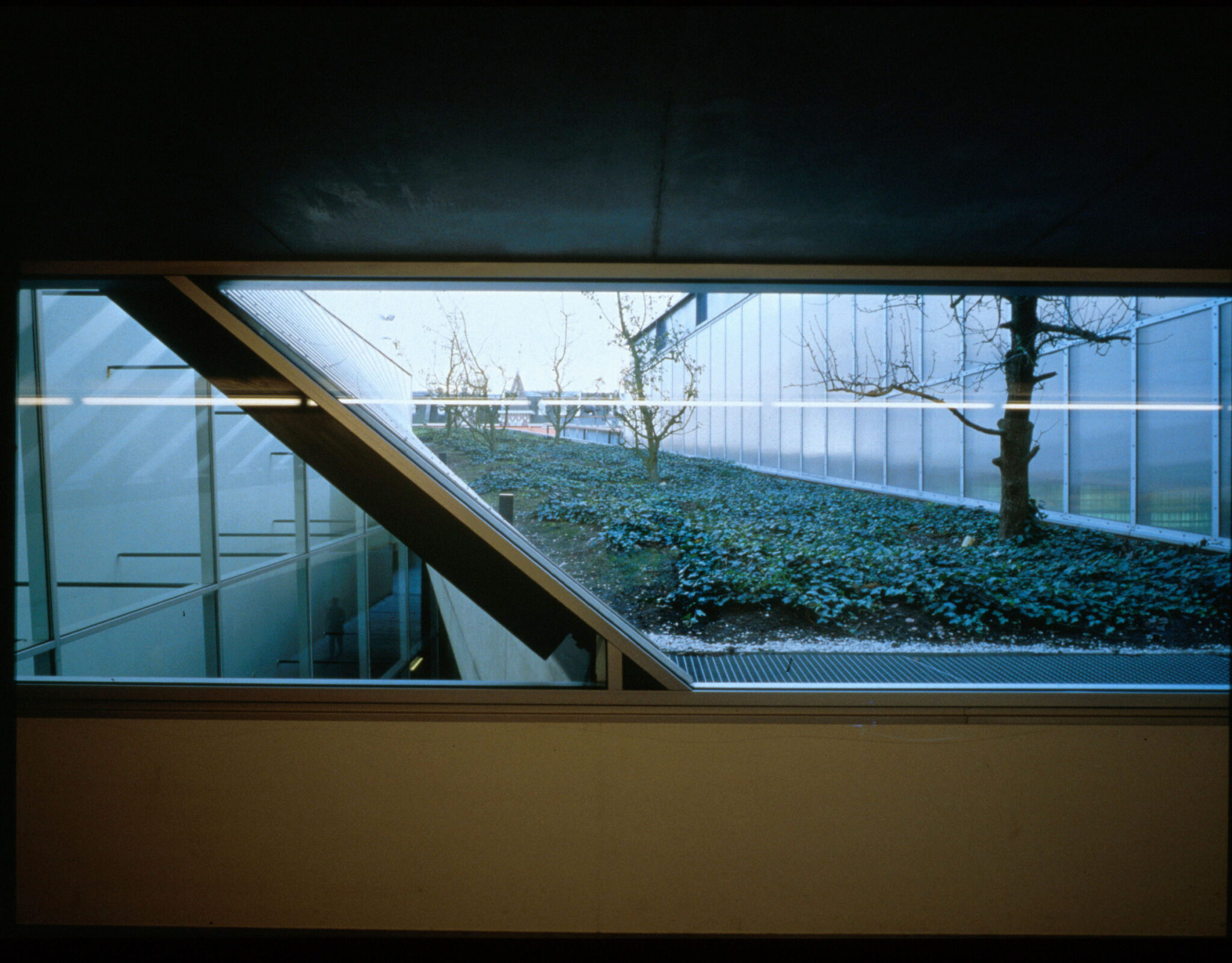 Approaching the first hall, one confronts a stairway and an obstructed view, which is gradually revealed – a landscape of tree-columns with a backdrop of greenery framed, and sometimes distorted by the different types of glass of the park facade. From there one follows the inner ramp leading to hall 2, a wide open sky lit space facing the boulevard. A third ramp along a roof garden leads to a more intimate single-height hall and further on to the roof terrace.