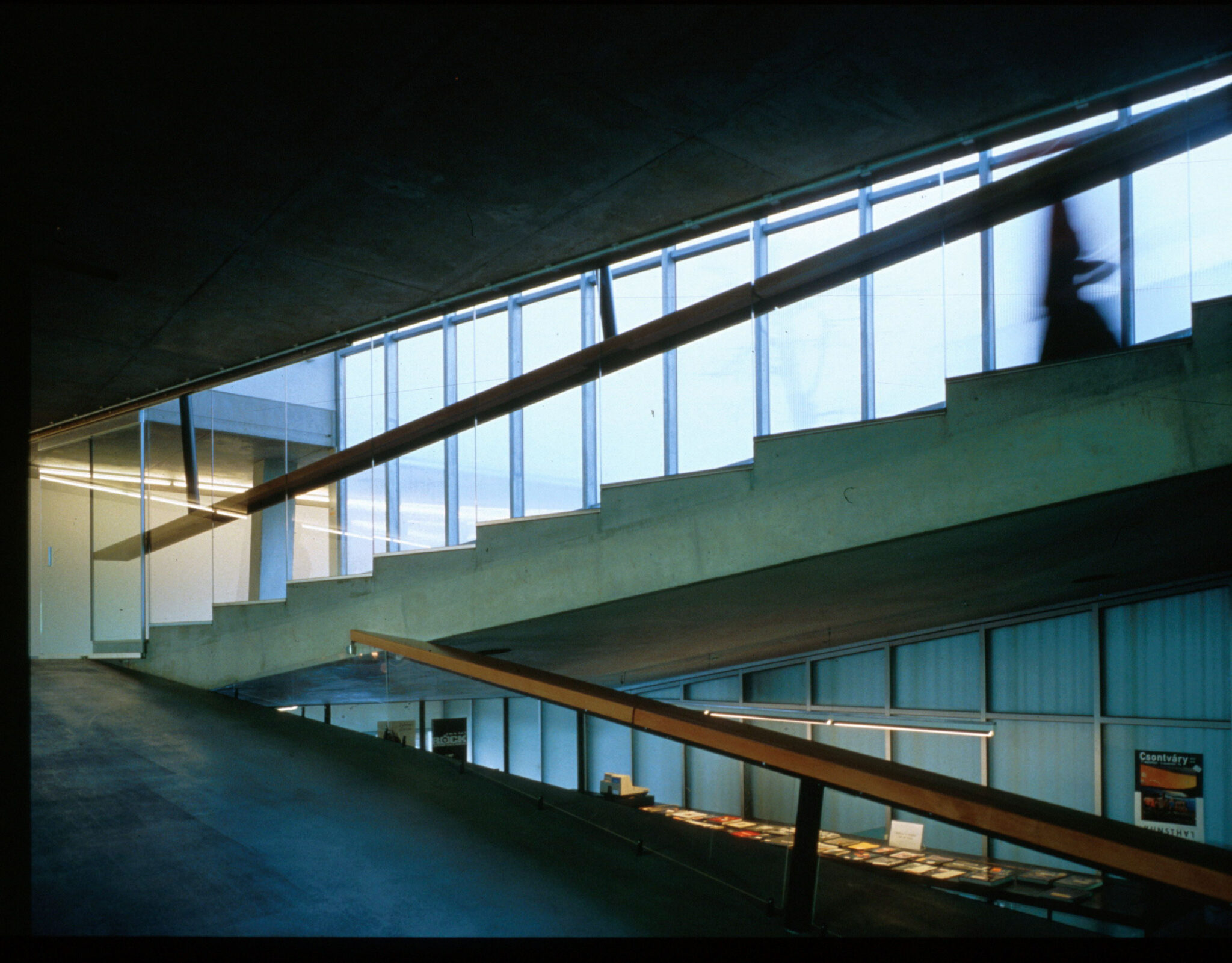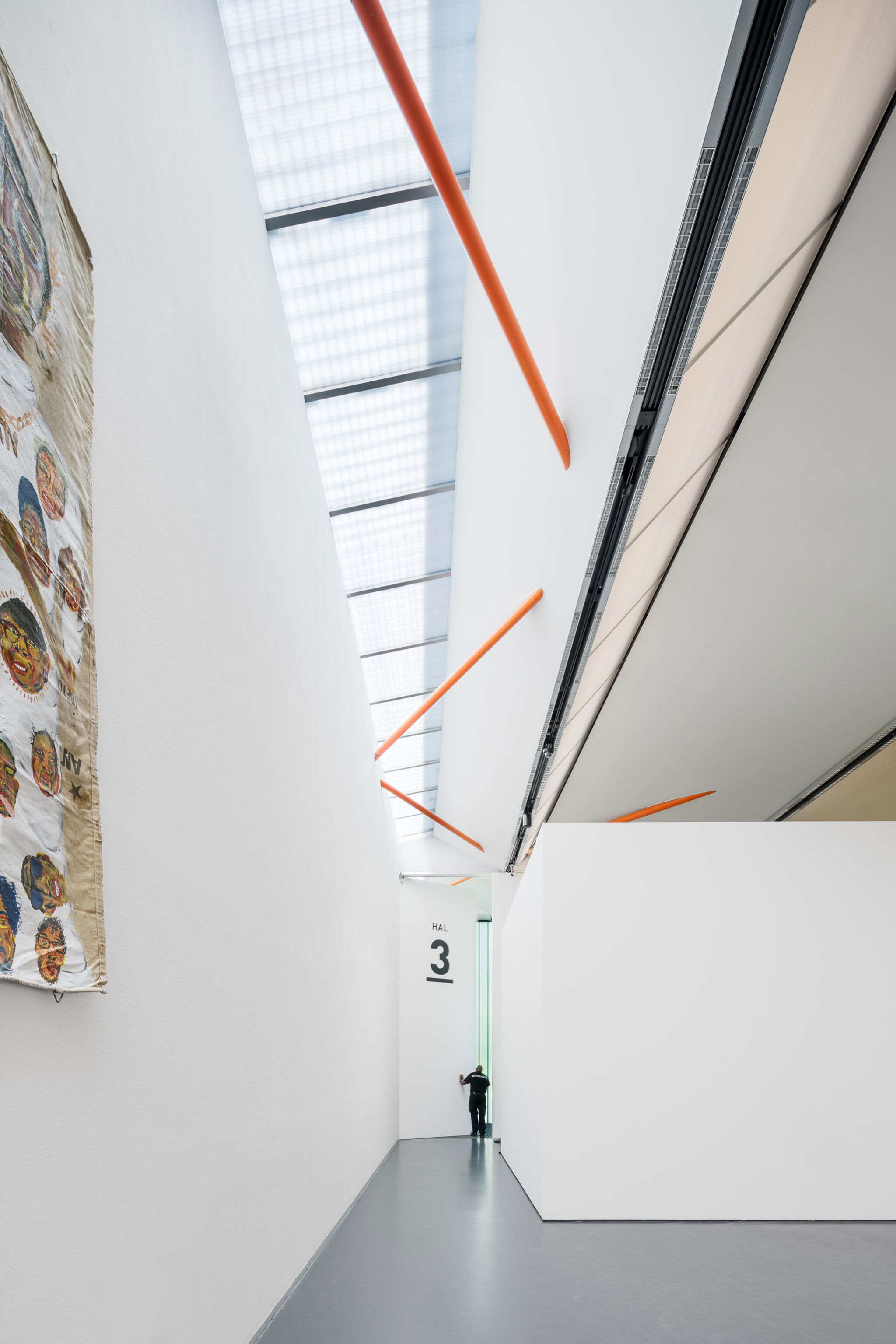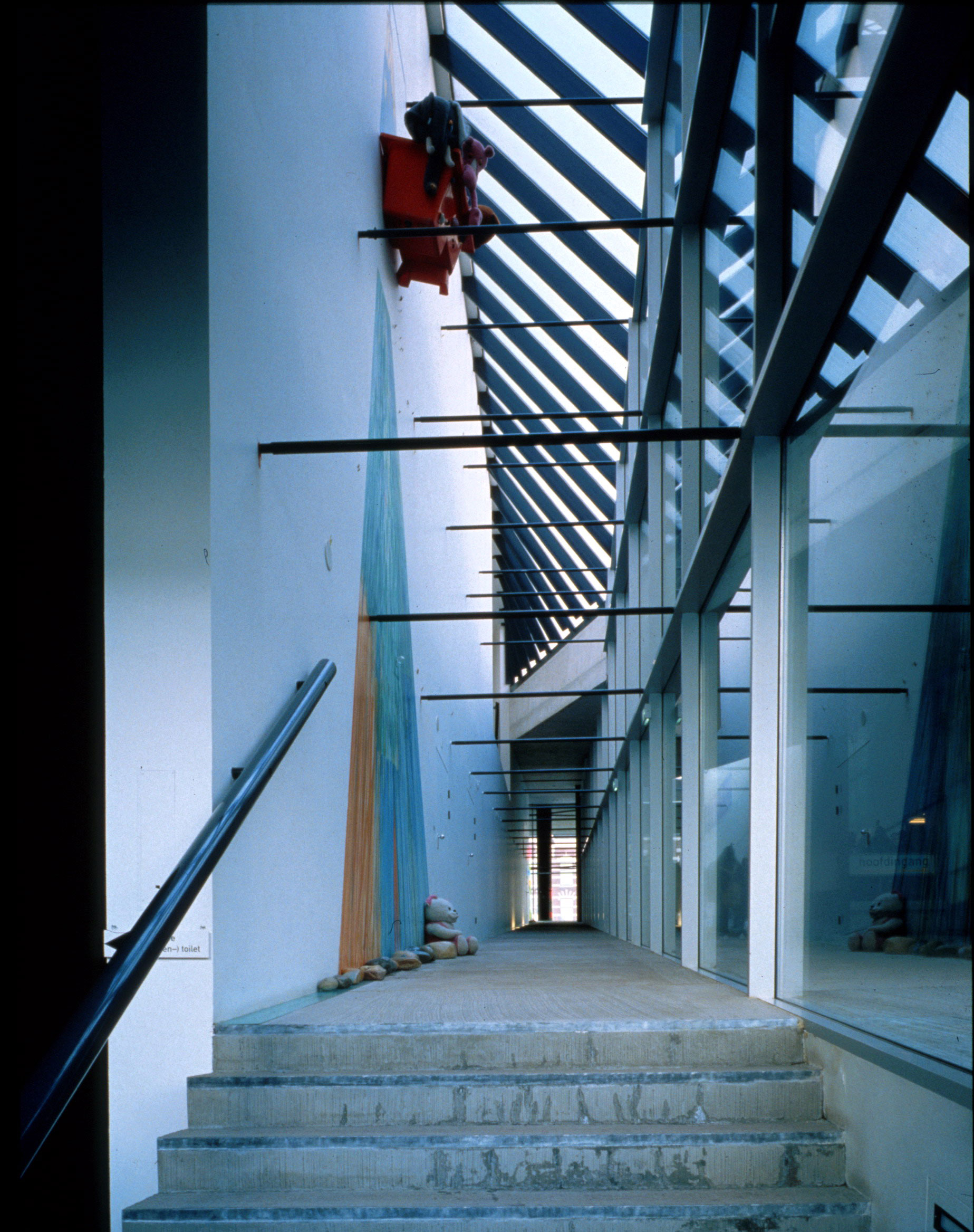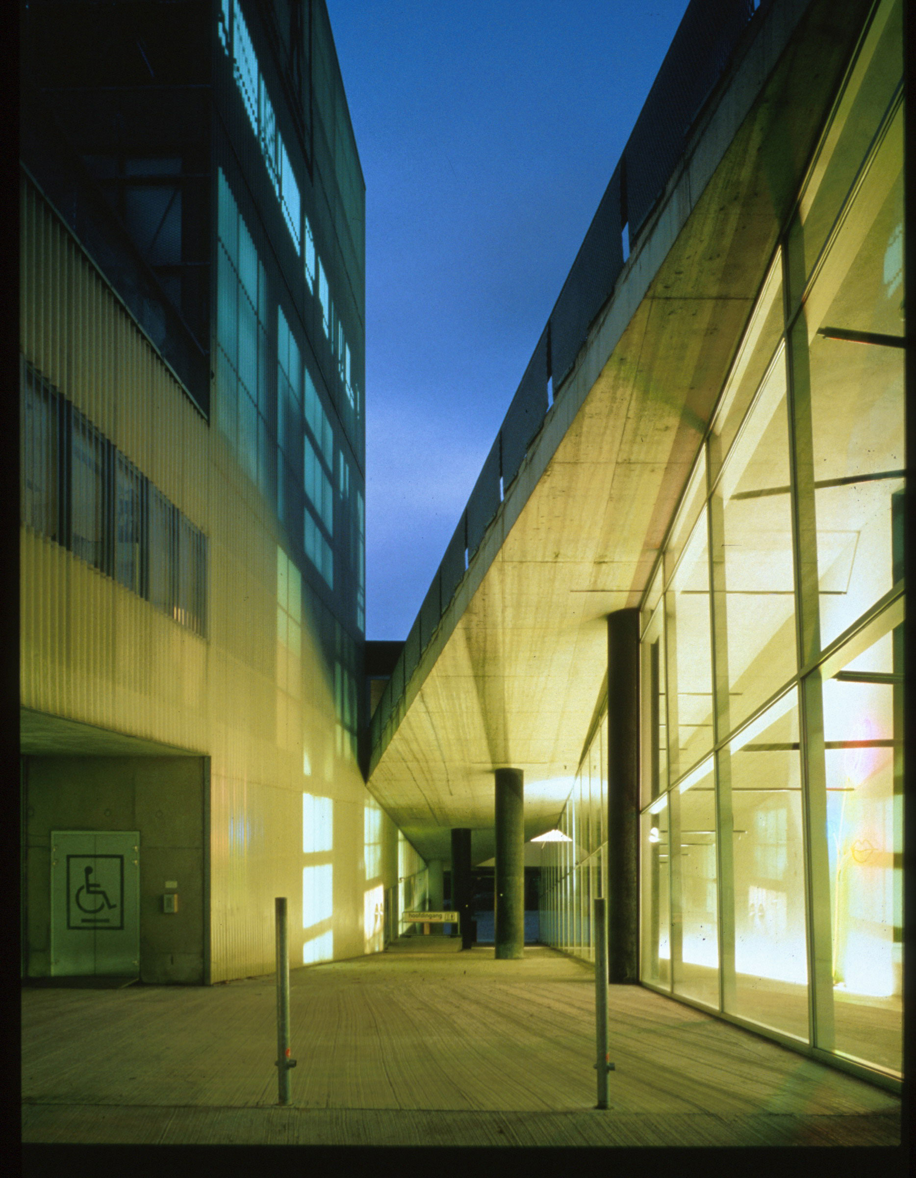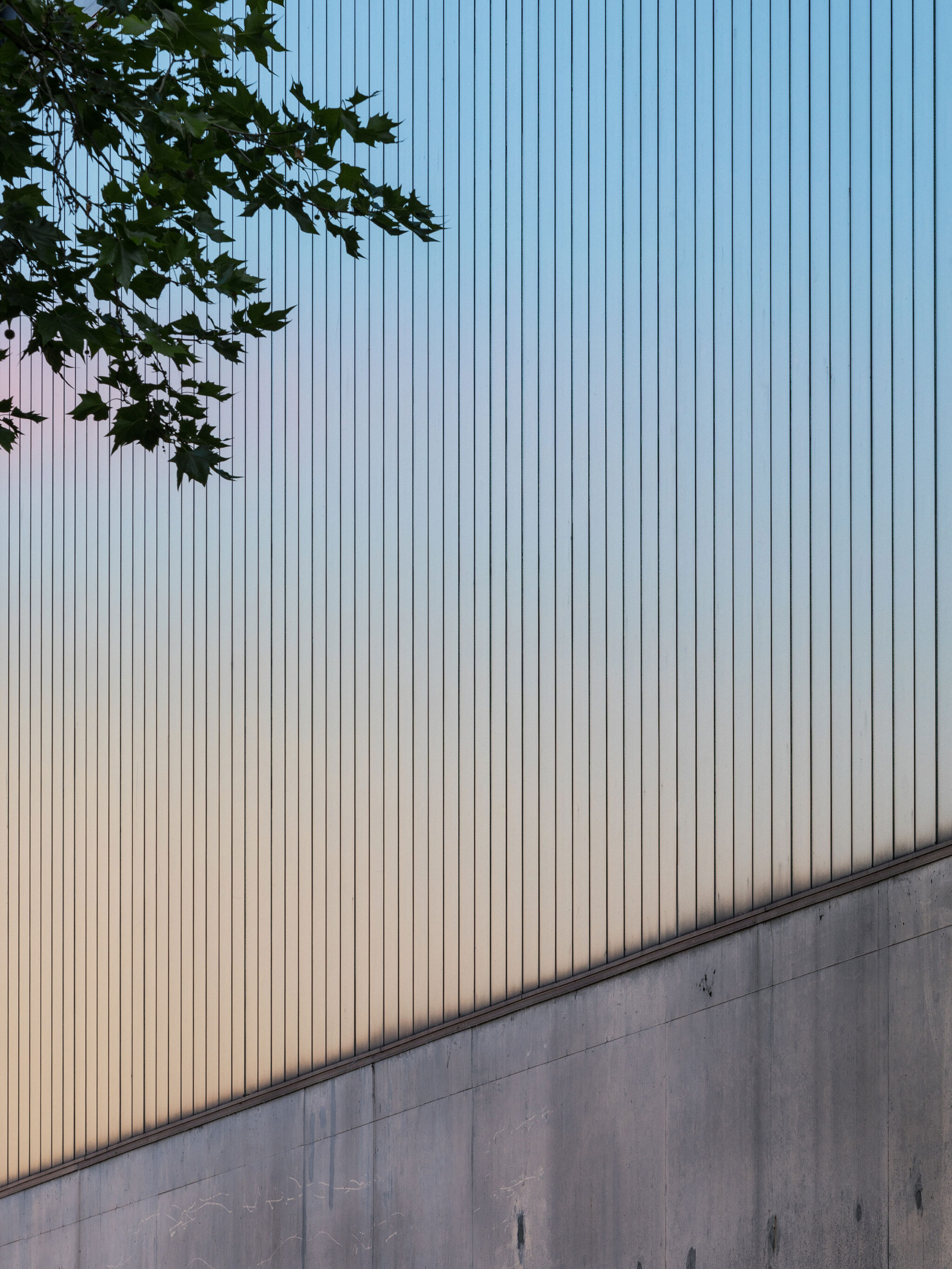 Approaching the first hall, one confronts a stairway and an obstructed view, which is gradually revealed – a landscape of tree-columns with a backdrop of greenery framed, and sometimes distorted by the different types of glass of the park facade. From there one follows the inner ramp leading to hall 2, a wide open sky lit space facing the boulevard. A third ramp along a roof garden leads to a more intimate single-height hall and further on to the roof terrace.
