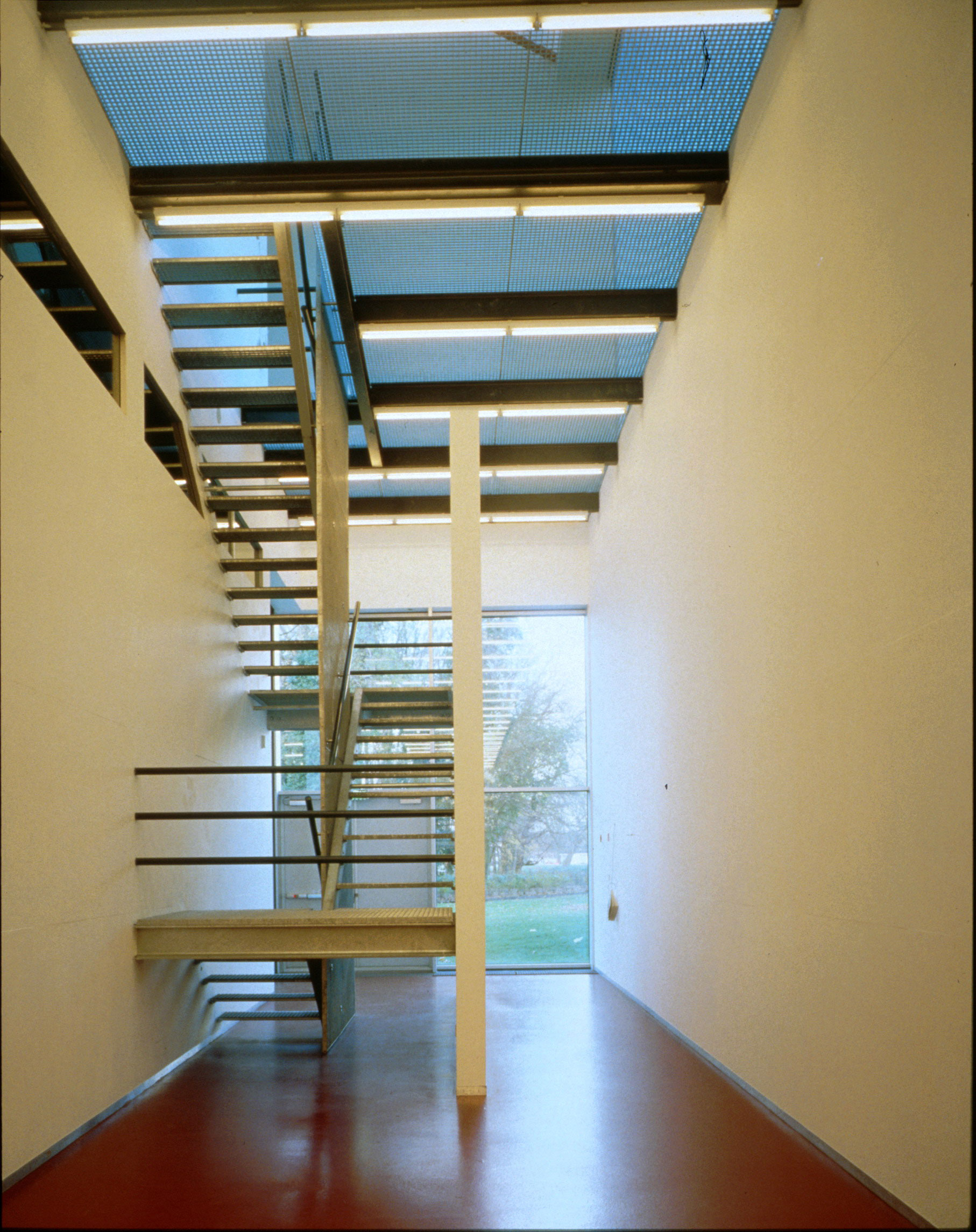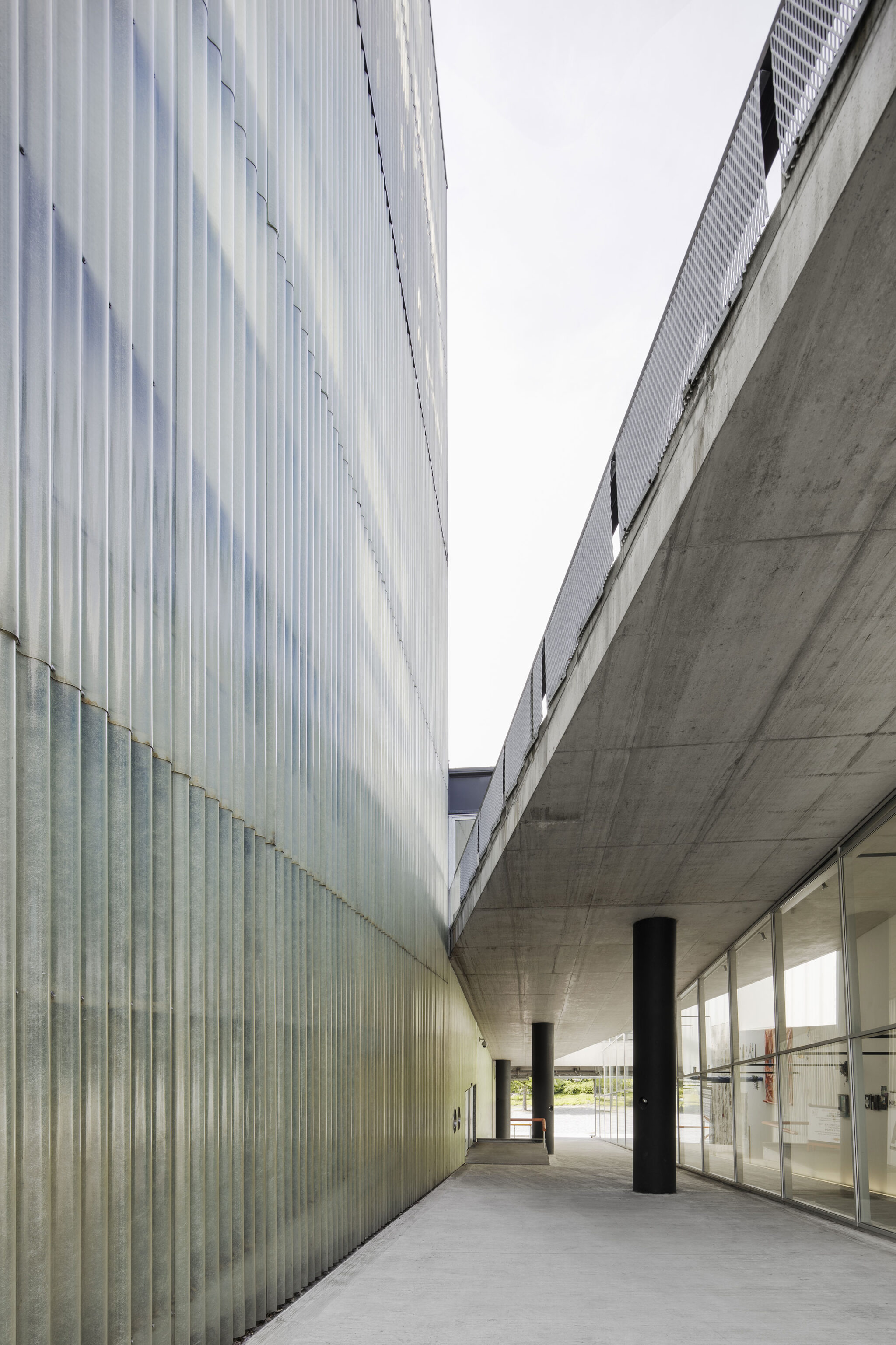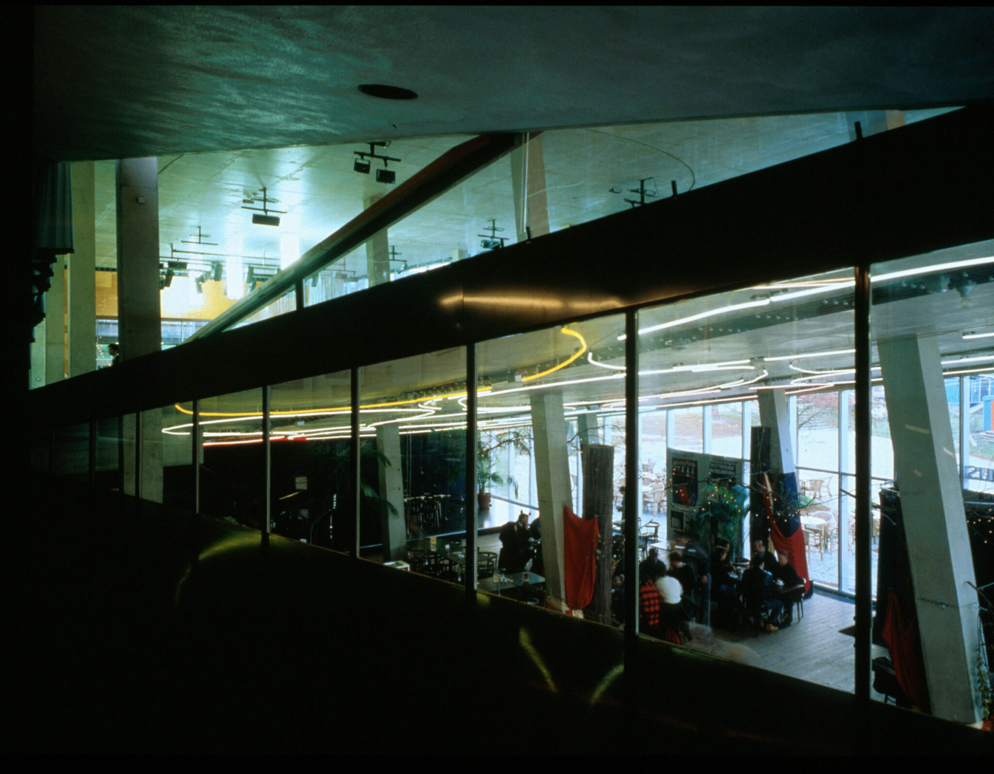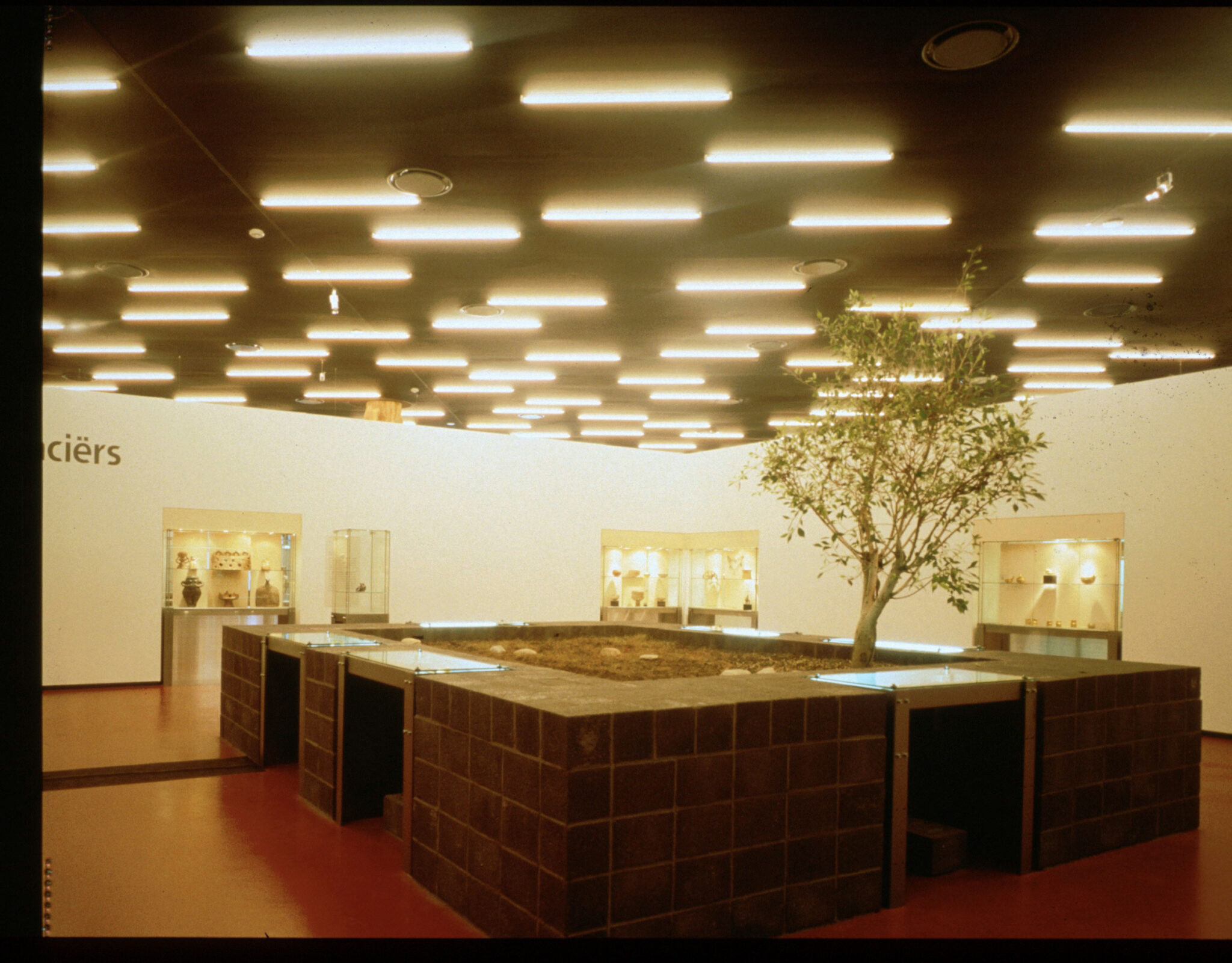 Approaching the first hall, one confronts a stairway and an obstructed view, which is gradually revealed – a landscape of tree-columns with a backdrop of greenery framed, and sometimes distorted by the different types of glass of the park facade. From there one follows the inner ramp leading to hall 2, a wide open sky lit space facing the boulevard. A third ramp along a roof garden leads to a more intimate single-height hall and further on to the roof terrace.