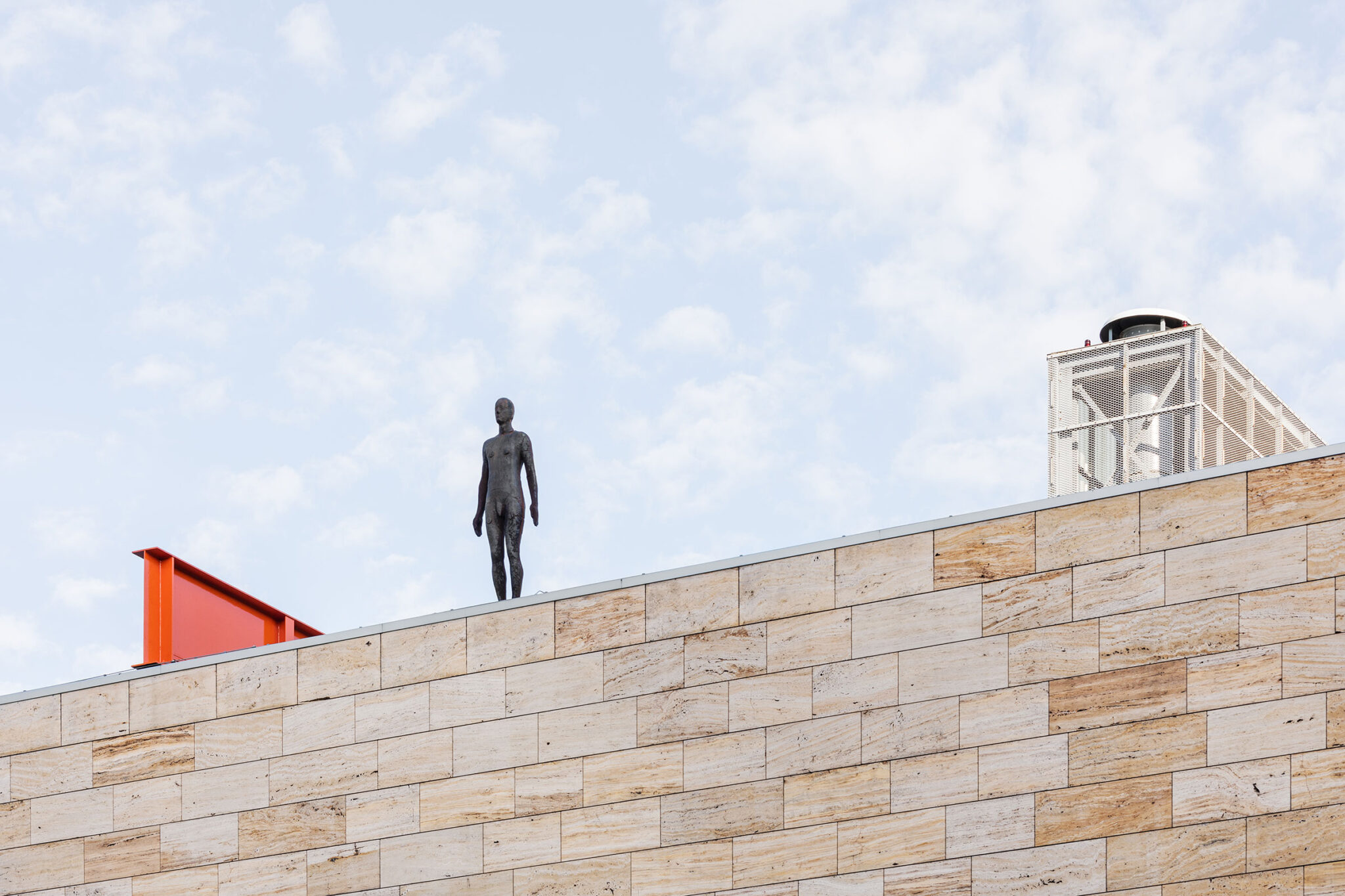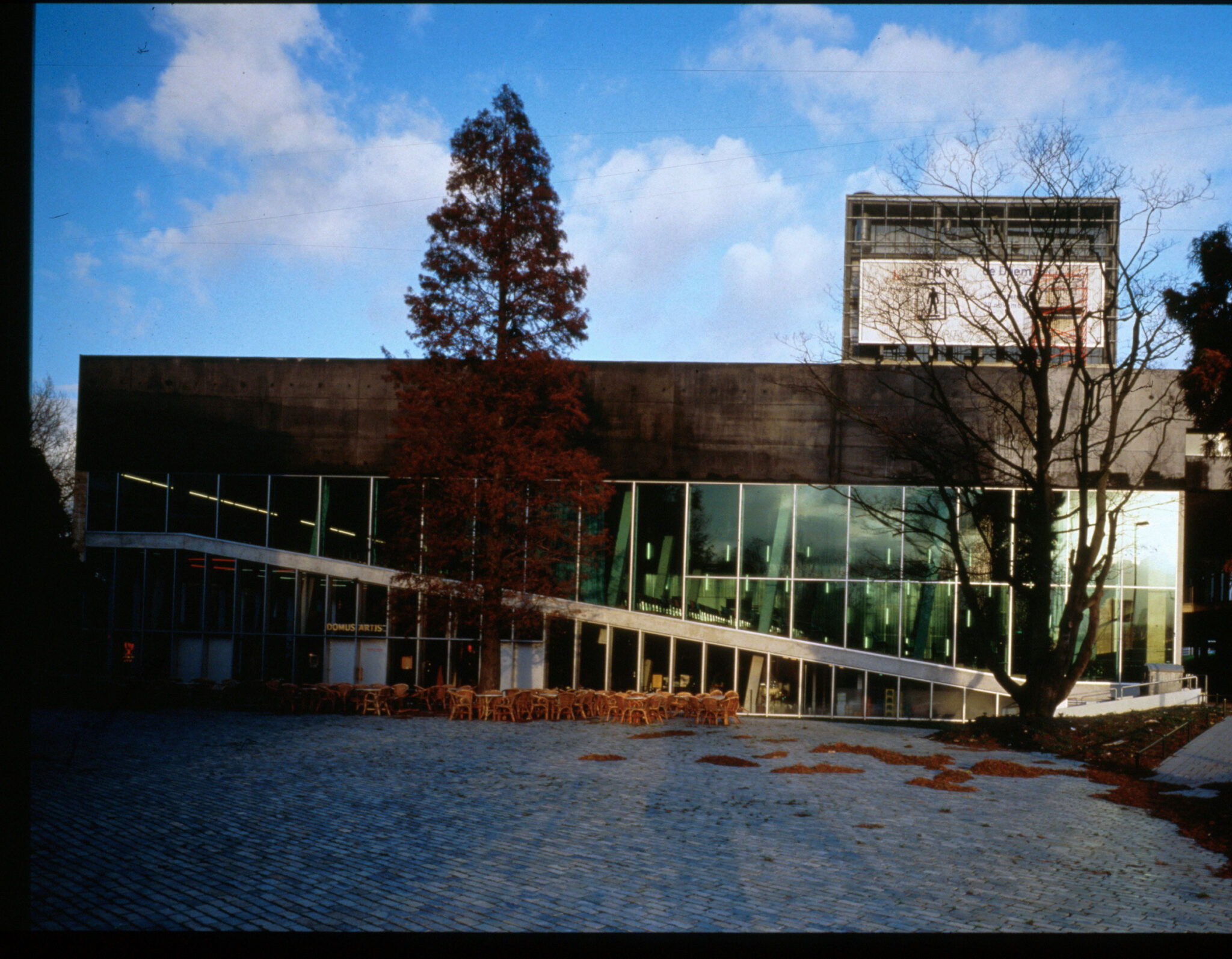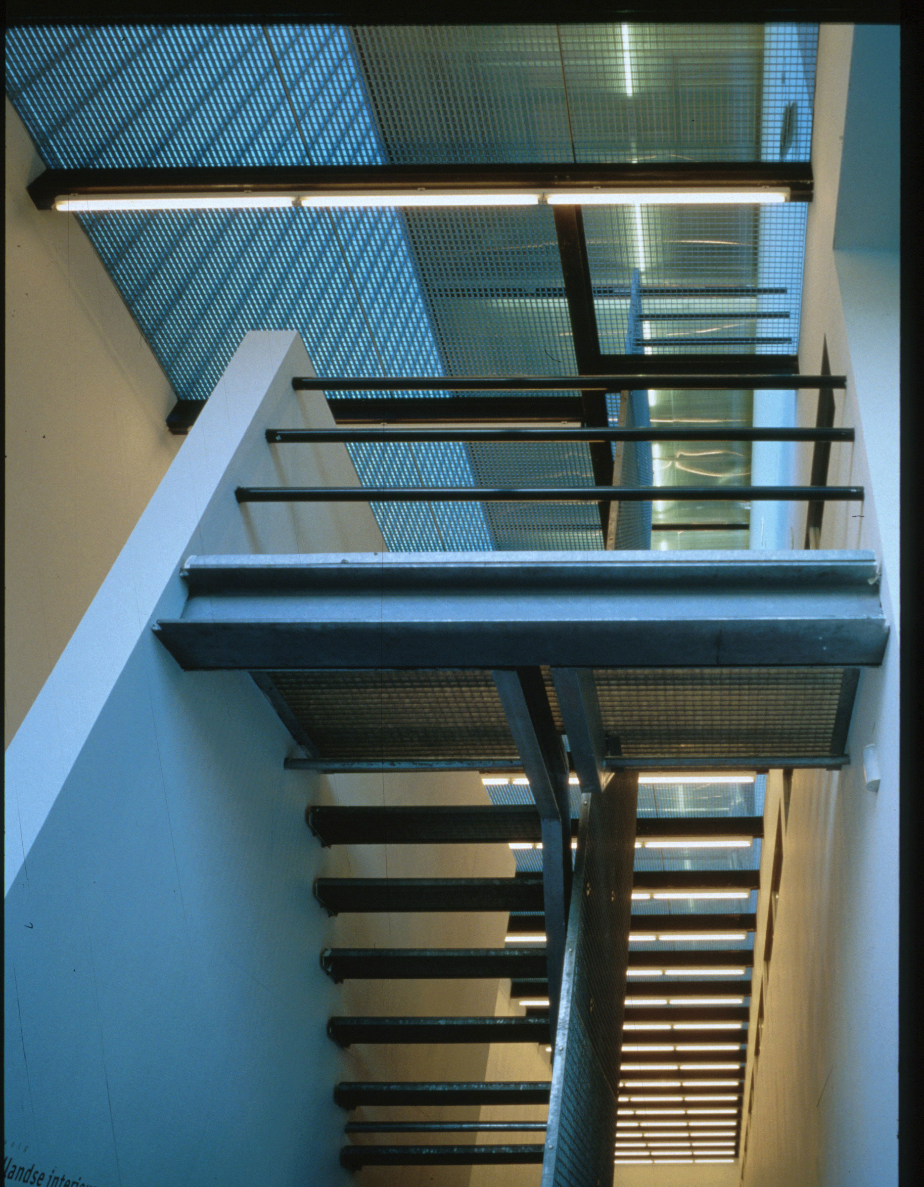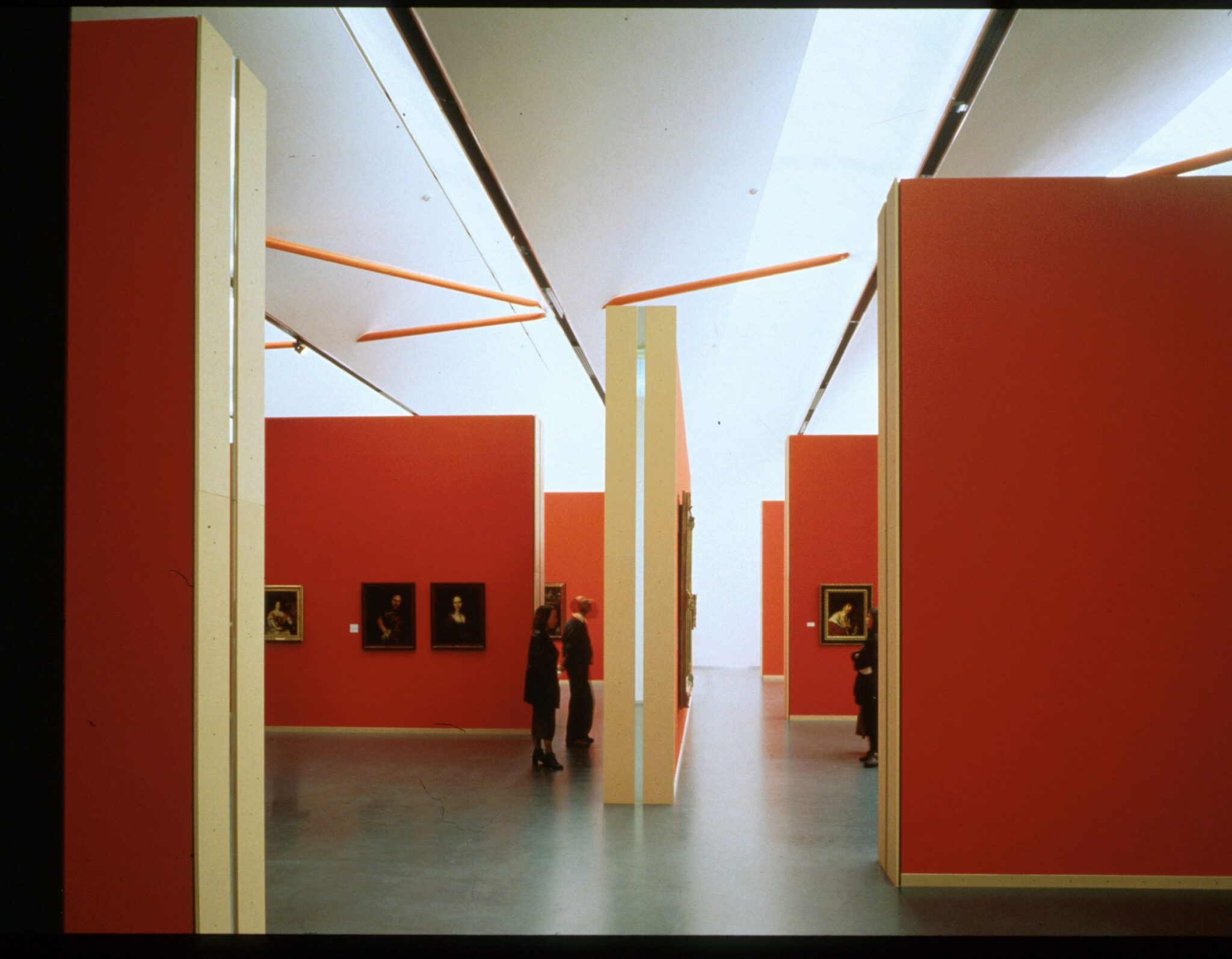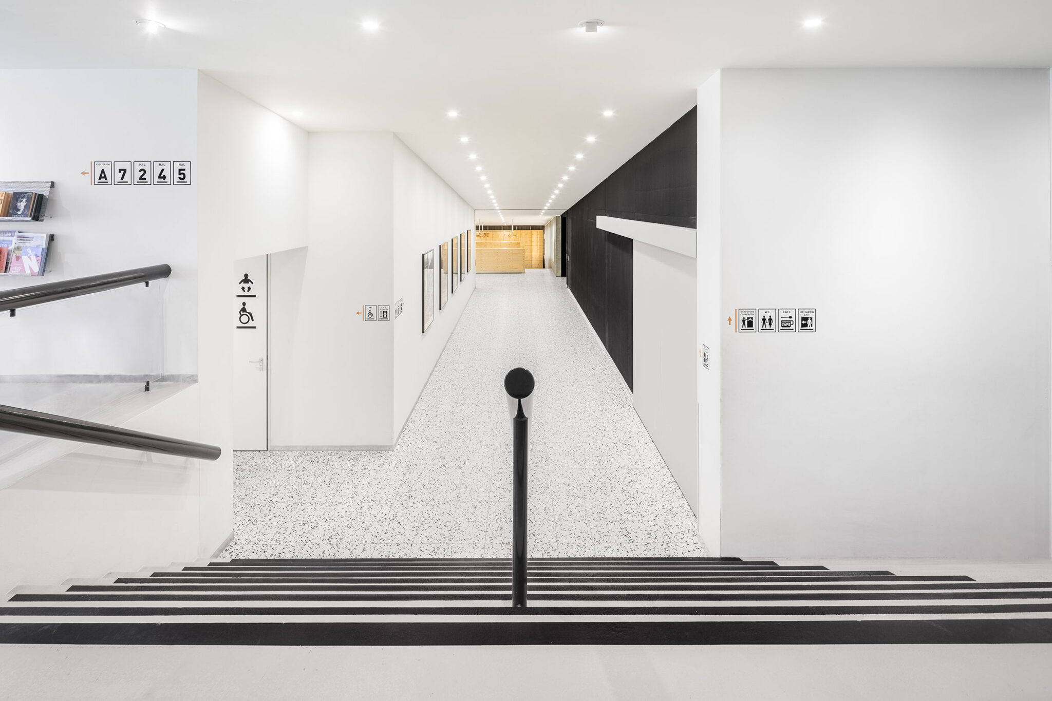 Approaching the first hall, one confronts a stairway and an obstructed view, which is gradually revealed – a landscape of tree-columns with a backdrop of greenery framed, and sometimes distorted by the different types of glass of the park facade. From there one follows the inner ramp leading to hall 2, a wide open sky lit space facing the boulevard. A third ramp along a roof garden leads to a more intimate single-height hall and further on to the roof terrace.