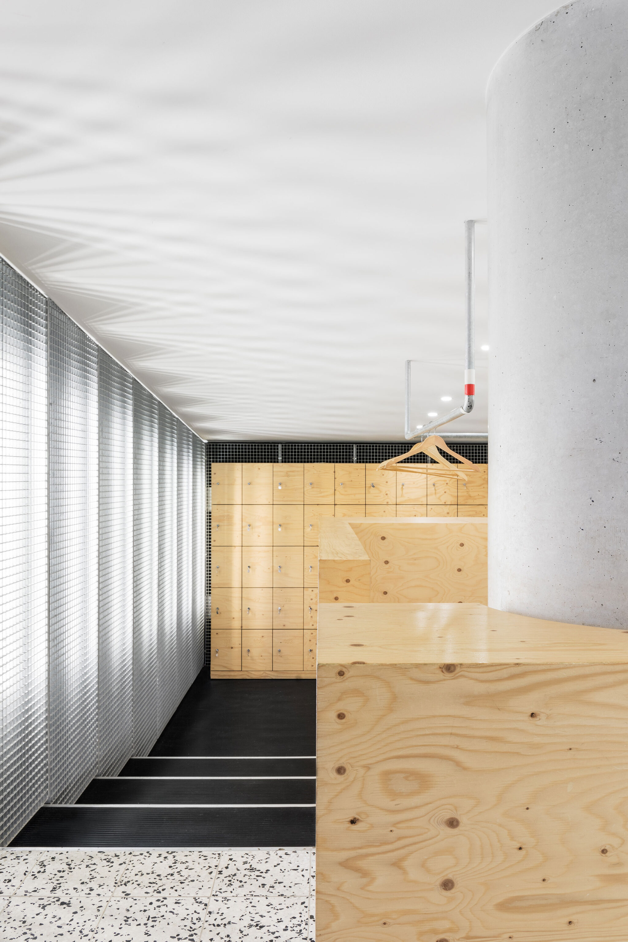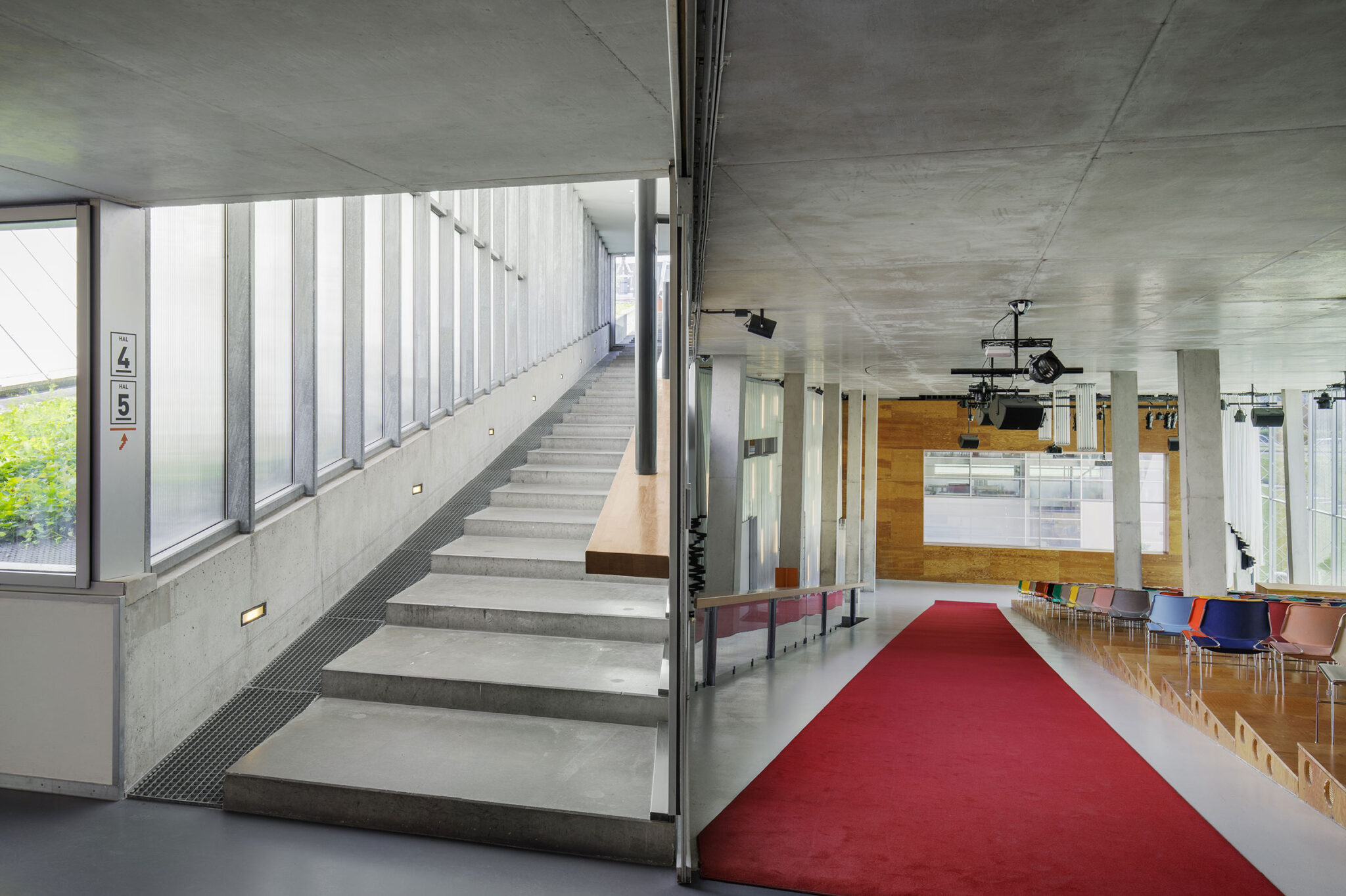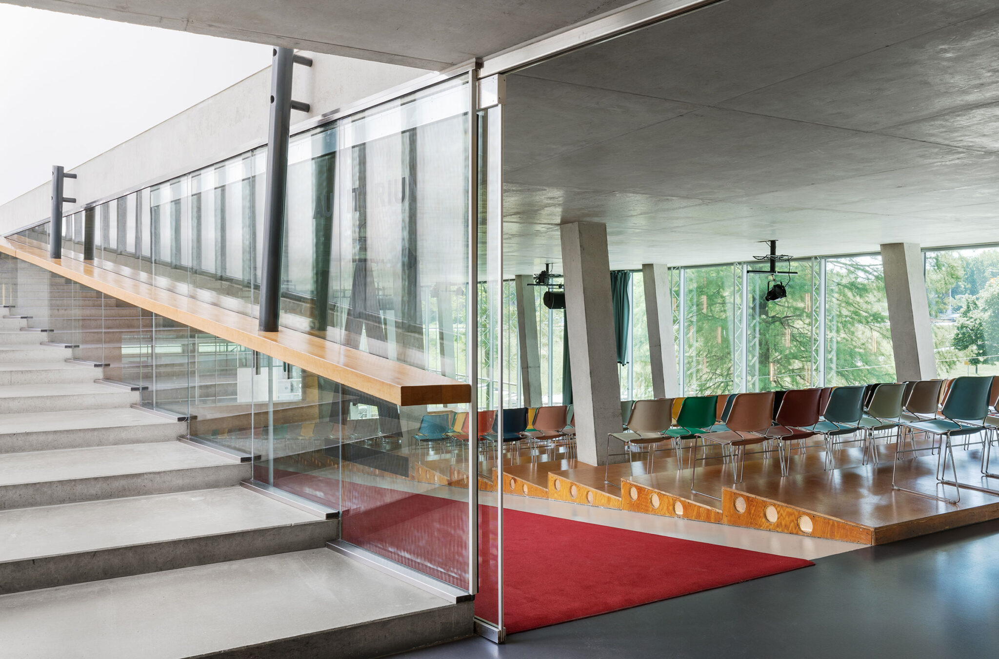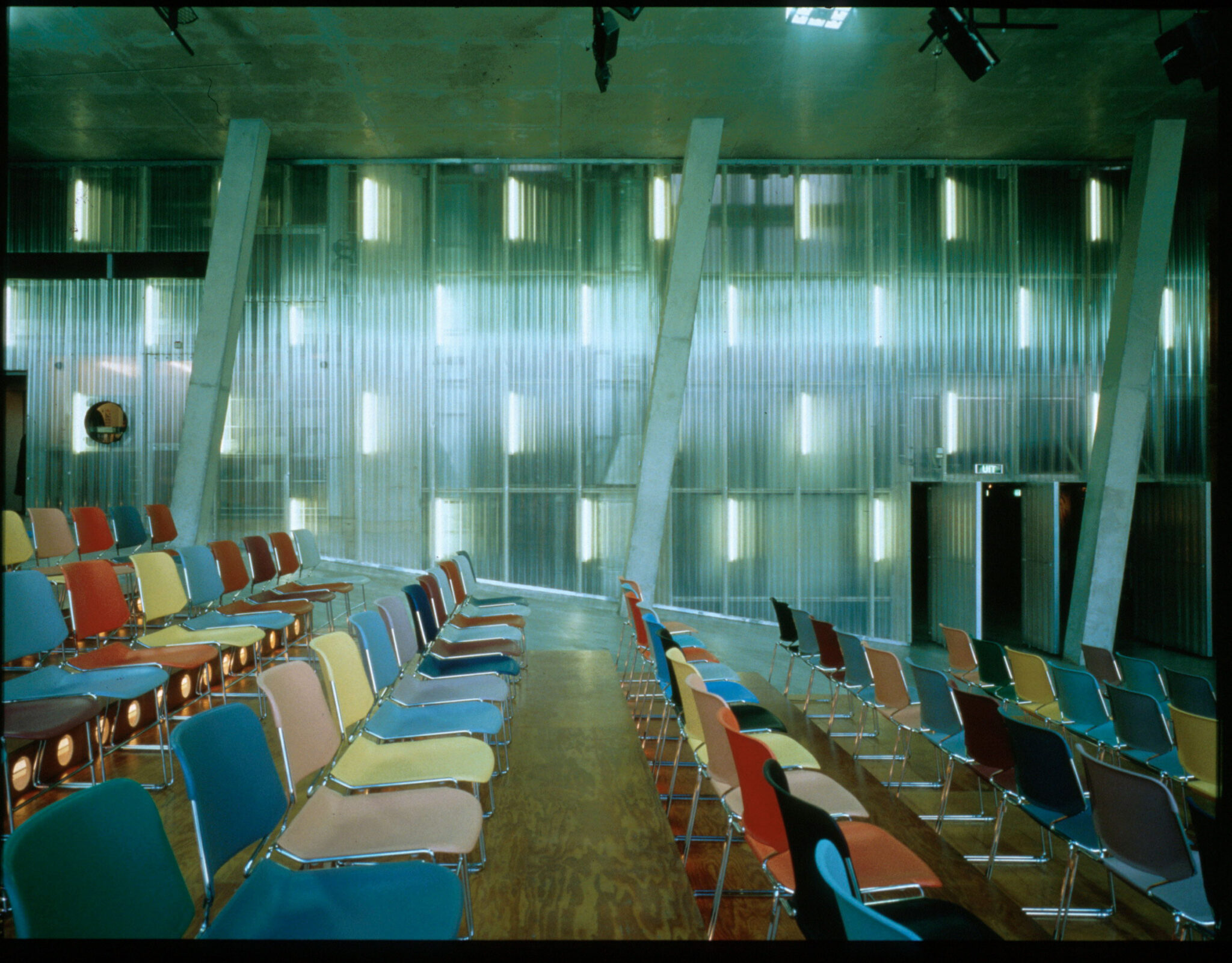 Approaching the first hall, one confronts a stairway and an obstructed view, which is gradually revealed – a landscape of tree-columns with a backdrop of greenery framed, and sometimes distorted by the different types of glass of the park facade. From there one follows the inner ramp leading to hall 2, a wide open sky lit space facing the boulevard. A third ramp along a roof garden leads to a more intimate single-height hall and further on to the roof terrace.