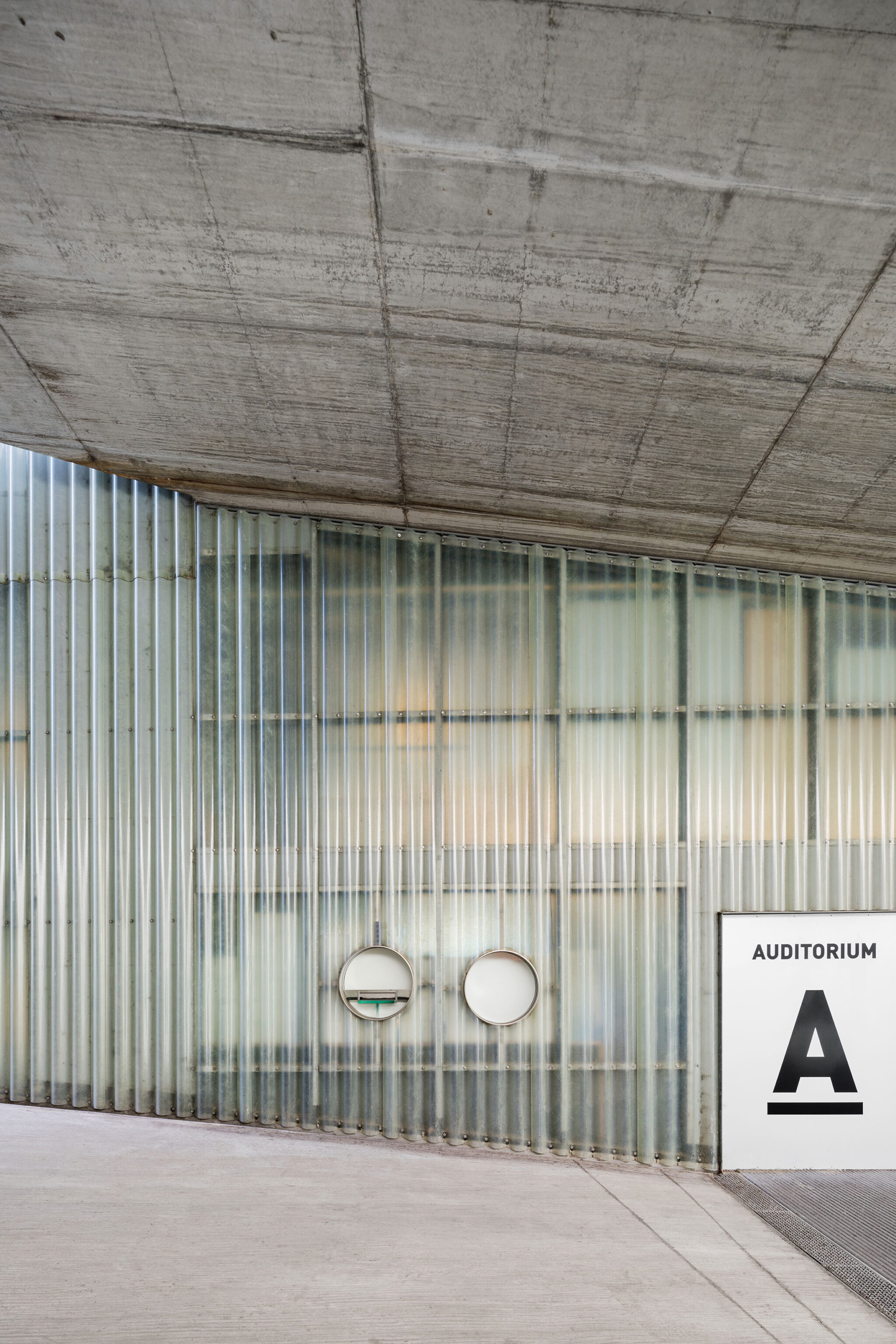 The pedestrian ramp is split, with a glass wall separating the outside, which is open to the public, from the inside, which is part of the circuit. A second ramp, running parallel and reversed, is terraced to accommodate an auditorium, and beneath it the restaurant. On the level where the two ramps cross, the main entrance is defined. From there the visitor enters a second ramp which goes down to the park and up to the dike level.