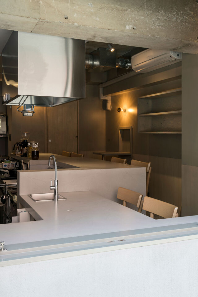 雨宮脩大建築企画による、東京・東村山市の、飲食店「ENCOUNTER」。狭小区画に“出会い”の名前の店を作る計画。利用者と料理人の双方が居心地よい空間を求め、雁行するカウンターや段差等で空間を細かく分節。其々の場で全体の長所短所を分かち合う様に固有の性質を与える