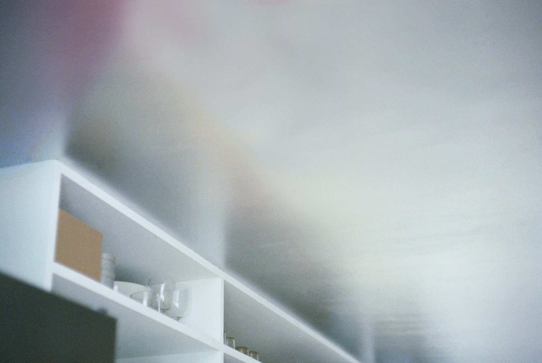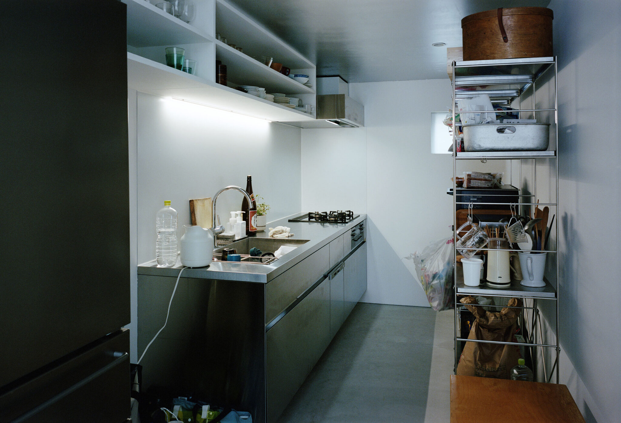 福田俊 / オフィススグルフクダによる、東京・東村山市の住宅「OVERLAP」。空間境界の“オーバーラップ”が生む関係を主題に計画。均質4分割の“単純な平面”ながら、全体を見通せず視線が奥へと流れ“奥行きを想像”させる構成を考案。確かにある“気配”が“現実を超える広がり”を生む1階、キッチン、天井と造り付けの棚 photo©Yurika Kono