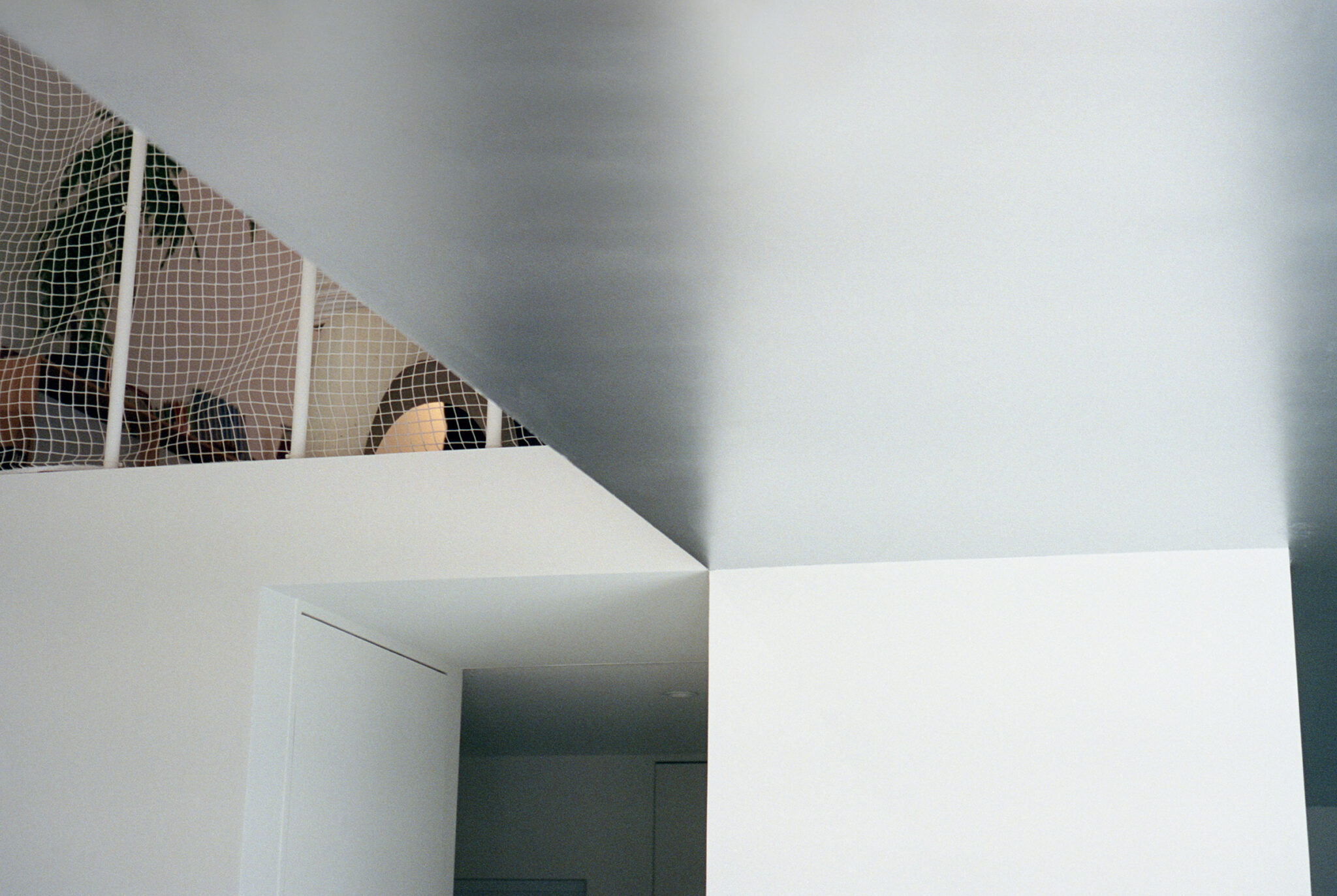 反復する平面と、視線が届かない構成は、声や音は聞こえるのに姿は見えない、遠くにいるようで近くに感じられるような感覚を生み、姿が見えなくても誰かの存在を確かに感じることで、空間の存在を想像させる。