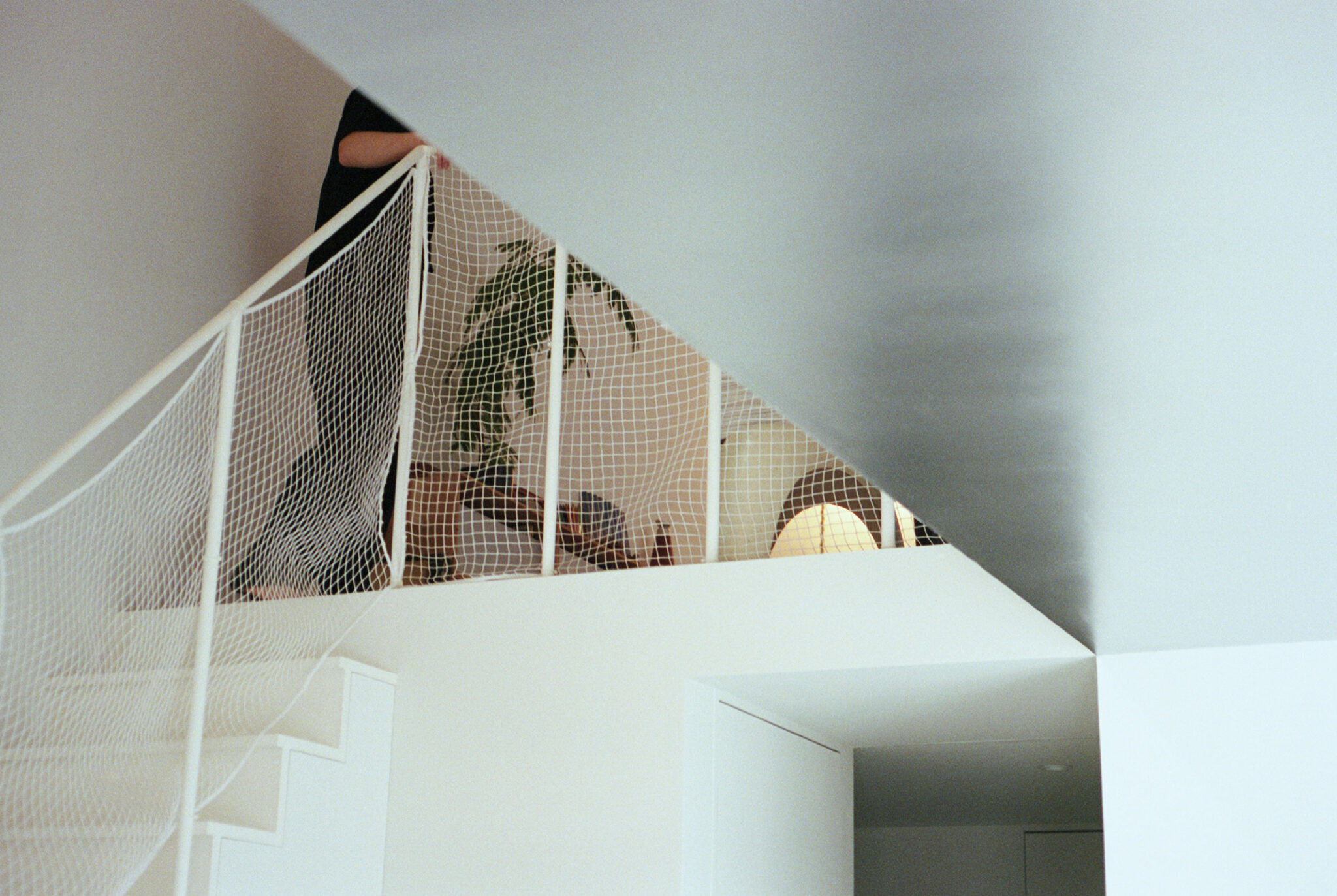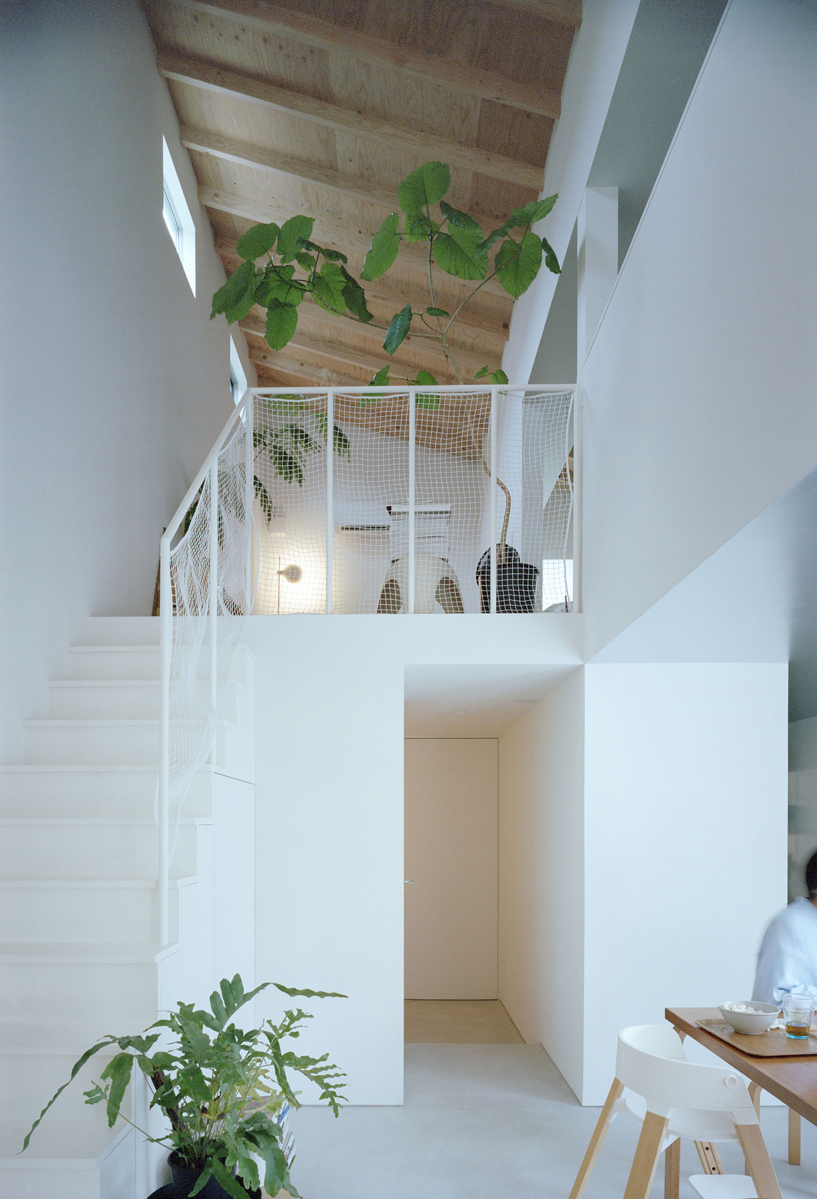 福田俊 / オフィススグルフクダによる、東京・東村山市の住宅「OVERLAP」。空間境界の“オーバーラップ”が生む関係を主題に計画。均質4分割の“単純な平面”ながら、全体を見通せず視線が奥へと流れ“奥行きを想像”させる構成を考案。確かにある“気配”が“現実を超える広がり”を生む2階、ルーム1から1階のホールを見下ろす。 photo©Yurika Kono