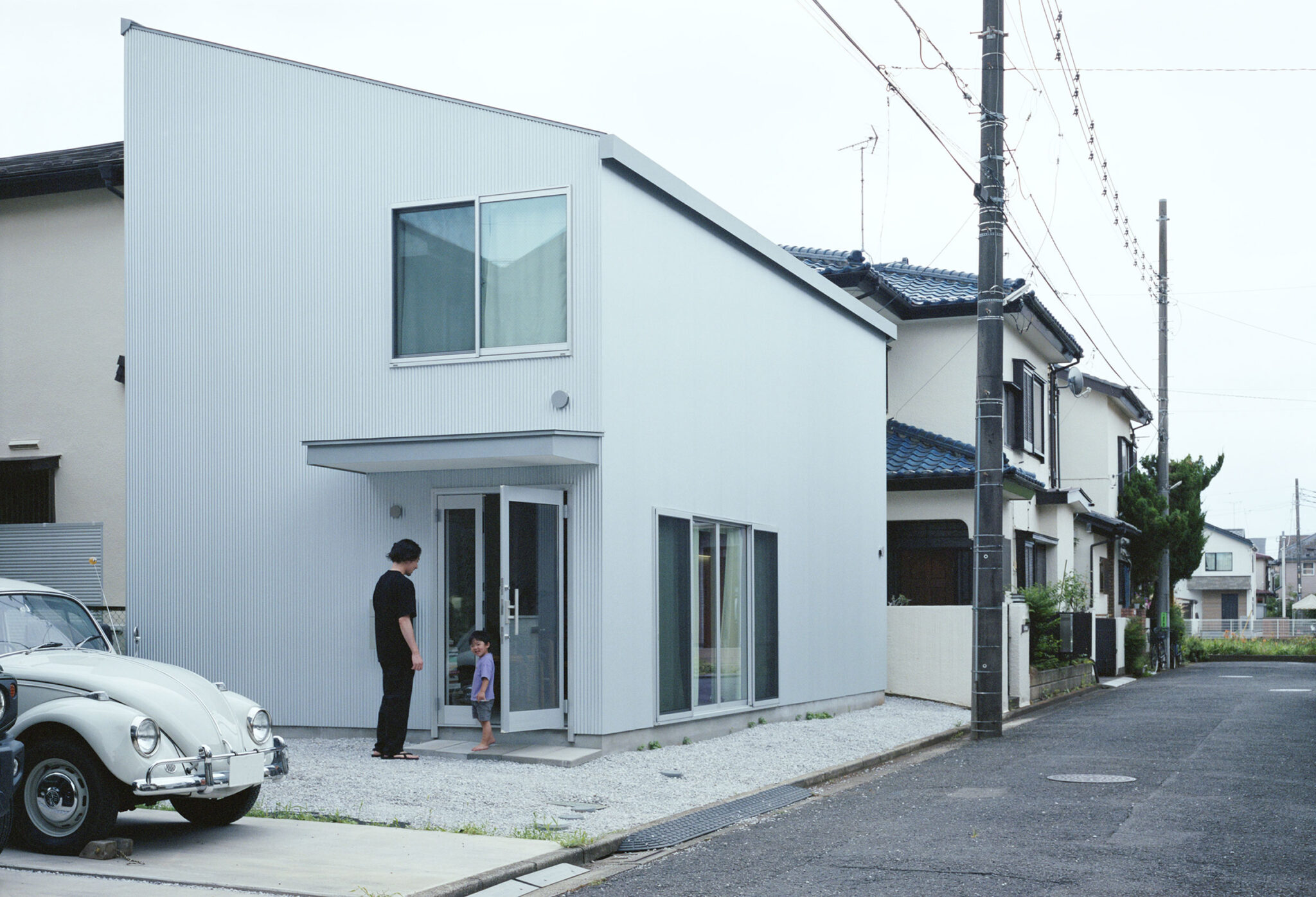 小泉誠 / Koizumi Studioによる、東京・東村山市の「いとう家の住宅」。住宅の建ち並ぶ路地にある敷地。“暮らしながら働く”住まいとして、働く居場所を点在させて緩やかに繋げた“家族の気配も感じられる”建築を考案。周囲の建ち方を尊重しつつ下屋を追加して“独特な”家の形も作る