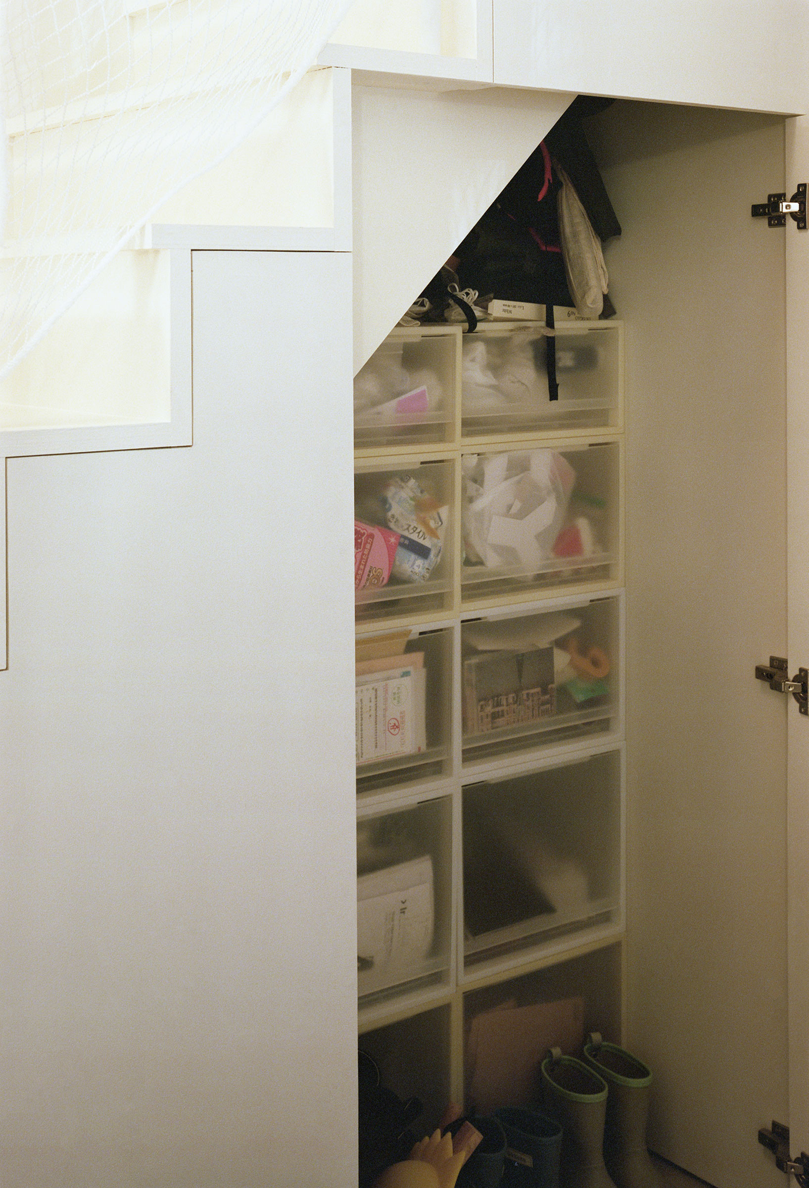 福田俊 / オフィススグルフクダによる、東京・東村山市の住宅「OVERLAP」。空間境界の“オーバーラップ”が生む関係を主題に計画。均質4分割の“単純な平面”ながら、全体を見通せず視線が奥へと流れ“奥行きを想像”させる構成を考案。確かにある“気配”が“現実を超える広がり”を生む1階、ホール、階段下の収納 photo©Yurika Kono