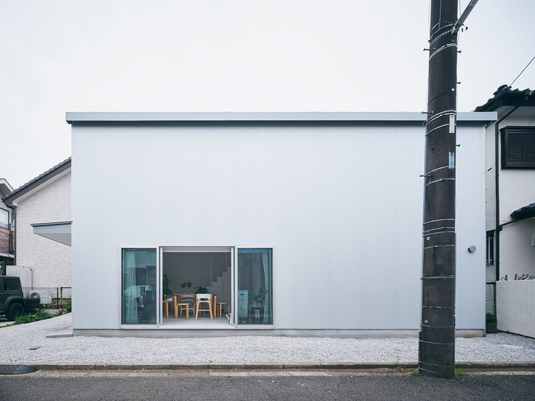 福田俊 / オフィススグルフクダによる、東京・東村山市の住宅「OVERLAP」。空間境界の“オーバーラップ”が生む関係を主題に計画。均質4分割の“単純な平面”ながら、全体を見通せず視線が奥へと流れ“奥行きを想像”させる構成を考案。確かにある“気配”が“現実を超える広がり”を生む外観、西側の道路より見る。 photo©千葉顕弥