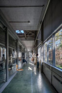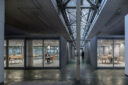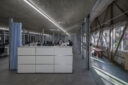 3列5つのフレームは外部の光を受け、床のタイルを照らしながら、新しい6面の窓は工場連続窓の風景を奥へ奥へと映して複雑で重層的なシークエンスを生み出している。既存の空間を様々な視点で読み込み、その要素を象徴的に取り扱うことで新旧を調和しながら相互に引き立て合う新しい美しさを生み出した。