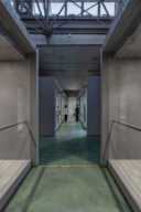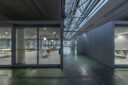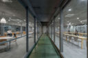 永冶建築研究所とdddessinによる、岐阜・多治見市の「アイコットリョーワ本社オフィス」。タイルメーカー本社での改修計画。ブランドイメージを体現する“普遍的な美しさ”を求め、“新旧の構造を調和”させる設計を志向。既存トラス梁などを生かして“3列5つのフレーム”を空間に挿入する構成を考案廊下 photo©ToLoLo studio 谷川ヒロシ