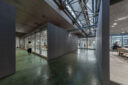 工場1階は主に製造ライン、2階は主に倉庫とオフィスである。2階倉庫はハイサイドライトが象徴的にトラスの軸線を照らし床には使用と補修の履歴が重なり既設の連続窓のガラスの光を鈍く反射していた。