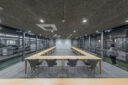 永冶建築研究所とdddessinによる、岐阜・多治見市の「アイコットリョーワ本社オフィス」。タイルメーカー本社での改修計画。ブランドイメージを体現する“普遍的な美しさ”を求め、“新旧の構造を調和”させる設計を志向。既存トラス梁などを生かして“3列5つのフレーム”を空間に挿入する構成を考案左:食堂、手前:ホール2、右:ミーティングルーム photo©ToLoLo studio 谷川ヒロシ