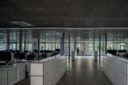 永冶建築研究所とdddessinによる、岐阜・多治見市の「アイコットリョーワ本社オフィス」。タイルメーカー本社での改修計画。ブランドイメージを体現する“普遍的な美しさ”を求め、“新旧の構造を調和”させる設計を志向。既存トラス梁などを生かして“3列5つのフレーム”を空間に挿入する構成を考案オフィス1側からホール2側を見る。 photo©ToLoLo studio 谷川ヒロシ