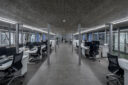タイルメーカー本社での改修計画です。建築家は、ブランドイメージを体現する“普遍的な美しさ”を求め、“新旧の構造を調和”させる設計を志向しました。そして、既存トラス梁などを生かして“3列5つのフレーム”を空間に挿入する構成を考案しました。