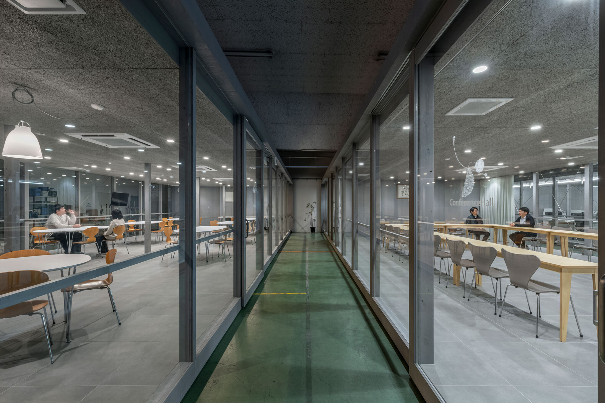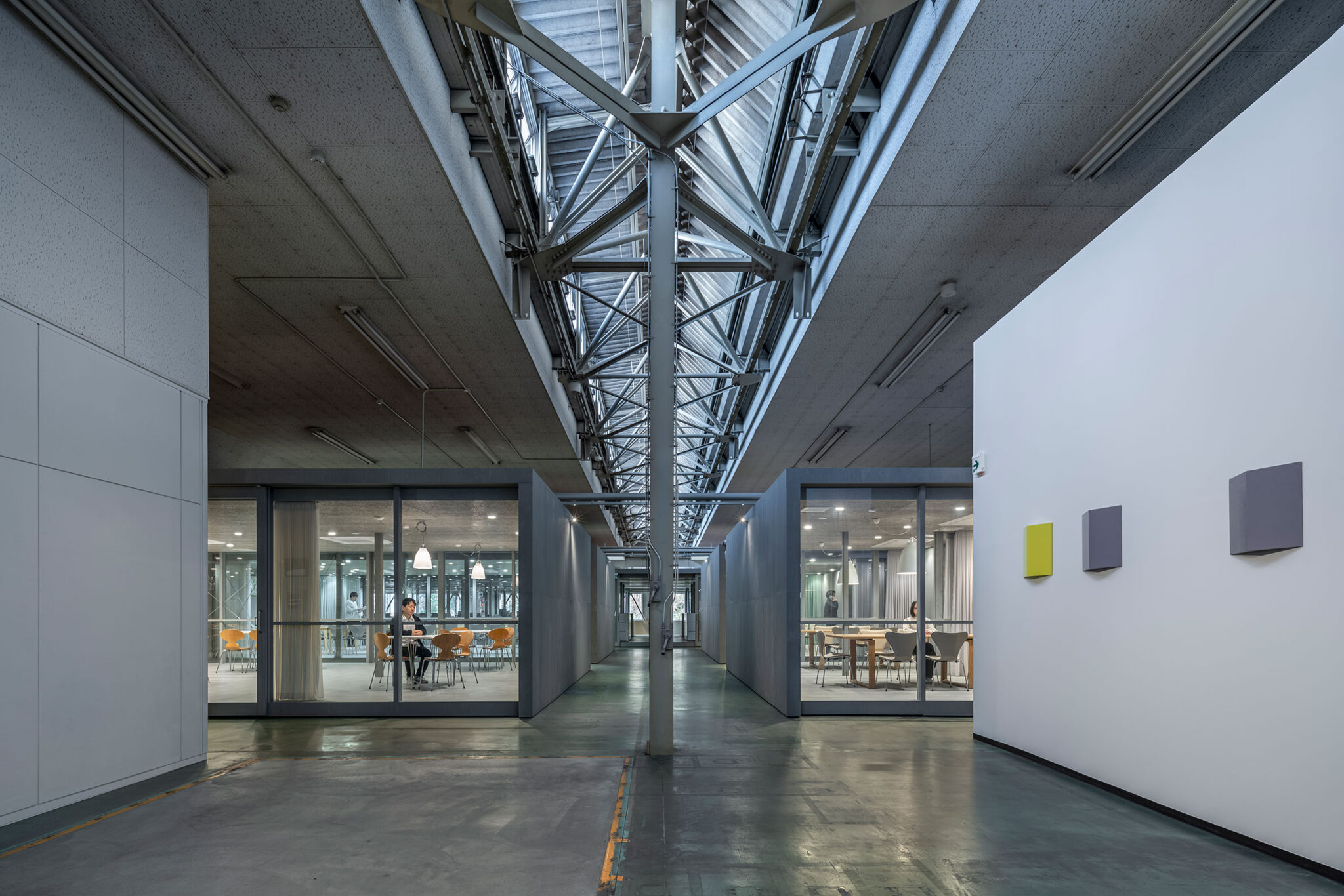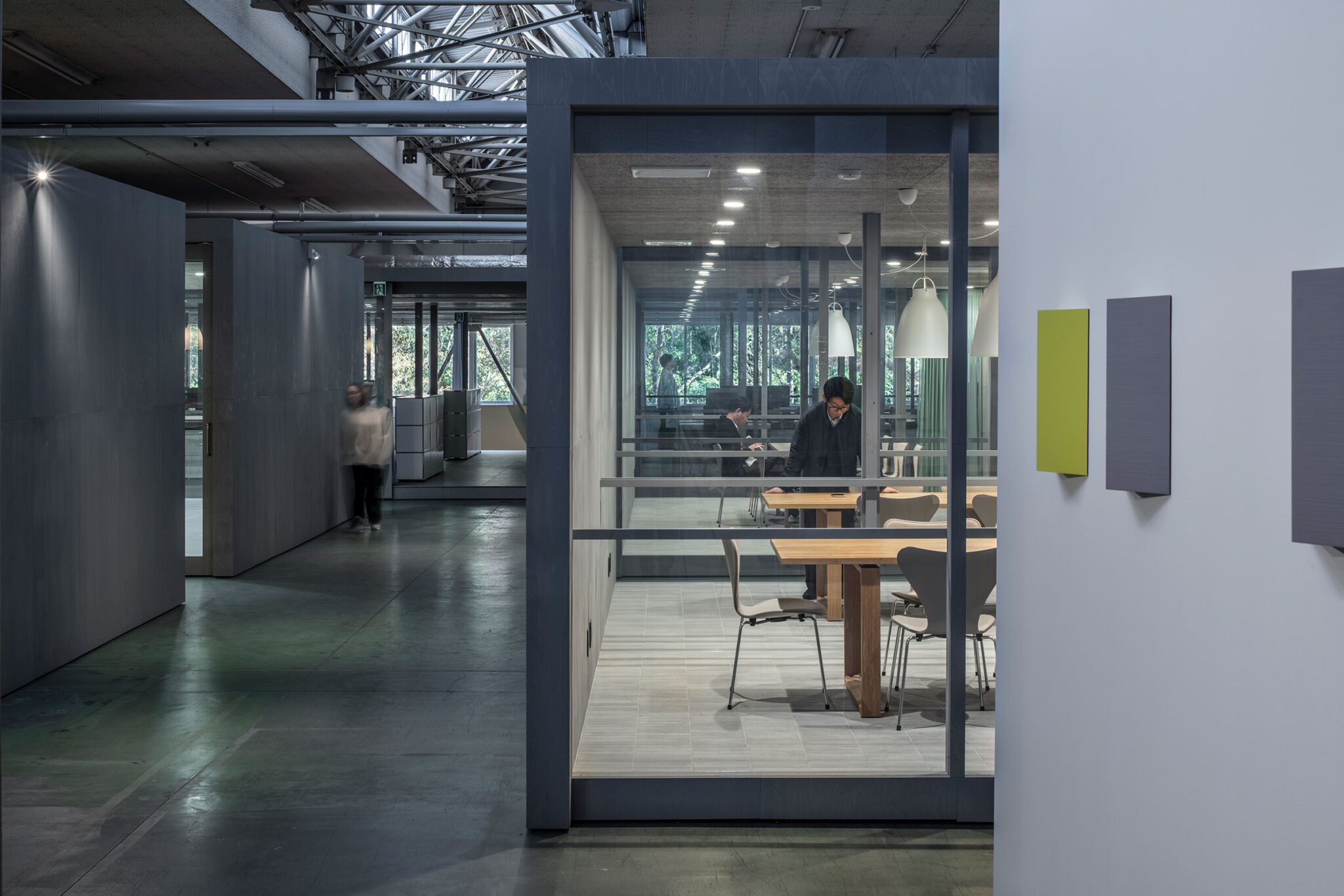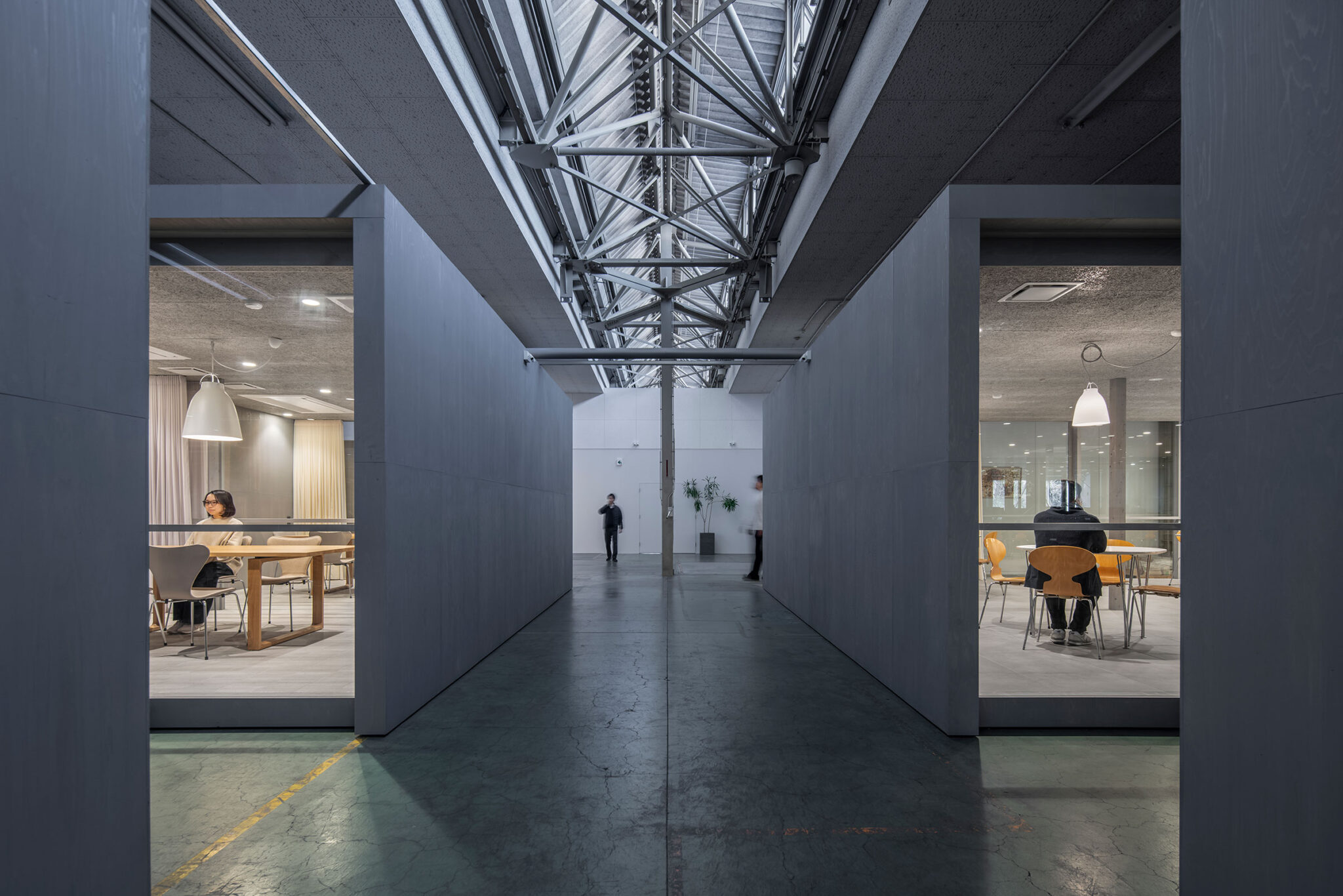 永冶建築研究所とdddessinによる、岐阜・多治見市の「アイコットリョーワ本社オフィス」。タイルメーカー本社での改修計画。ブランドイメージを体現する“普遍的な美しさ”を求め、“新旧の構造を調和”させる設計を志向。既存トラス梁などを生かして“3列5つのフレーム”を空間に挿入する構成を考案左:食堂、中央:廊下、右:会議室 photo©ToLoLo studio 谷川ヒロシ