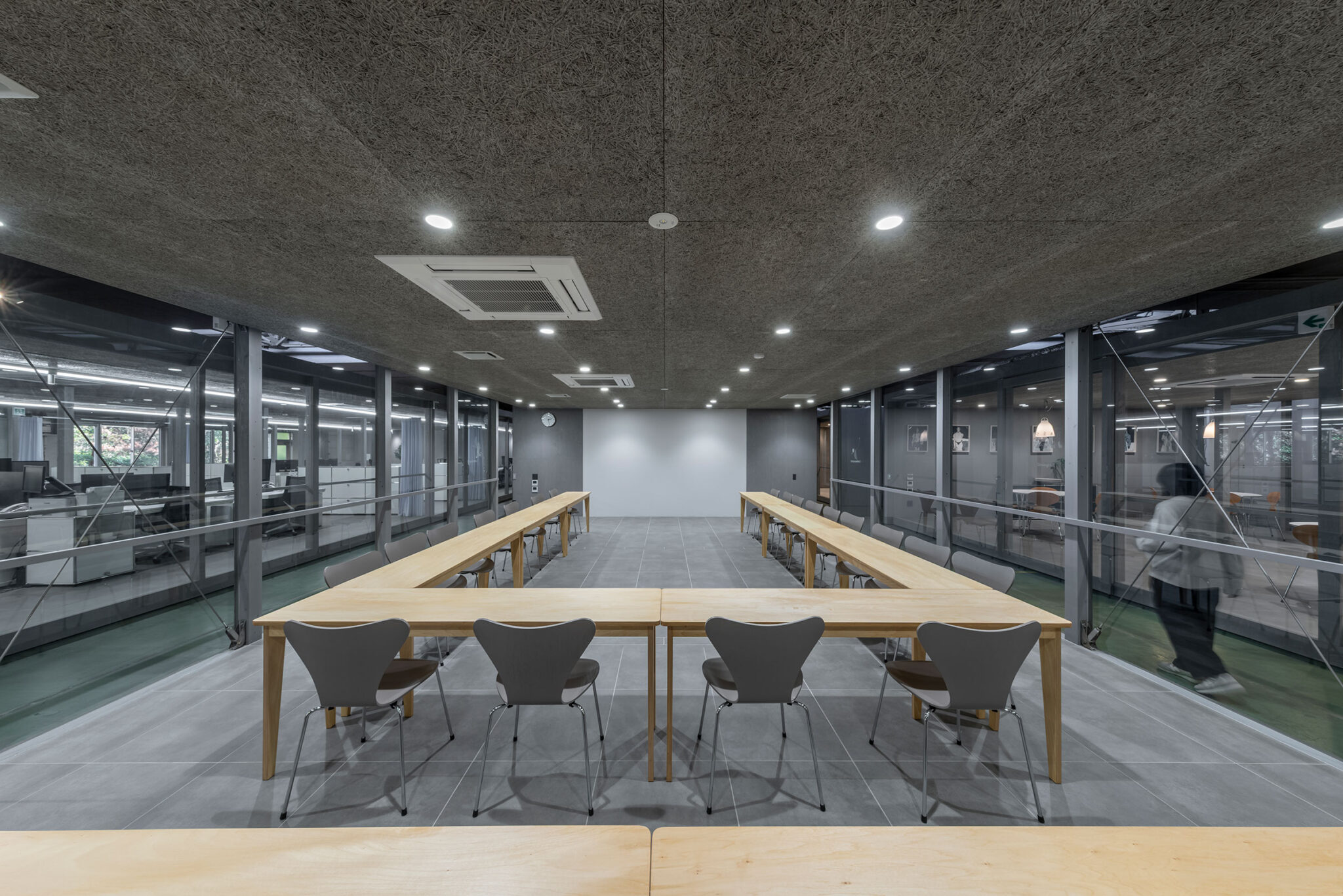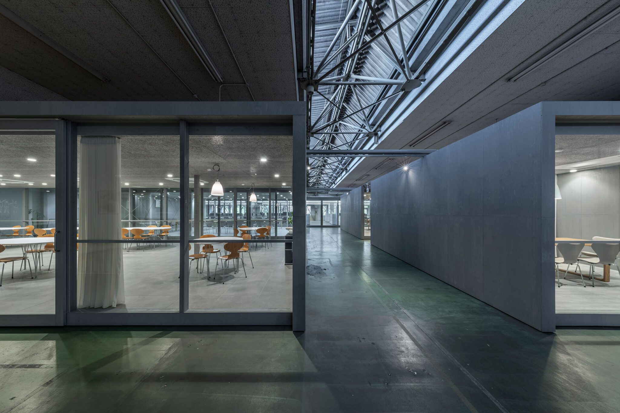 永冶建築研究所とdddessinによる、岐阜・多治見市の「アイコットリョーワ本社オフィス」。タイルメーカー本社での改修計画。ブランドイメージを体現する“普遍的な美しさ”を求め、“新旧の構造を調和”させる設計を志向。既存トラス梁などを生かして“3列5つのフレーム”を空間に挿入する構成を考案オフィス1側からホール2側を見る。 photo©ToLoLo studio 谷川ヒロシ