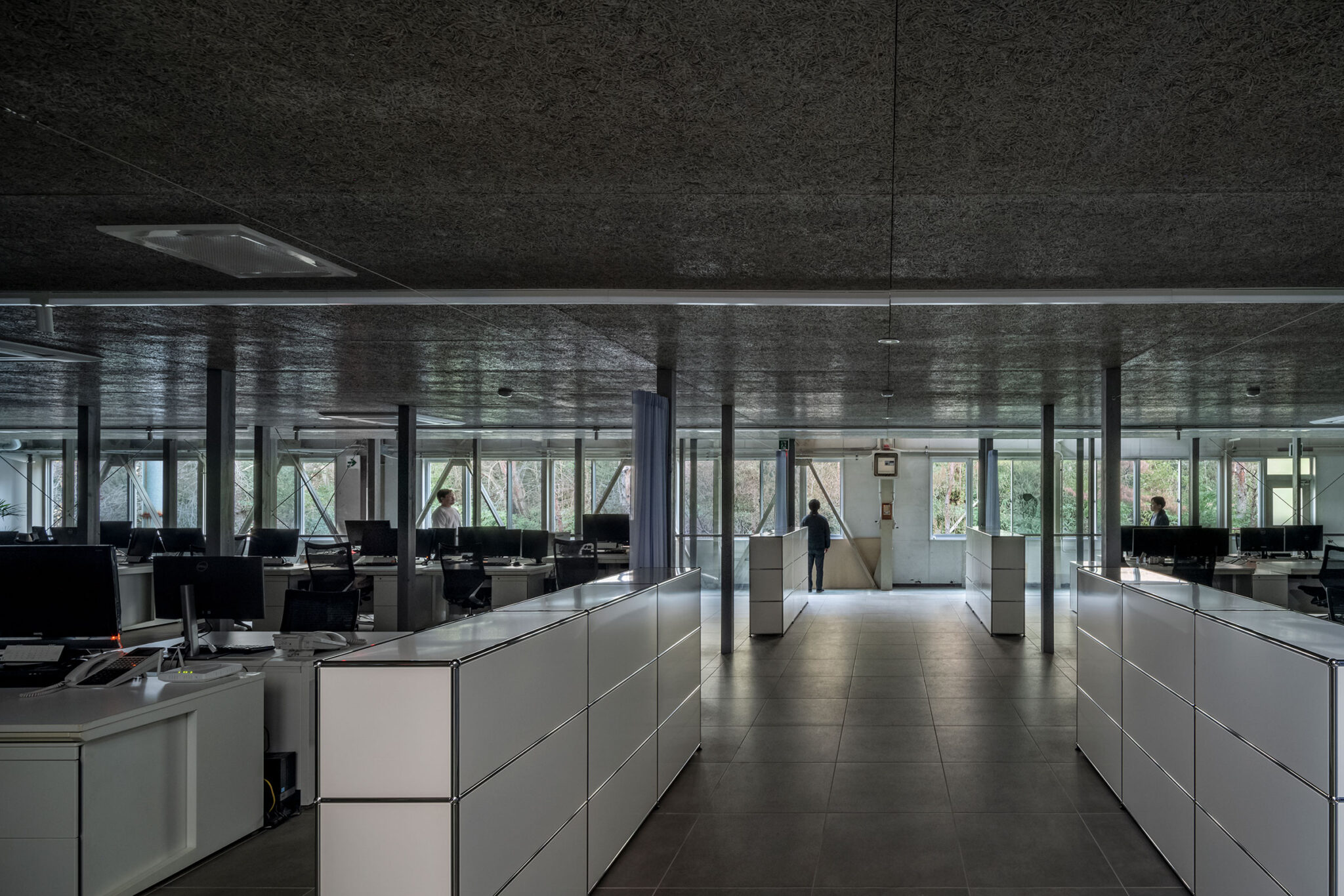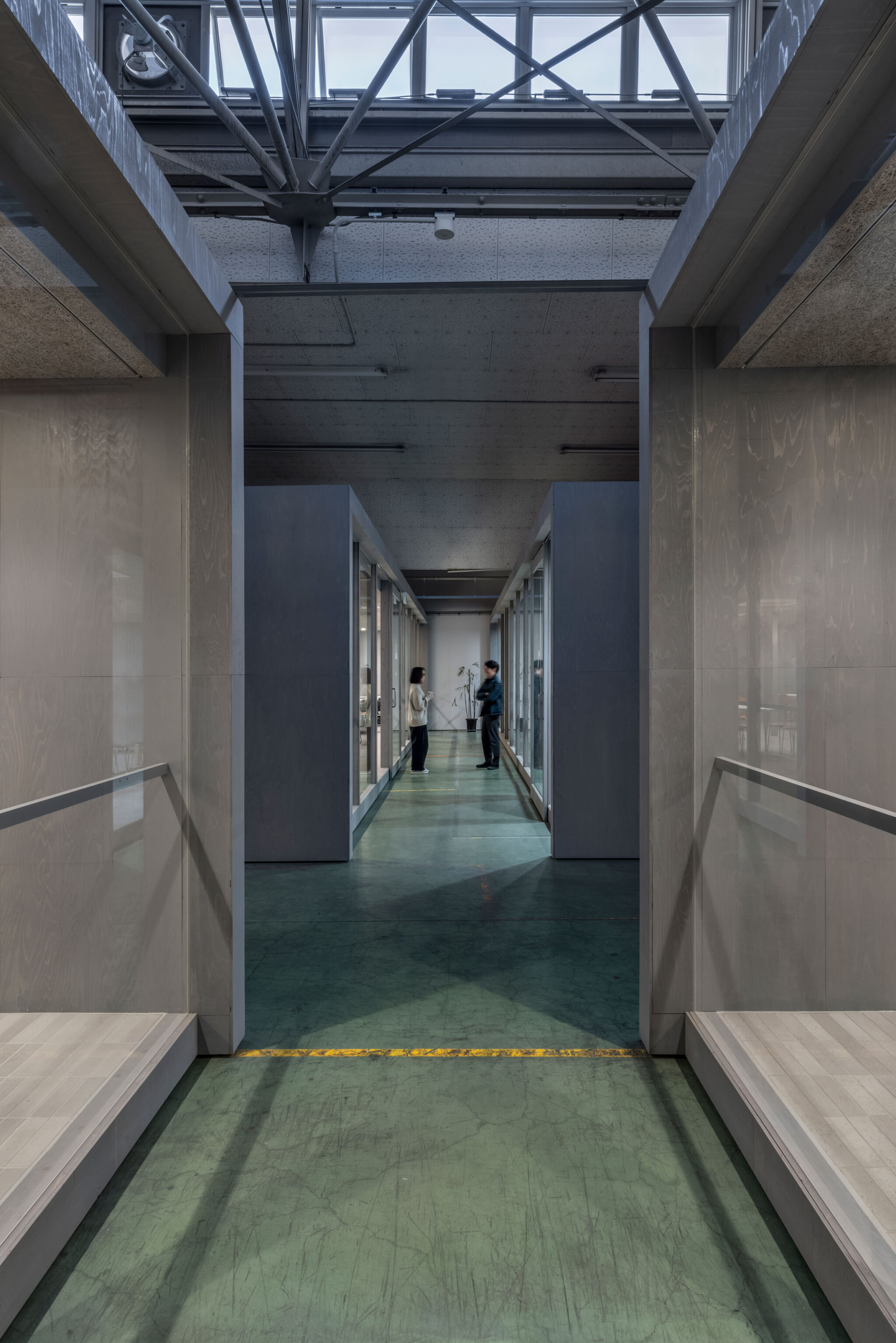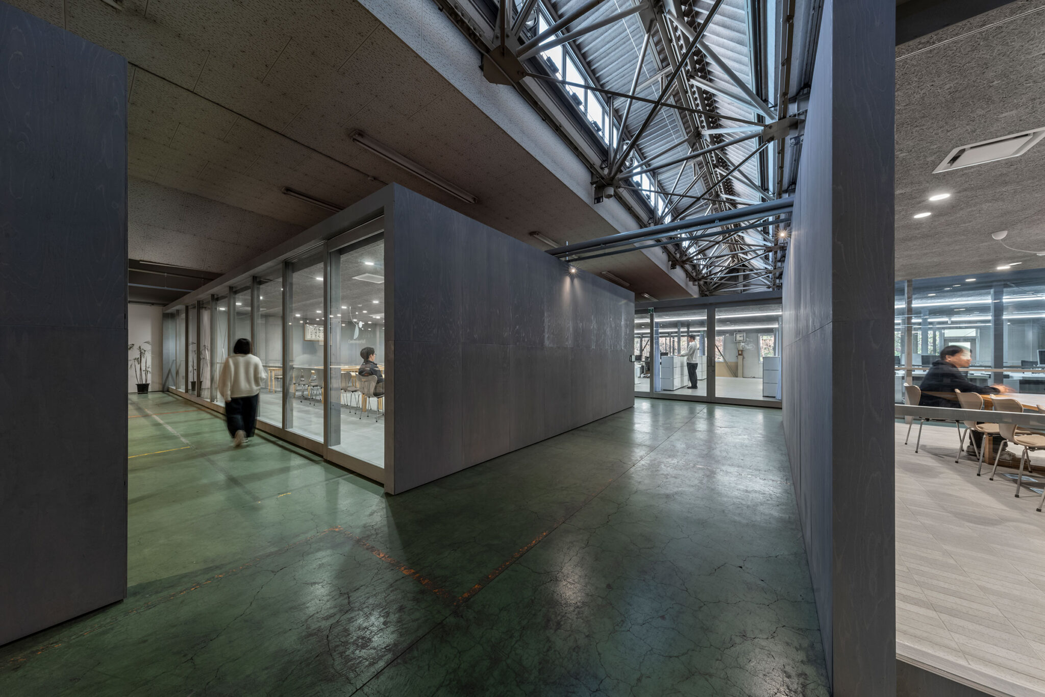 工場1階は主に製造ライン、2階は主に倉庫とオフィスである。2階倉庫はハイサイドライトが象徴的にトラスの軸線を照らし床には使用と補修の履歴が重なり既設の連続窓のガラスの光を鈍く反射していた。