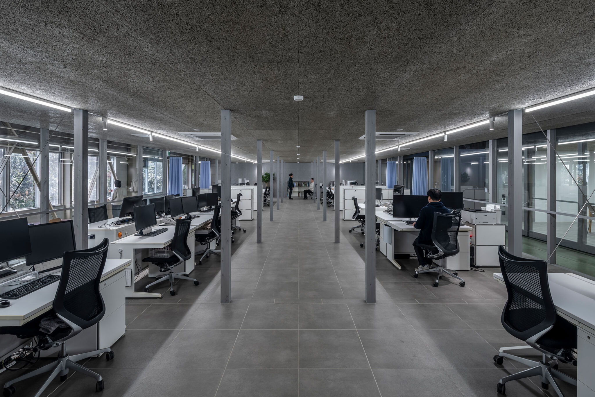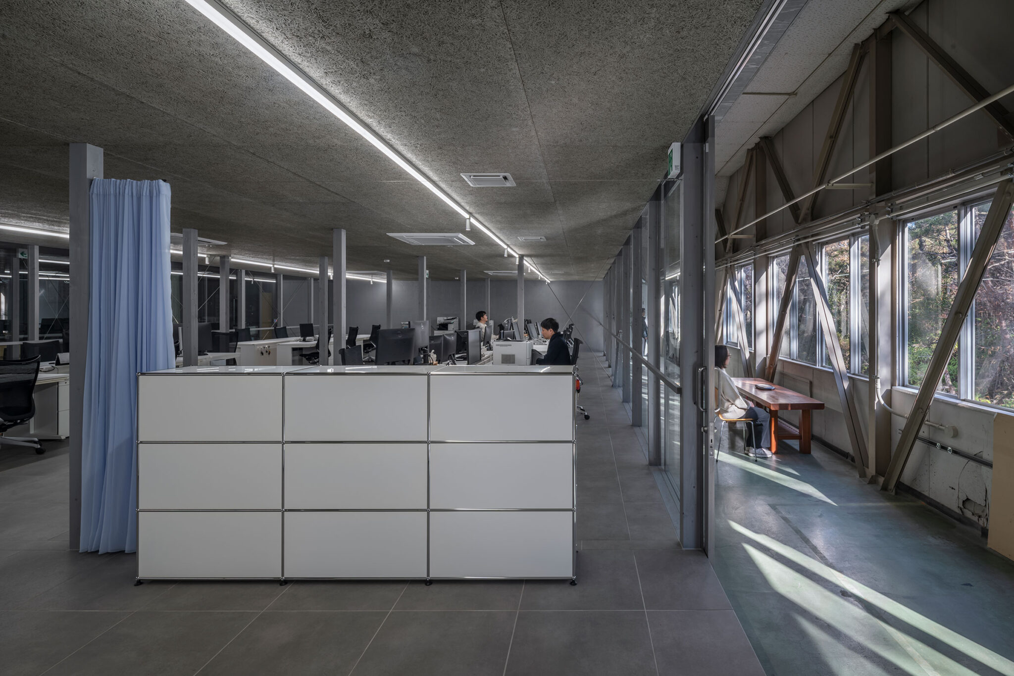 永冶建築研究所とdddessinによる、岐阜・多治見市の「アイコットリョーワ本社オフィス」。タイルメーカー本社での改修計画。ブランドイメージを体現する“普遍的な美しさ”を求め、“新旧の構造を調和”させる設計を志向。既存トラス梁などを生かして“3列5つのフレーム”を空間に挿入する構成を考案オフィス1 photo©ToLoLo studio 谷川ヒロシ