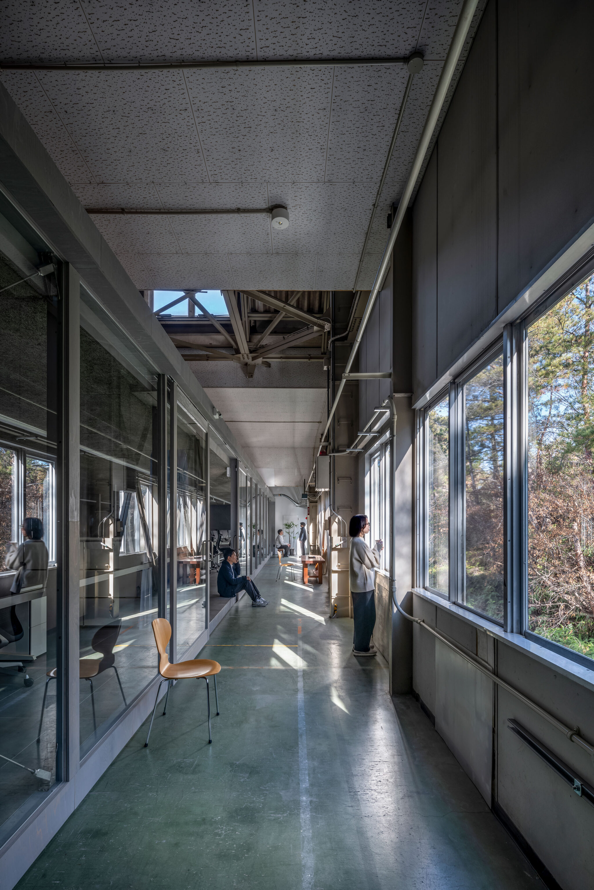 永冶建築研究所とdddessinによる、岐阜・多治見市の「アイコットリョーワ本社オフィス」。タイルメーカー本社での改修計画。ブランドイメージを体現する“普遍的な美しさ”を求め、“新旧の構造を調和”させる設計を志向。既存トラス梁などを生かして“3列5つのフレーム”を空間に挿入する構成を考案廊下 photo©ToLoLo studio 谷川ヒロシ