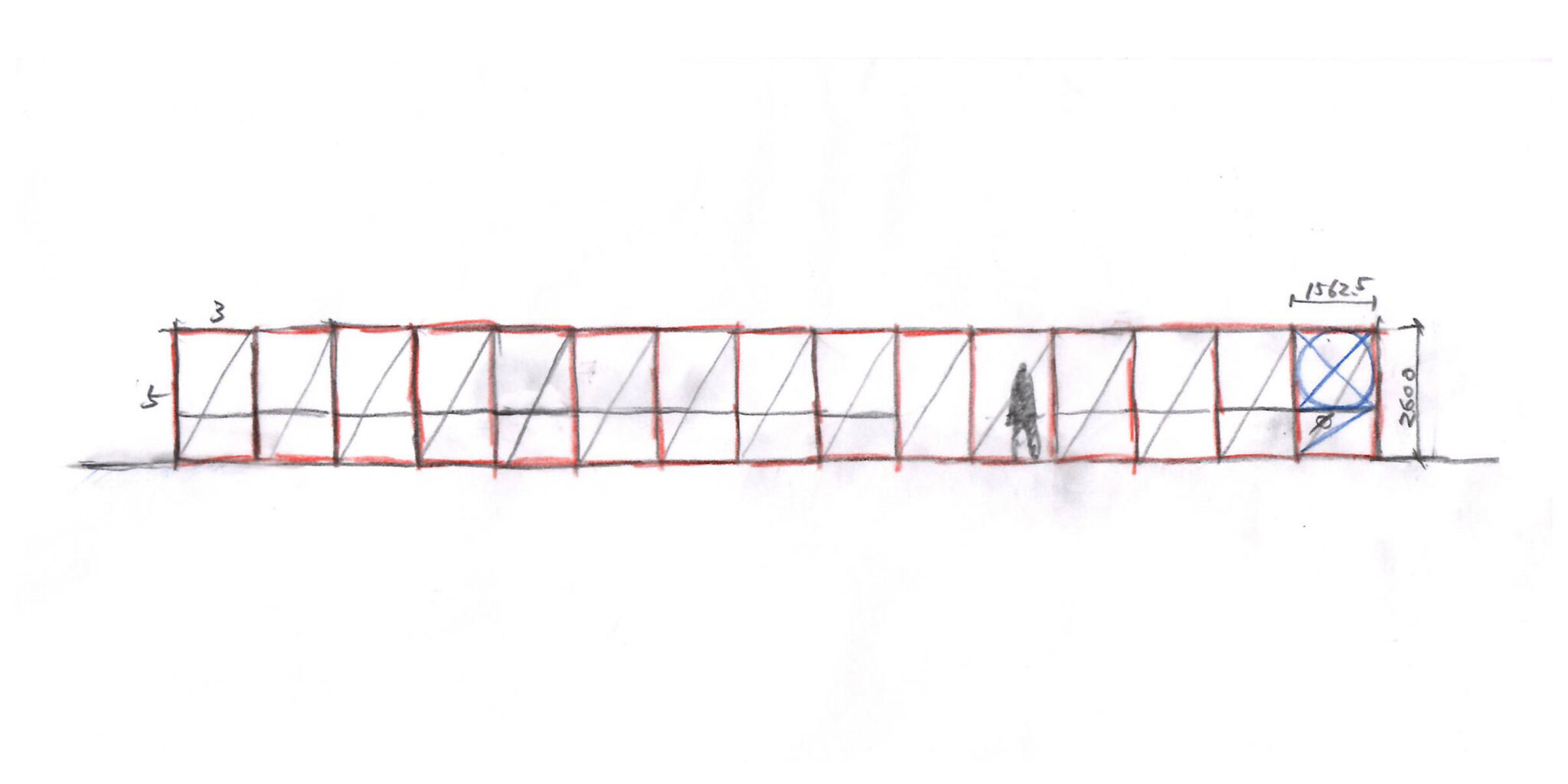 永冶建築研究所とdddessinによる、岐阜・多治見市の「アイコットリョーワ本社オフィス」。タイルメーカー本社での改修計画。ブランドイメージを体現する“普遍的な美しさ”を求め、“新旧の構造を調和”させる設計を志向。既存トラス梁などを生かして“3列5つのフレーム”を空間に挿入する構成を考案縦横糸コンセプトスケッチ image©永冶建築研究所とdddessin