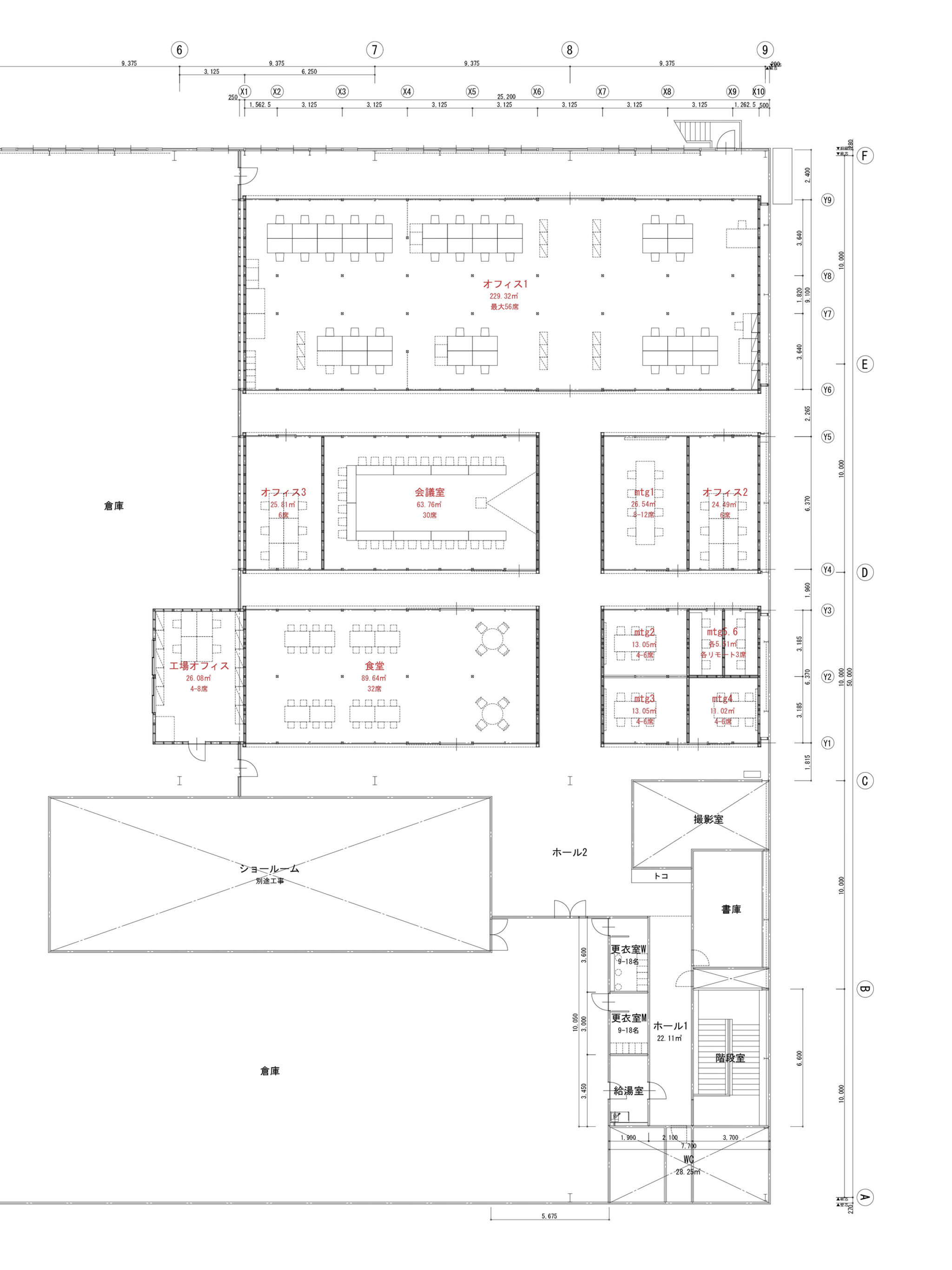 営業に差し支えない最大の面積を新オフィスに充て、環境のよい窓辺エリアをオフィス、奥側の空間を共用室とし、工場連続窓に対し3列5つのフレームを配置した。フレームに工事範囲を絞ることで建設費・ランニングコストを低減した。