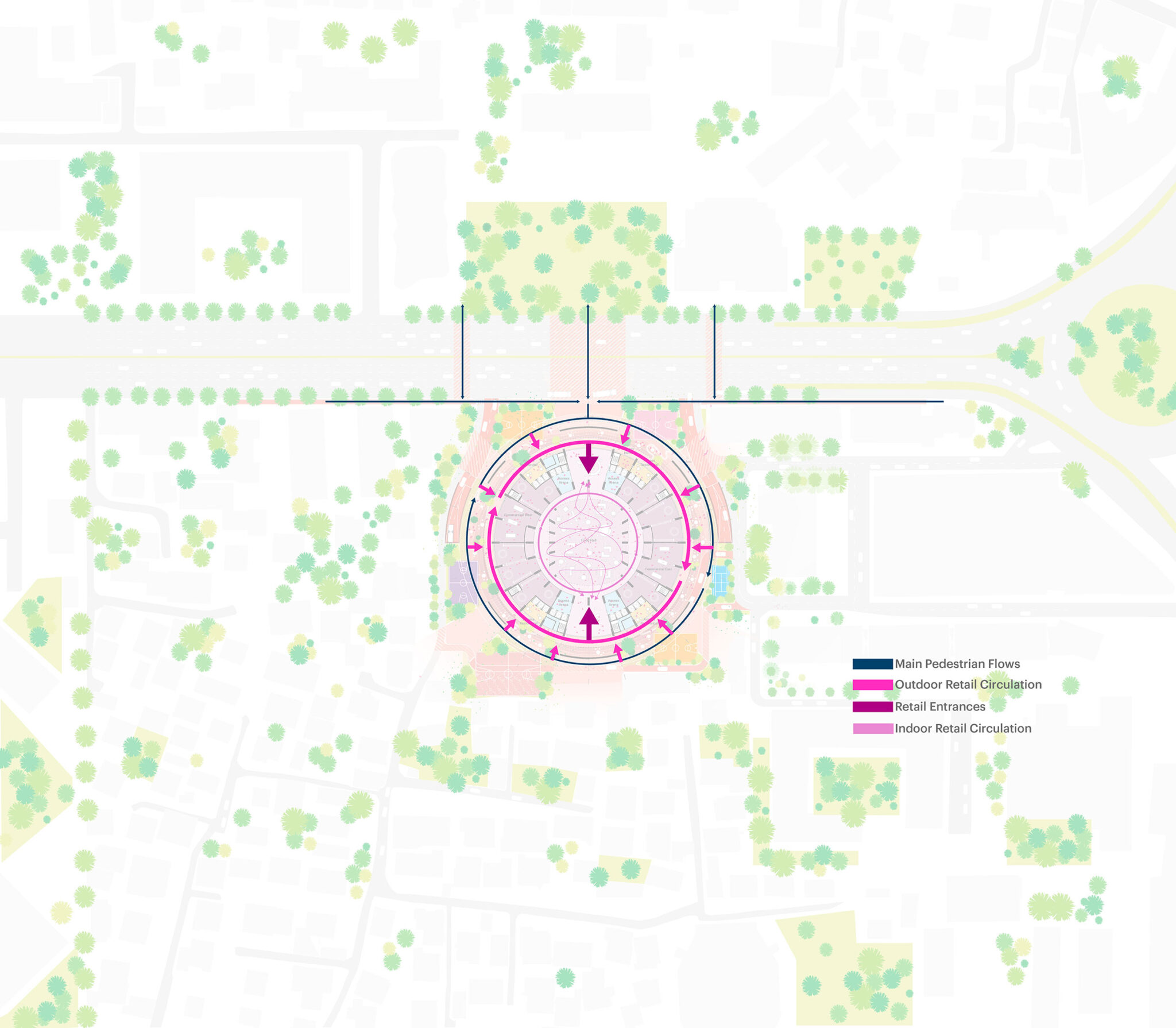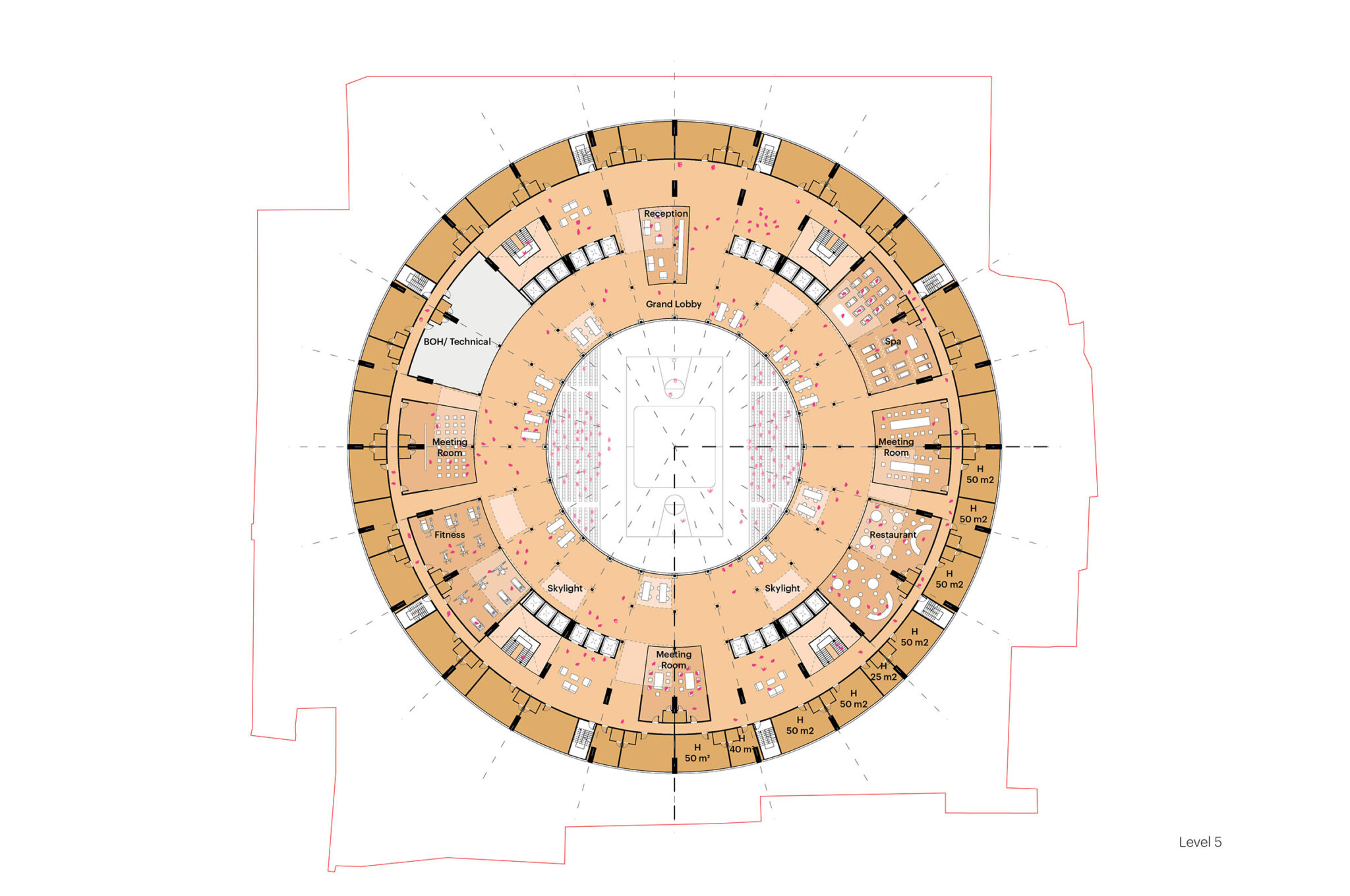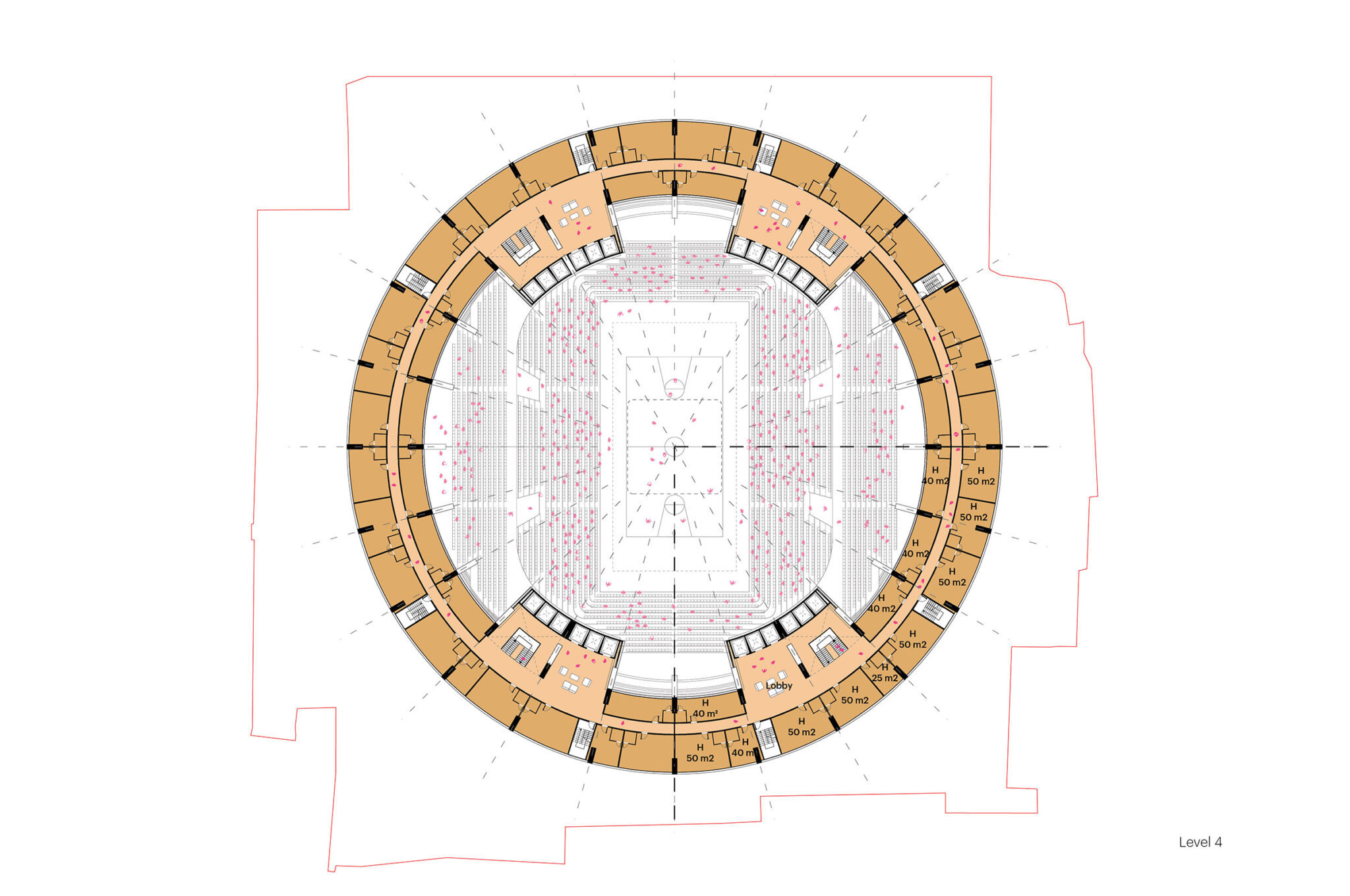 The apartments in the sphere’s shell comprise a mixture of outward-facing units and a portion of dual aspect units, which offer spectacular views not only of the city but also of the interior dome, courtyard garden, and a glimpse into the arena through the oculus. As the sphere tapers in at the top, large terraces are created for residents. The external walls of the apartments are set back within the sphere’s shell, ensuring that the apartment interiors are shaded from the sun by the floor above, while accentuating the size of these terraces. The very top of the dome mostly hosts duplex penthouses, each with access to a private rooftop terrace, while one quarter of this upper ring hosts a double-height hotel skybar, with views over the city. A second oculus, that can be closed with glass and opened for ventilation, completes the sphere.