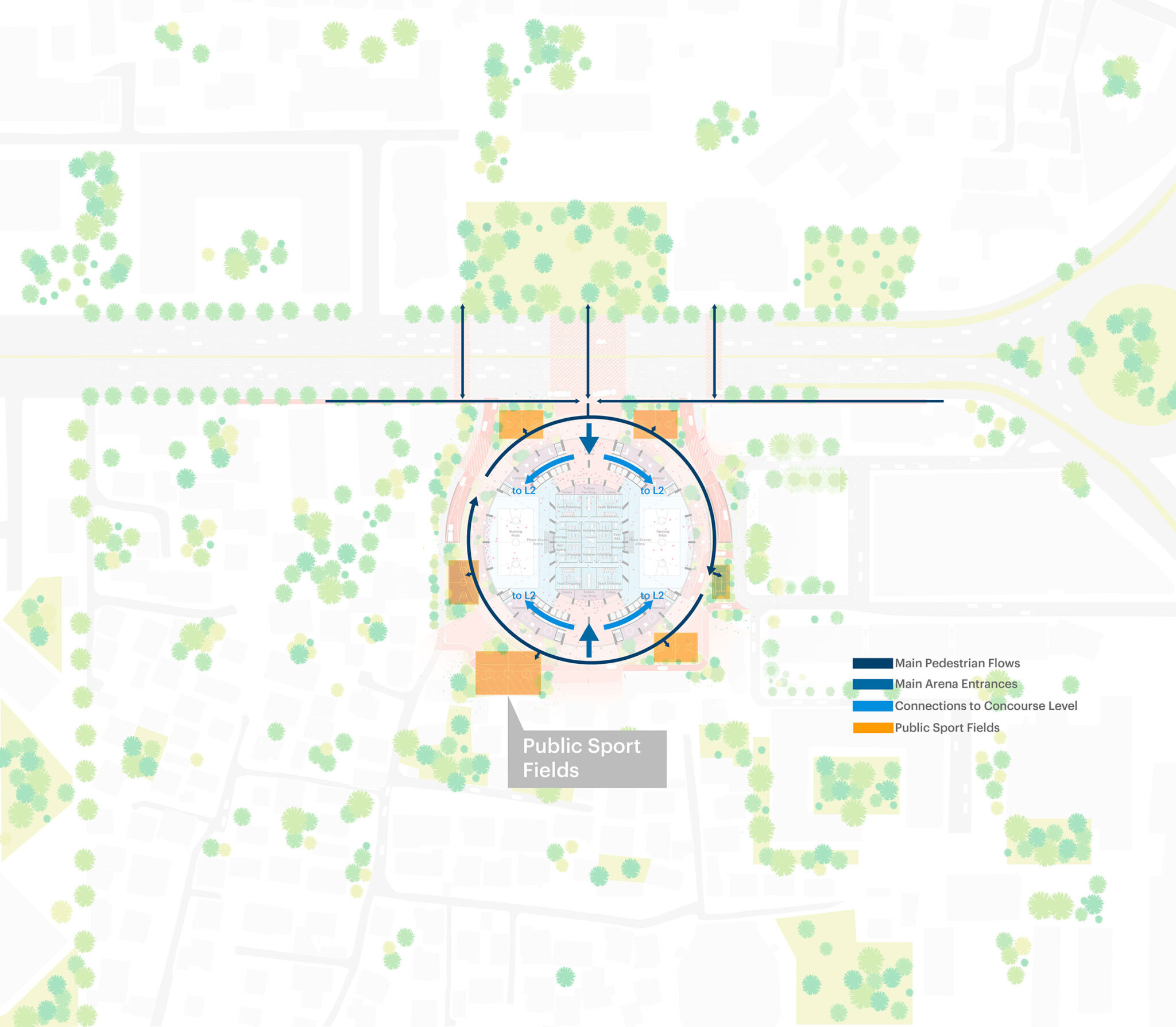 Size and Programme: 90,200 m2 sports arena and associated facilities, housing, hotel, retail, parking