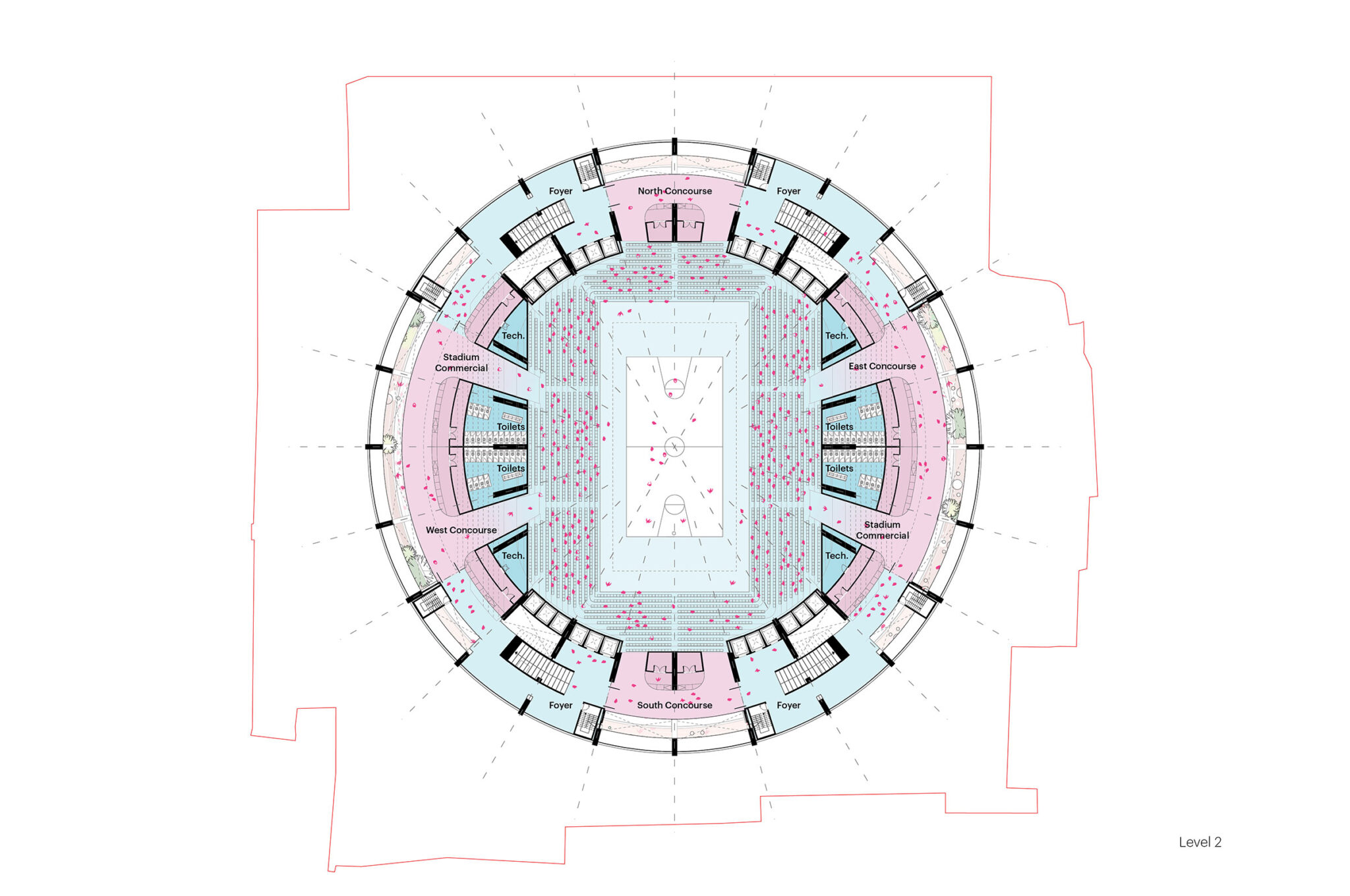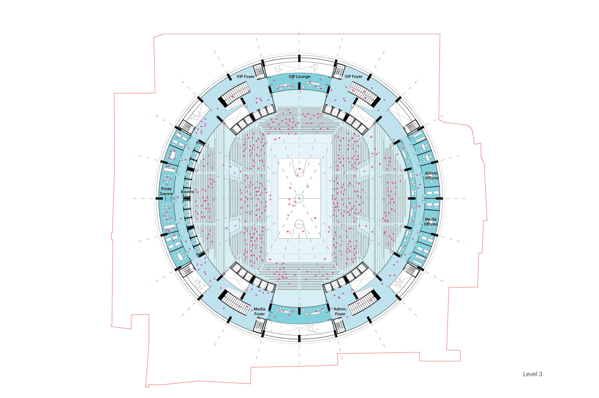 建物の機能は層状に配置されています。球体が地面と接する部分では、地面にくぼみを作り出し、階段や観覧席のある地下階を形成します。これらは、下方に続き、アリーナのイベントを支える小売店、カフェ、各種設備が環状に配置されたエリアへとつながっています。その上にはアリーナ本体があり、地上レベルの短い橋を渡ってアクセスします。主会場の両側には、スタンドの下に隠された2つの追加の練習コートが配置されています。その上の2フロアにはホテルが入っています。この構成によってホテルには独自の特徴が与えられ、宿泊客は下層階の客室の窓から試合を観戦できるほか、上層階のアメニティスペースからも観戦できます。上層階のスペースはスタンドの上に張り出しており、アリーナの天井に天窓を作り出しています。