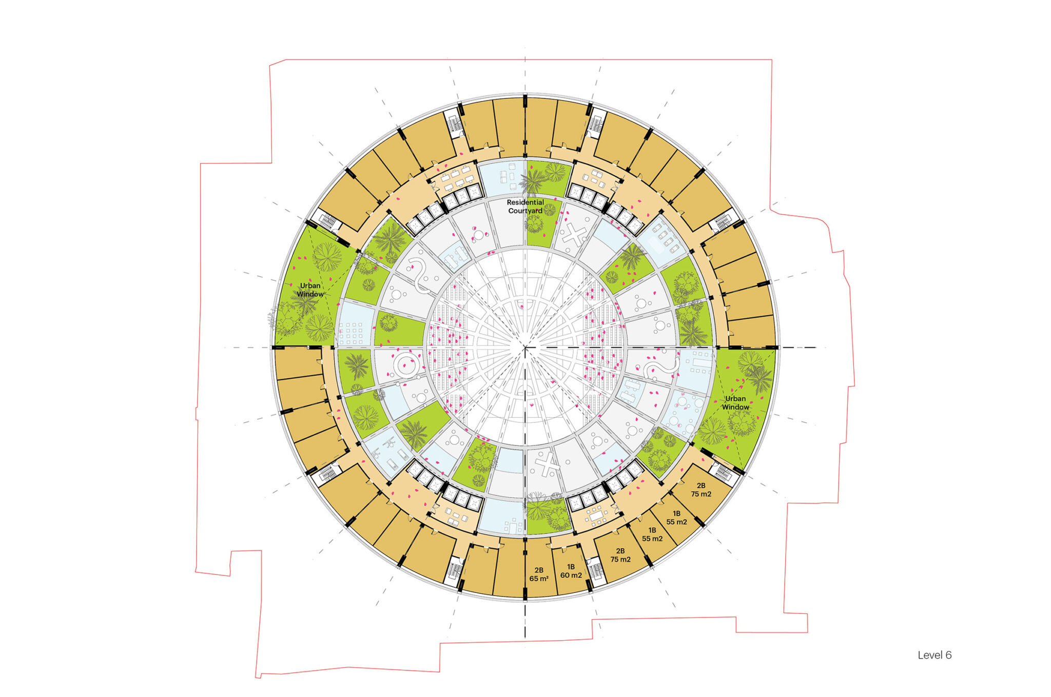 天窓は厚いガラス層で閉じることが可能で、それによって防音の障壁を形成しつつ、上下の空間の視覚的なつながりを保つことができます。この階の上には、球体の二重殻構造の中にアパートメントが配置されており、その内部には巨大な半屋外のドーム状空間が形成されています。これは、椀型のアリーナをほぼ鏡のように反映したものです。この空間は居住者のための中庭の庭園となり、成長した樹木やくつろぎのための家具が設けられています。アパートメントのドームはところどころで建物の外殻に開けられた3~4層の長方形の開口部に姿を変え、自然換気を可能にするとともに、それぞれ異なるテーマを持つ住民のための追加の共有型緑地を生み出しています。