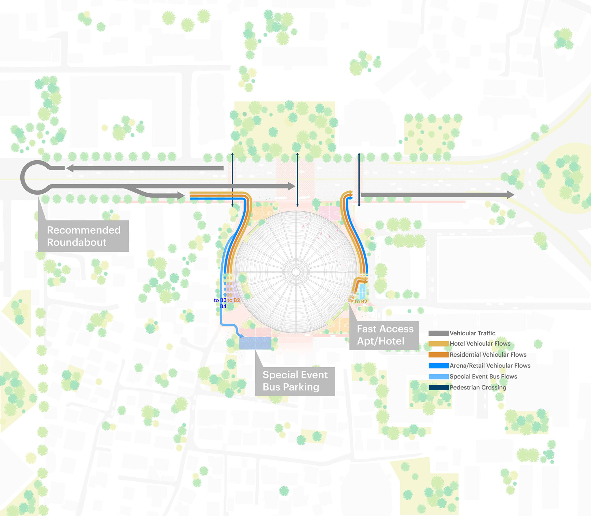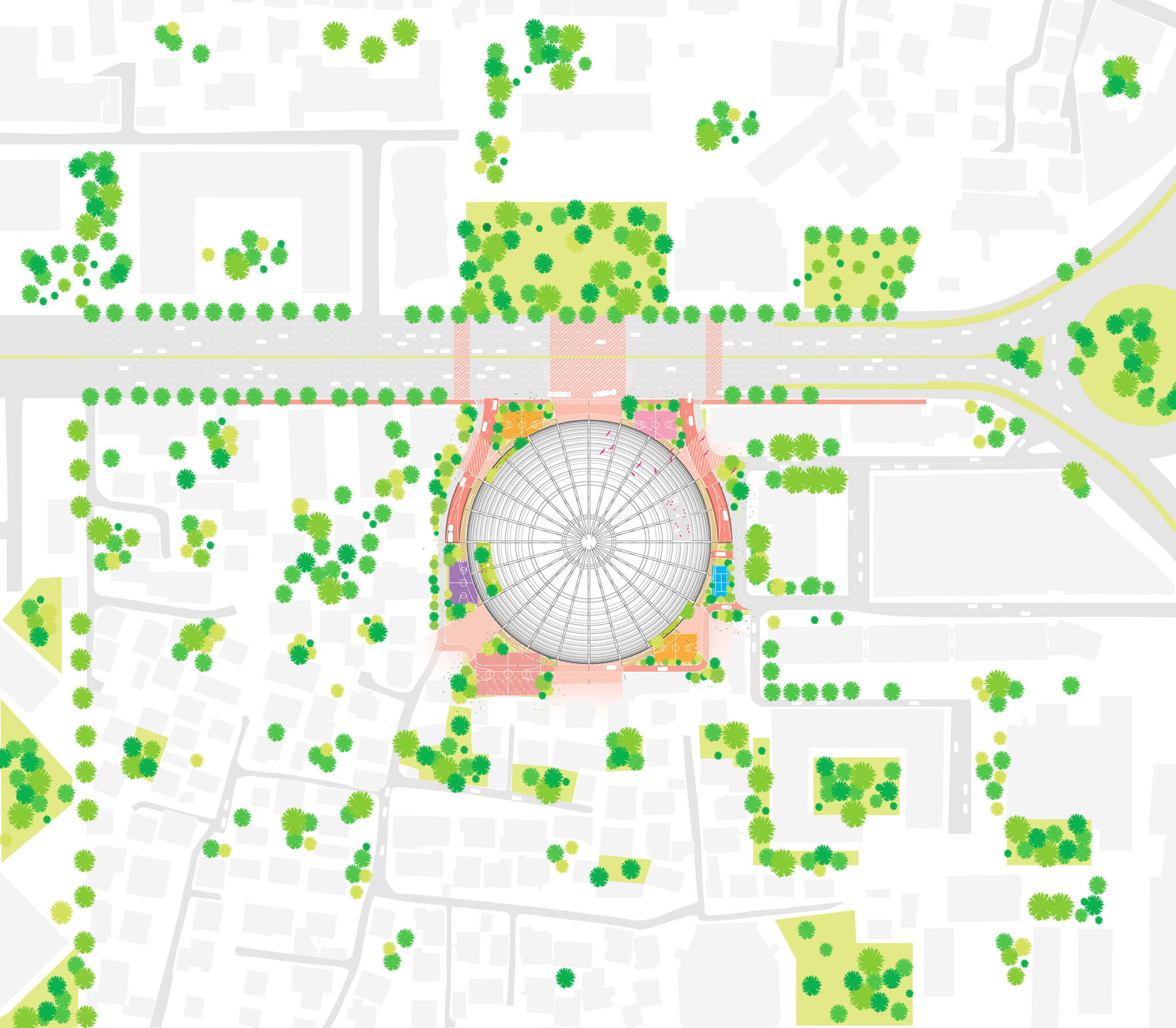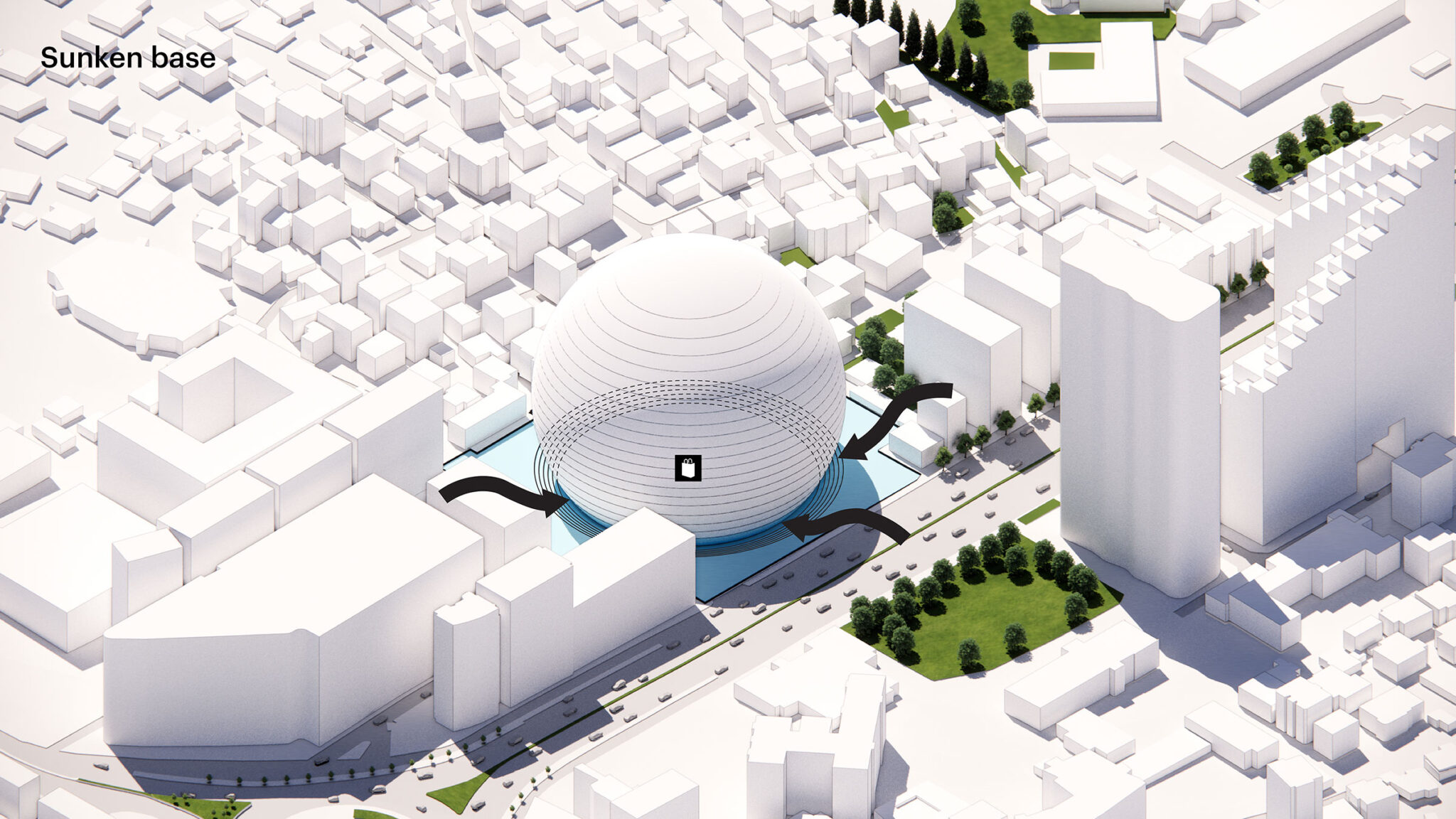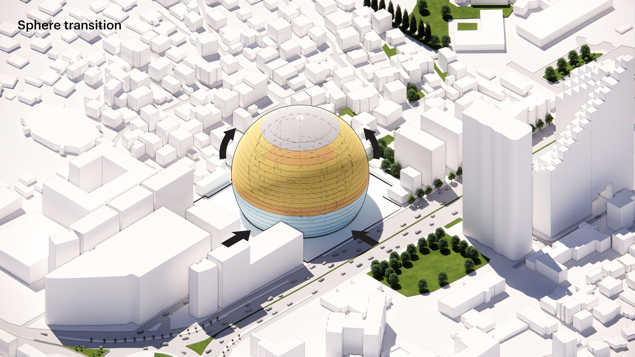 六千席のアリーナに加えて集合住宅・ホテル・店舗も内包する複合施設の計画です。建築家は、“スポーツとコミュニティの神殿”も意図し、“直径100mを超える球体”の建築を考案しました。そして、内部にアリーナと庭園を設けて外殻に住戸等を配しました。