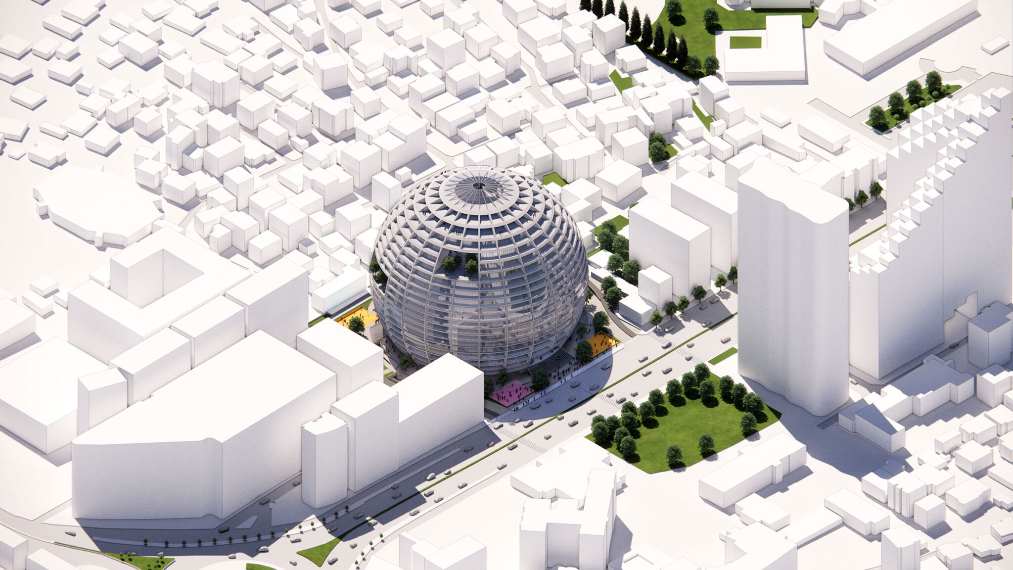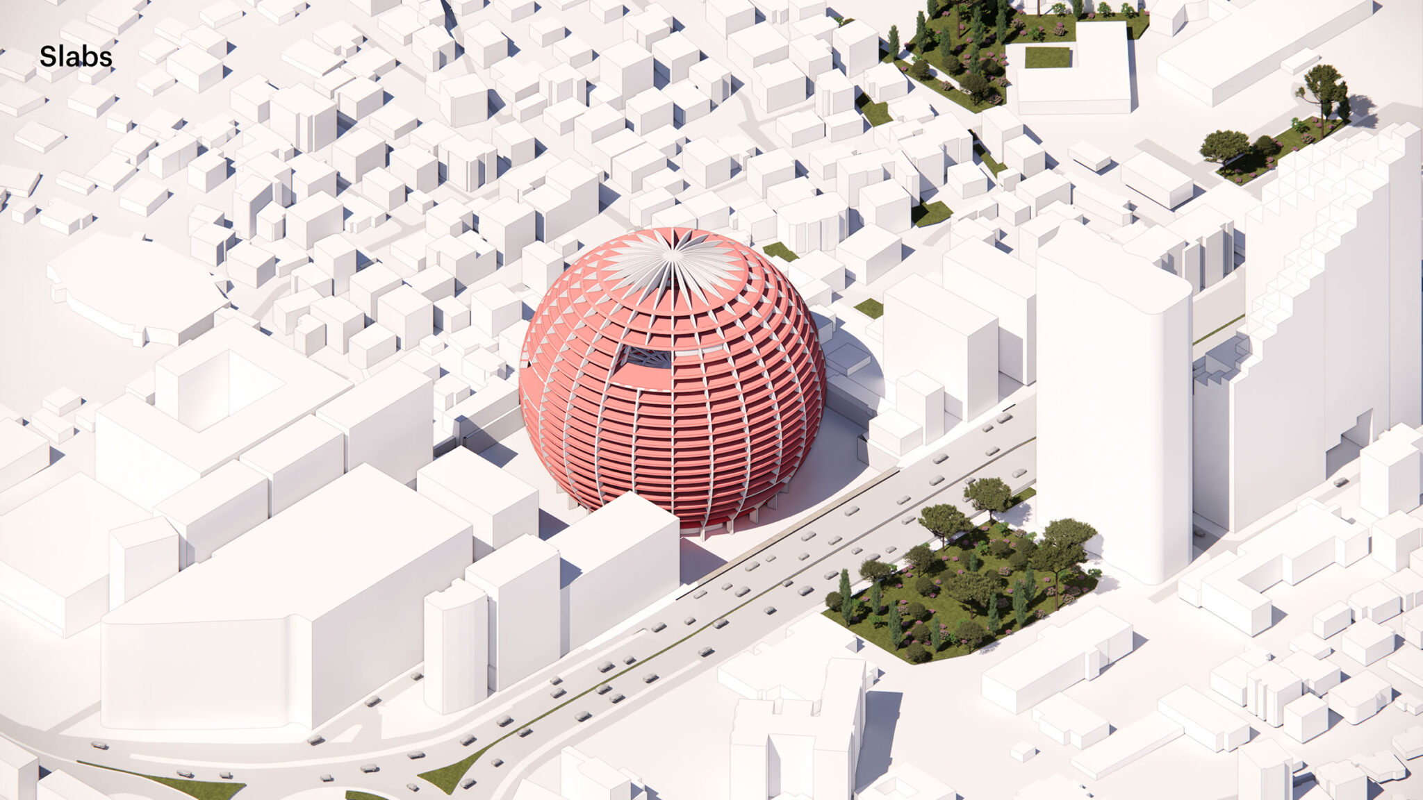 SHARE MVRDVによる、アルバニアの「グランド・ボールルーム」。六千席のアリーナに加えて集合住宅・ホテル・店舗も内包する複合施設。“スポーツとコミュニティの神殿”も意図し、“直径100mを超える球体”の建築を考案。内部にアリーナと庭園を設けて外殻に住戸等を配する