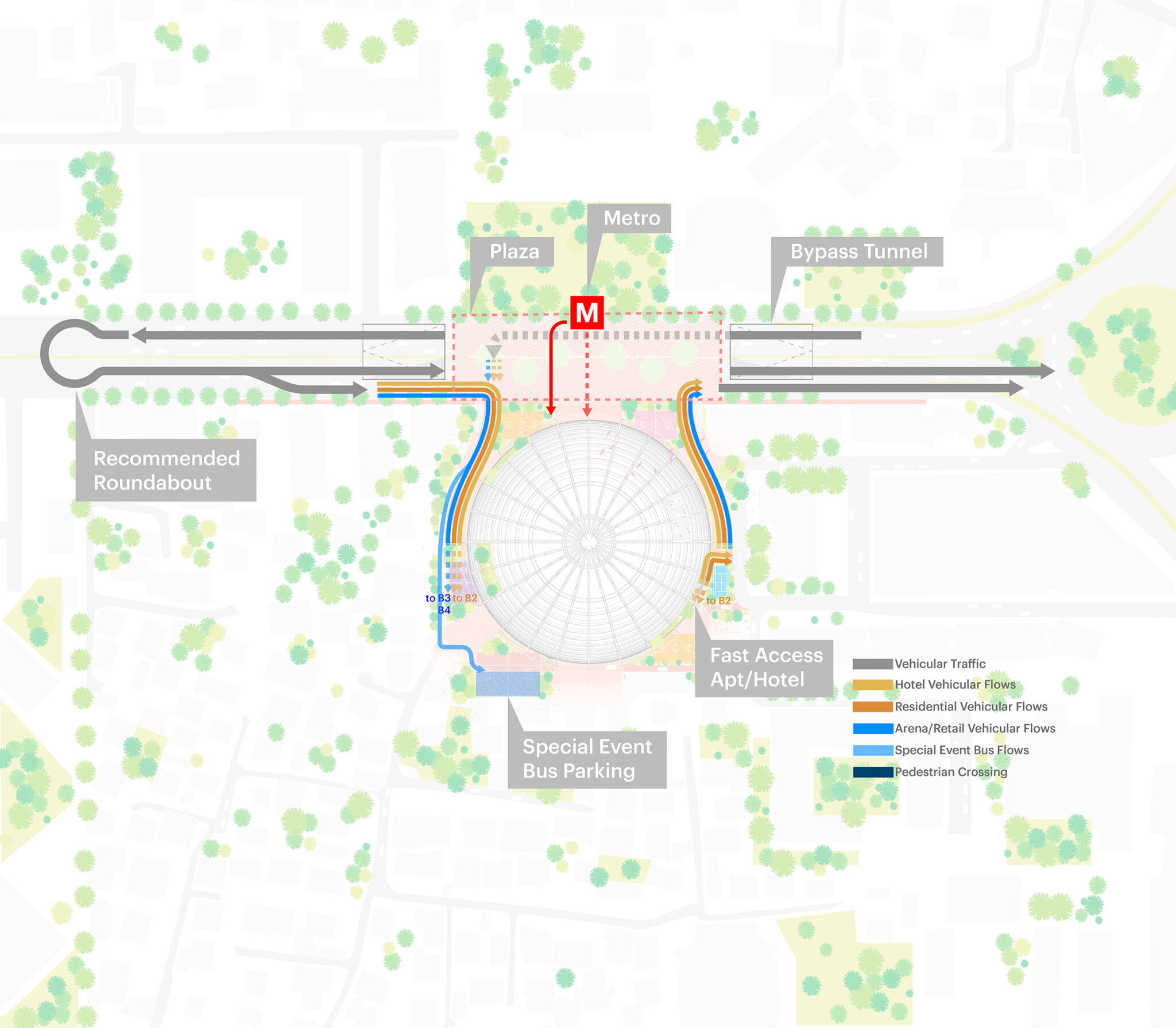 The competition entry was produced with a consortium comprising Trema Tech shpk, Likado BV, Albanian Capital Group shpk, and BCN Investments BV. The design’s distinctive feature, its spherical shape, accomplishes much more than simply creating an iconic structure alongside the road connecting the airport to the city centre. By stacking the hotel and residential functions on top of the arena itself, the design accommodates a significant amount of programme on a relatively small site. By making the building rounded, it avoids creating any “rear” facades that neglect the surrounding neighbourhood. By tapering inwards towards the building’s base, it creates more space for public plazas and outdoor sports facilities that can be used by local children. And by tapering inward at the top, it creates terraces for the building’s residents.
