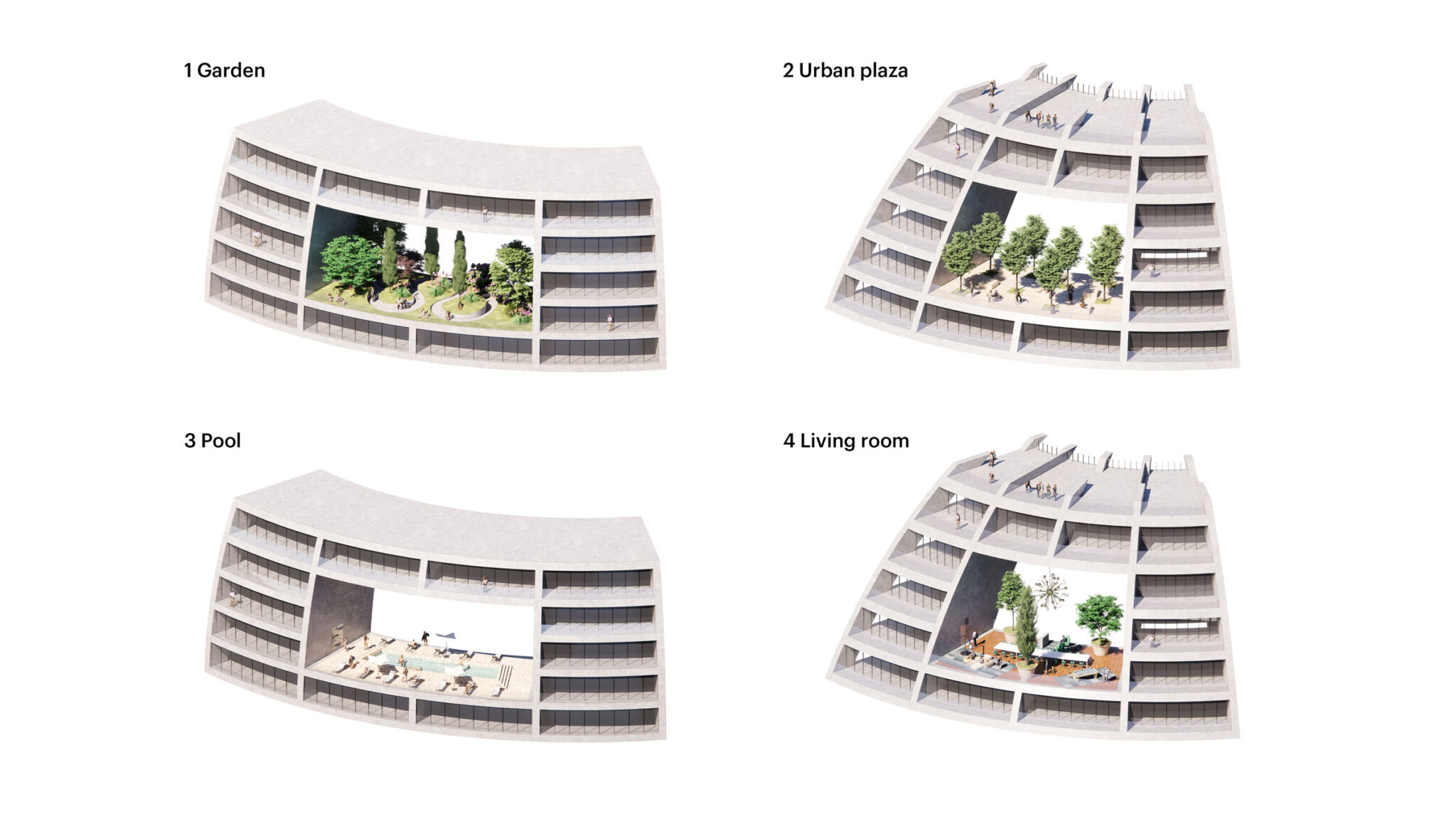 The oculus could be closed with a thick layer of glass to form a soundproof barrier while maintaining a visual connection between the upper and lower volumes. Above this level, apartments are contained within the sphere’s double-shell structure, forming a colossal semi-outdoor domed space on the interior – almost a mirror of the bowl-shaped arena. This space becomes a courtyard garden for residents, with mature trees and furniture for relaxing. In a number of places, the dome of apartments gives way to three- and four-storey rectangular holes punched through the building’s shell, allowing natural ventilation and creating additional communal green spaces for residences, each with its own theme.