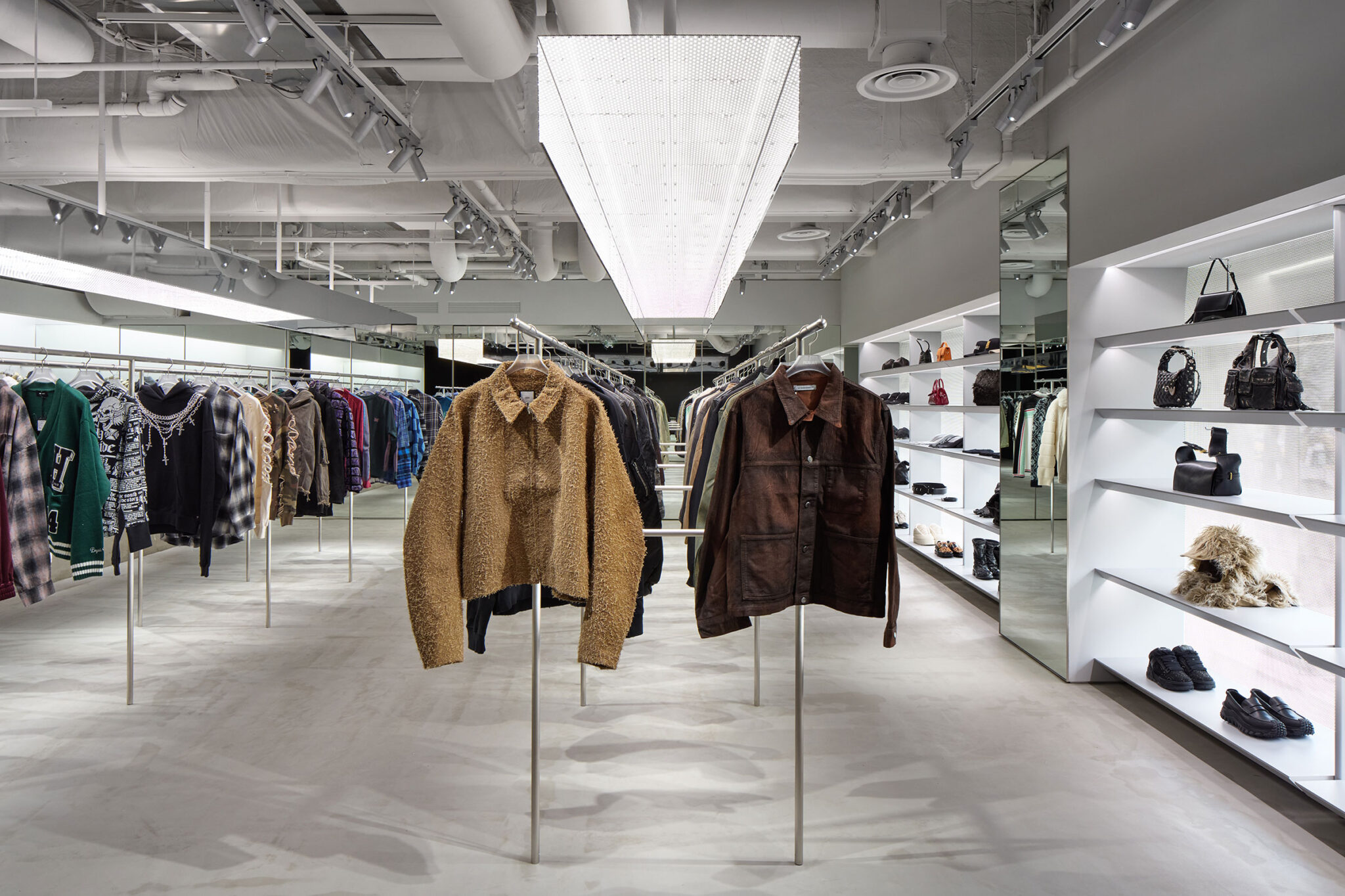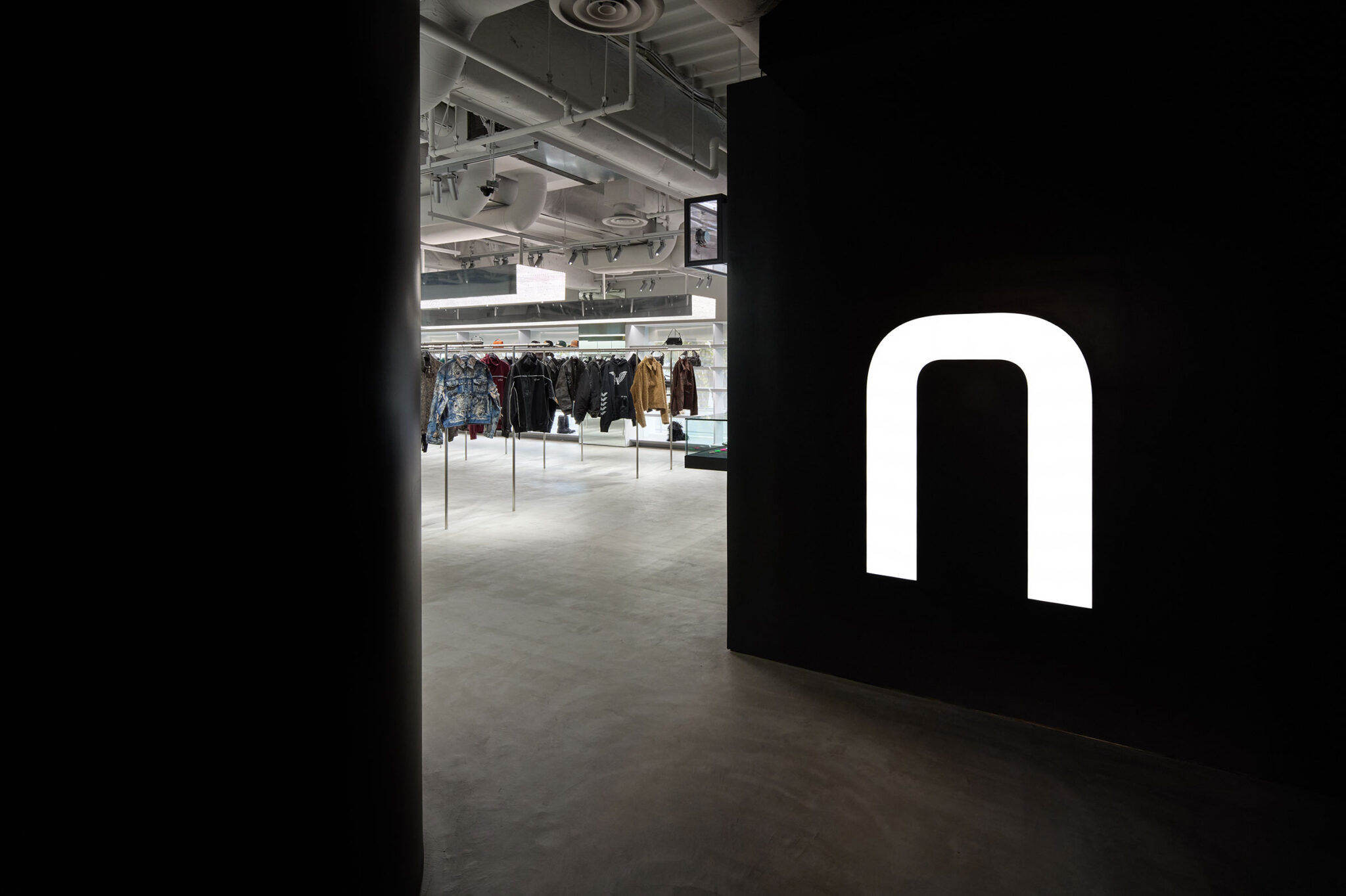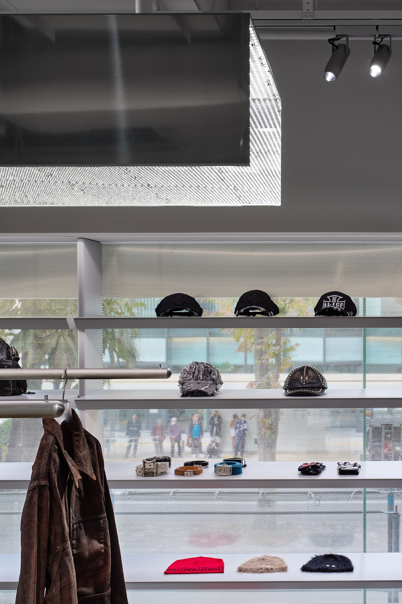 Two long rows of hangers—symbolic of NUBIAN’s spatial identity—stand at the center of the store, above which a box of dot lighting is suspended to dramatically illuminate the products. Along the windows facing the façade, shelving backed with perforated metal is installed, allowing natural light to filter through its openings and gently diffuse throughout the space, bringing a sense of openness.