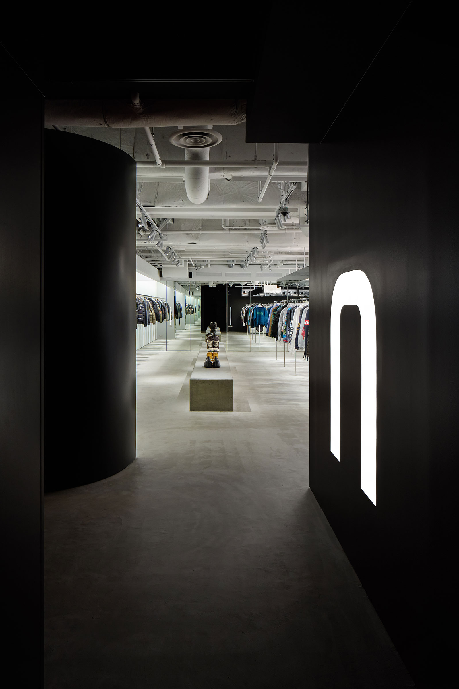 At the front of the site, only a stockroom is intentionally placed. The black wall surface forms a gate, while a circular line of light traces the circulation, guiding visitors toward the main retail area in the back.The interior is finished in a palette of white and silver. Exposed piping and structural elements running across the ceiling retain a sense of raw street culture, while the addition of mirrored and acrylic surfaces layers reflections and transparency, giving the space a refined depth.