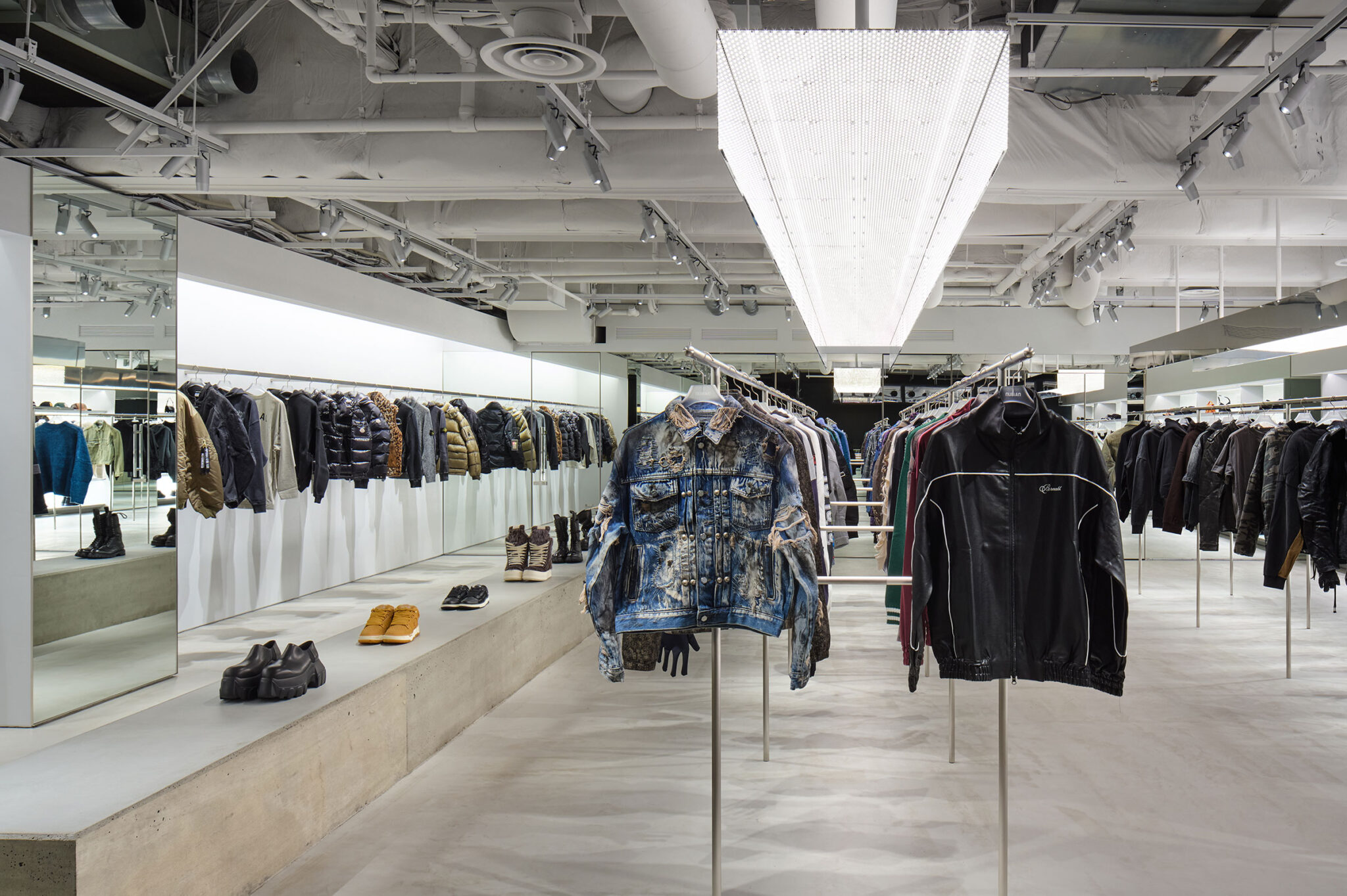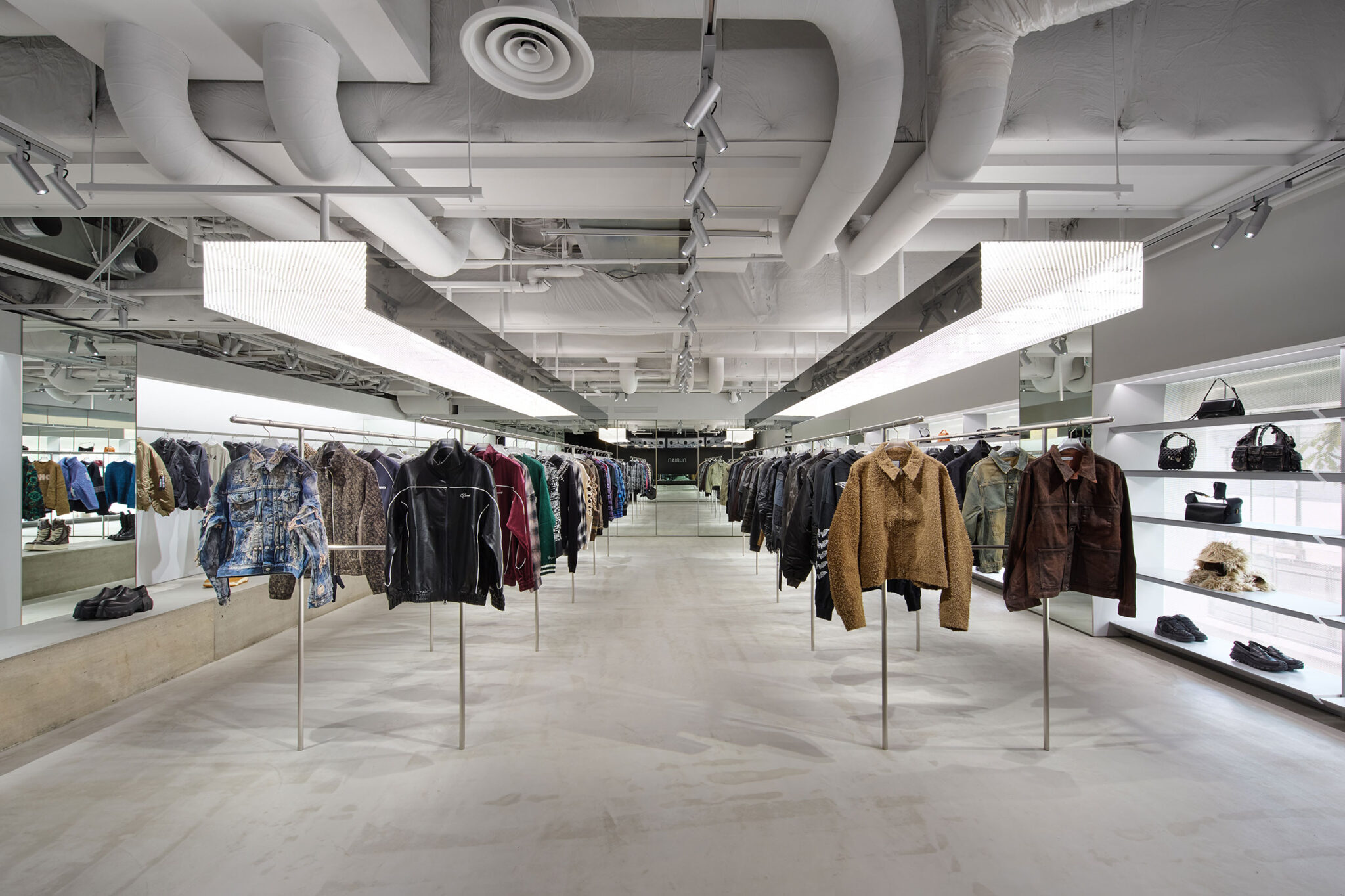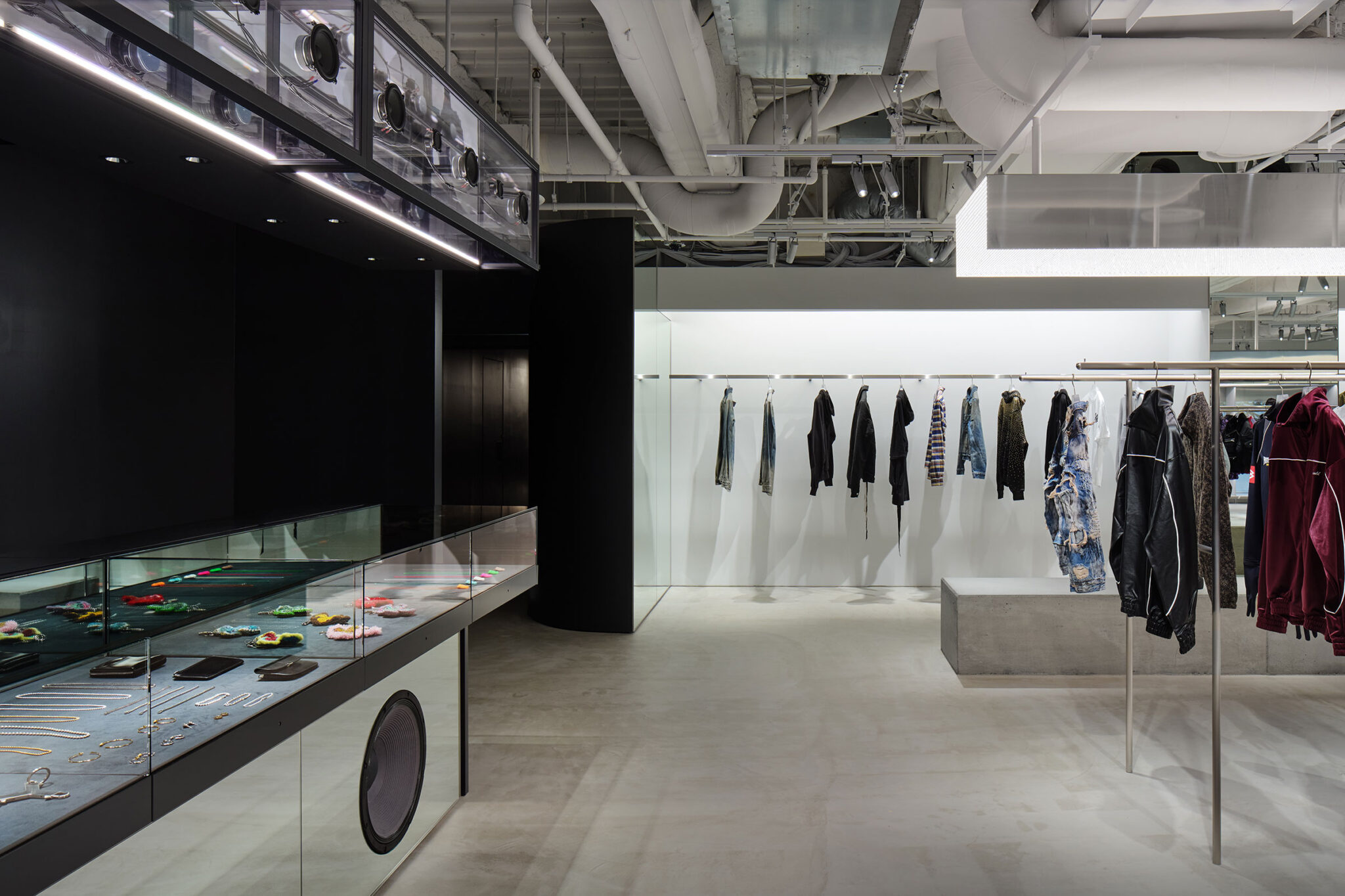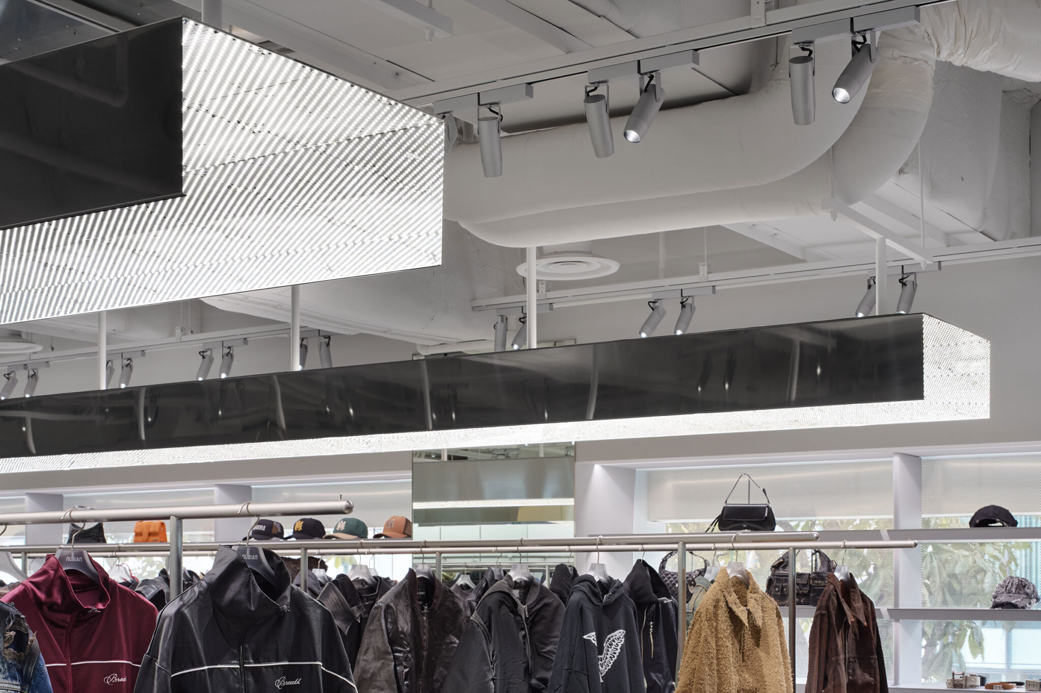 奥の空間は白とシルバーを基調とし、天井に走る配管や構造体を露出させることで、ストリートカルチャーのラフさを残しつつも、鏡面やアクリル素材を組み合わせ、光の反射や透過がもたらす奥行きと洗練された表情を生み出している。