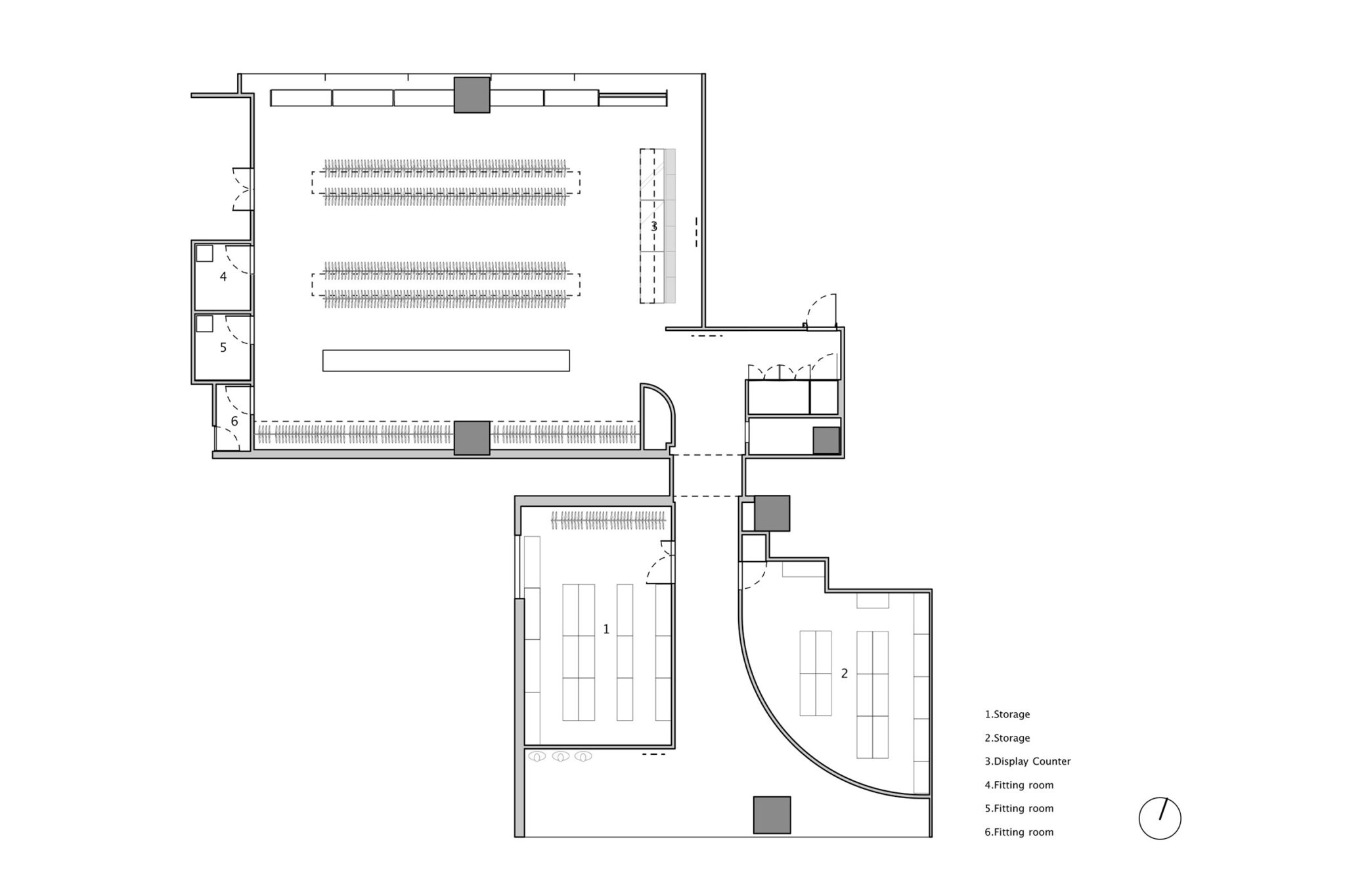 商業施設の本館と別館にまたがる区画での計画です。建築家は、手前の空間に敢えてストックルームを配置して、黒い壁面と円形の照明で奥の売場へと来訪者を誘導する構成を考案しました。また、既存店の要素を継承しつつ新たな表現の導入も意図されました。店舗の場所はこちら(Google Map)。