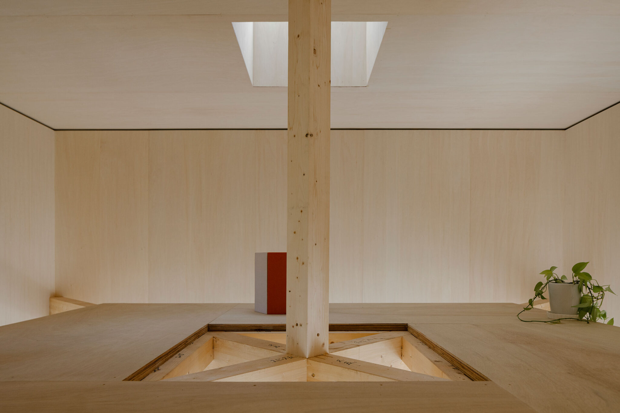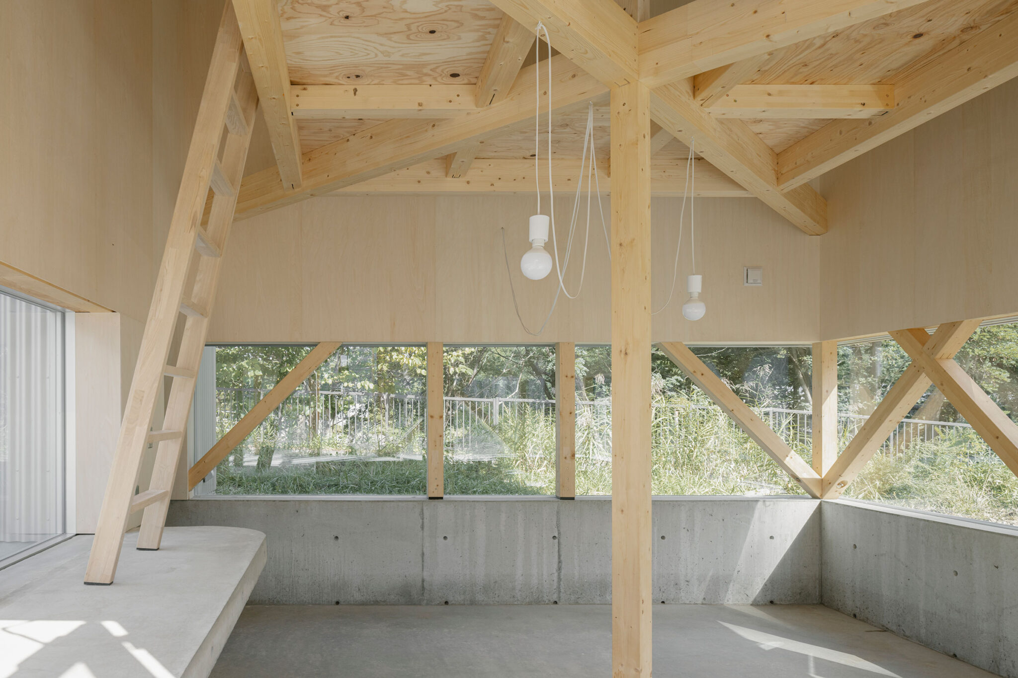 YKAAによる、北海道・札幌市の「Hiraya Pavilion」。“漠然とした環境”の中での計画。様々な人々が集まる“小さな場所”として、変化にも柔軟に応えられる“柔らかくも強い形式”を志向。地面に埋め込んだ“基壇”と“四周の開口部”で様々な行為を促す建築を考案 1階、左:ロフトへの梯子、正面「座処」 photo©イヨンベク