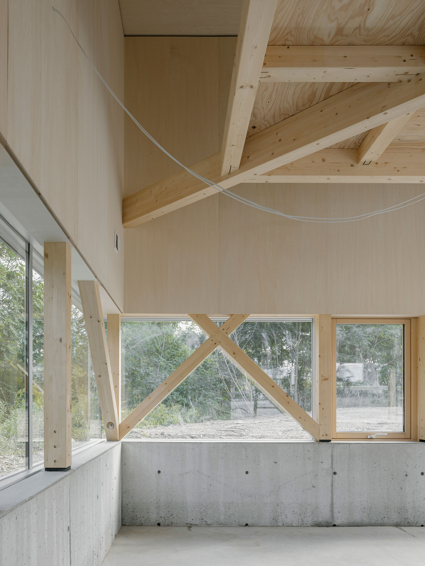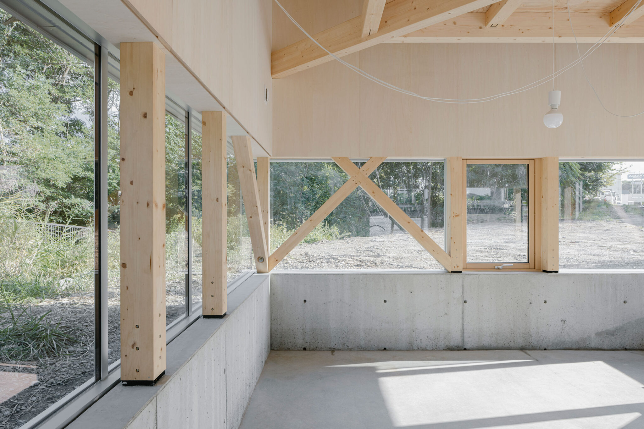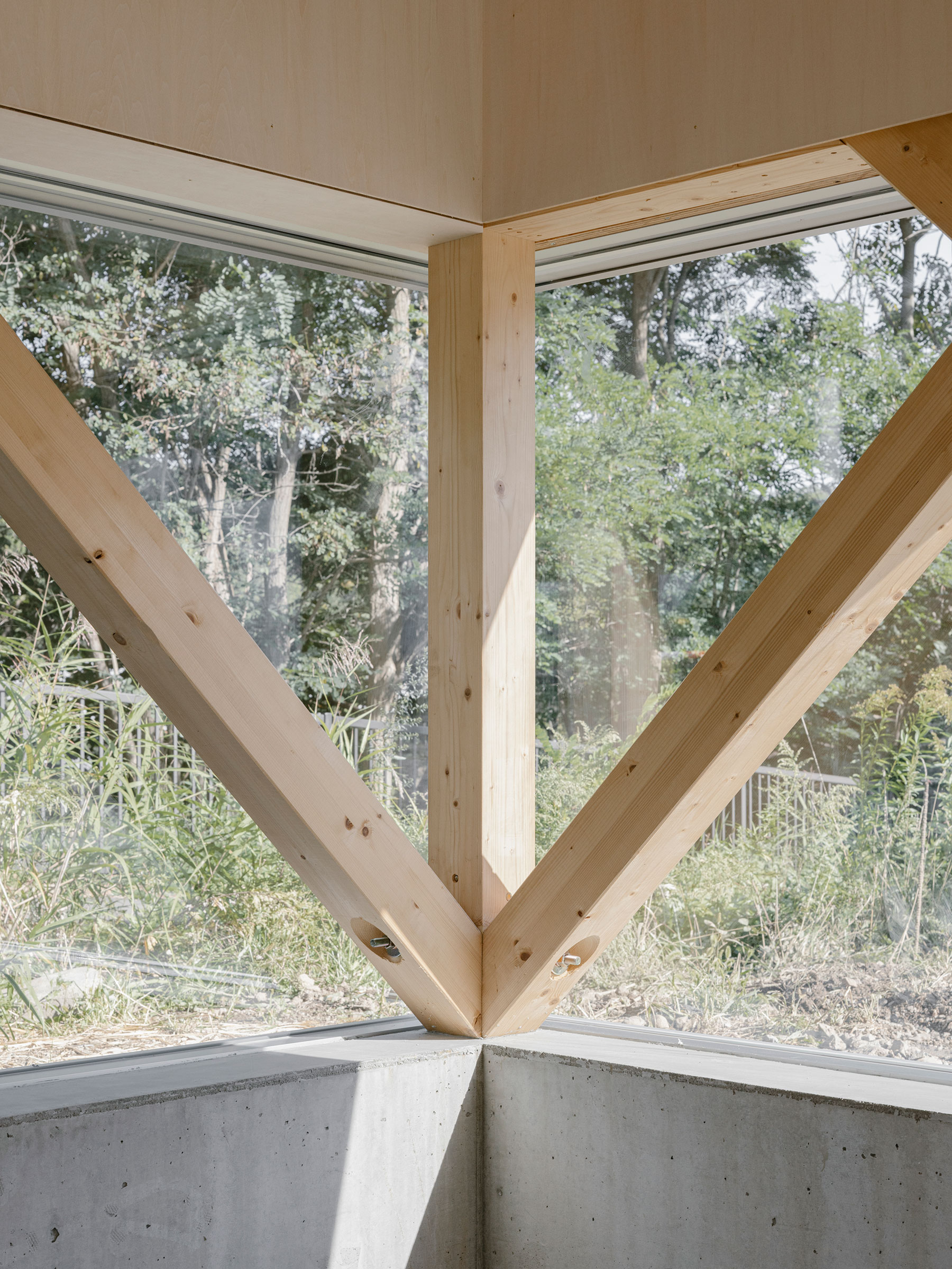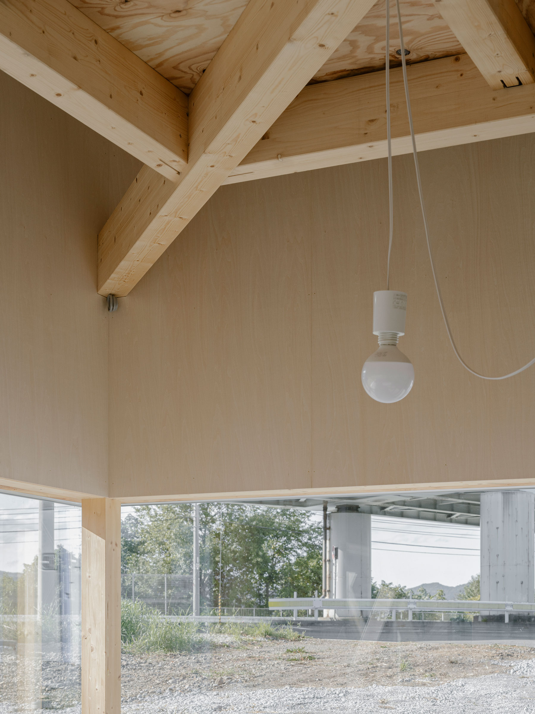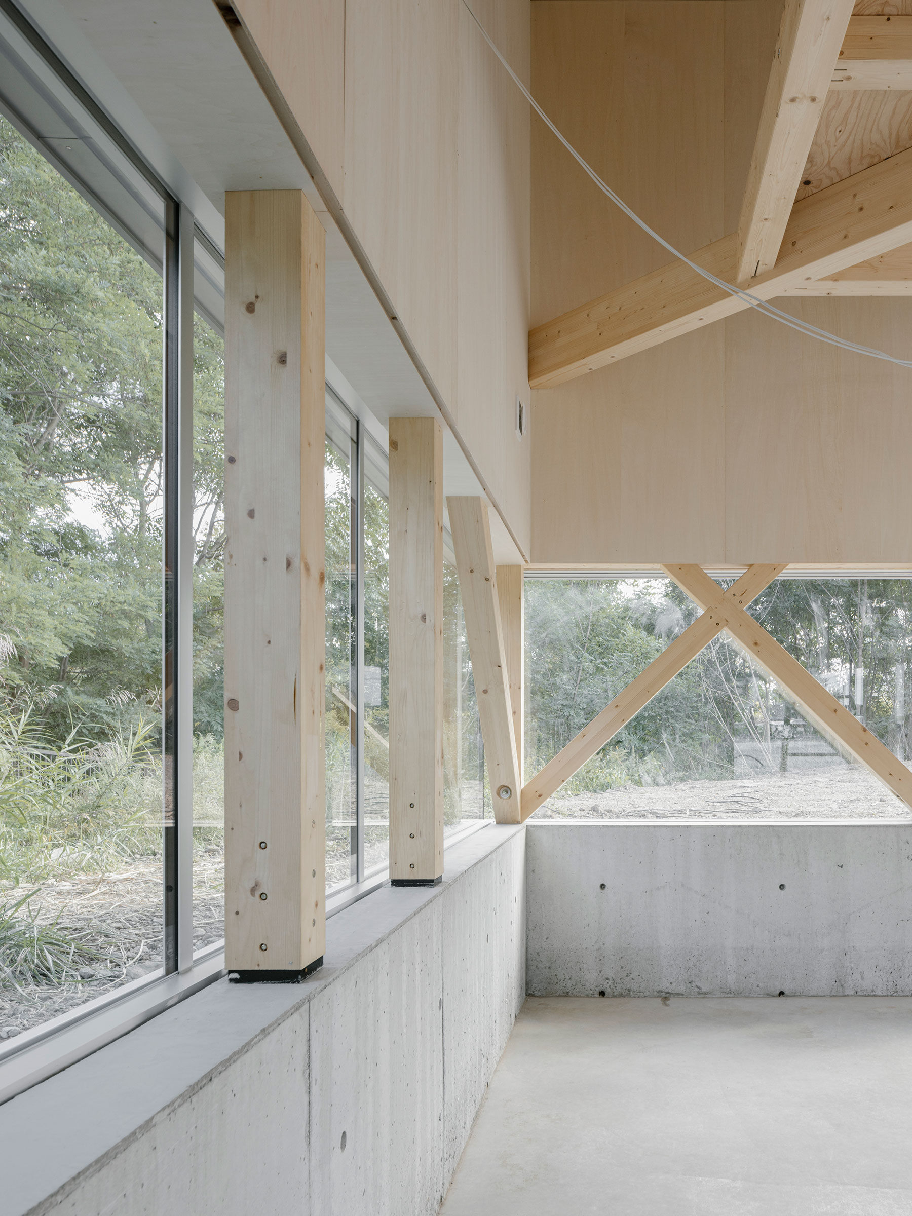 YKAAによる、北海道・札幌市の「Hiraya Pavilion」。“漠然とした環境”の中での計画。様々な人々が集まる“小さな場所”として、変化にも柔軟に応えられる“柔らかくも強い形式”を志向。地面に埋め込んだ“基壇”と“四周の開口部”で様々な行為を促す建築を考案 1階、「座処」、架構の詳細 photo©イヨンベク