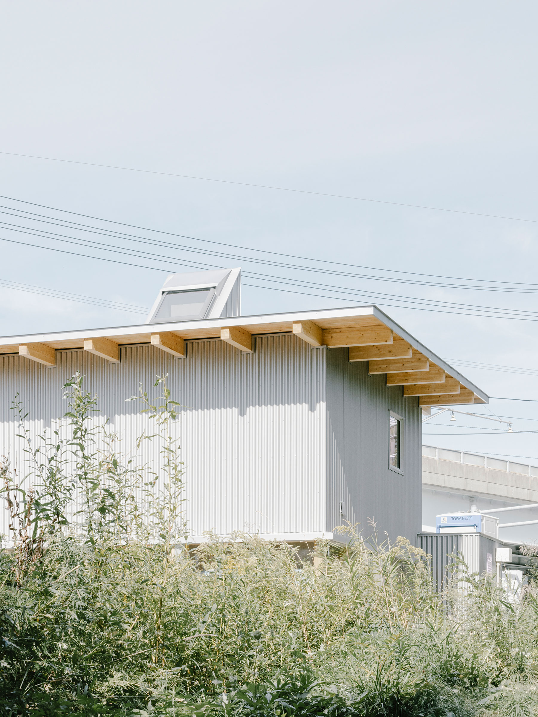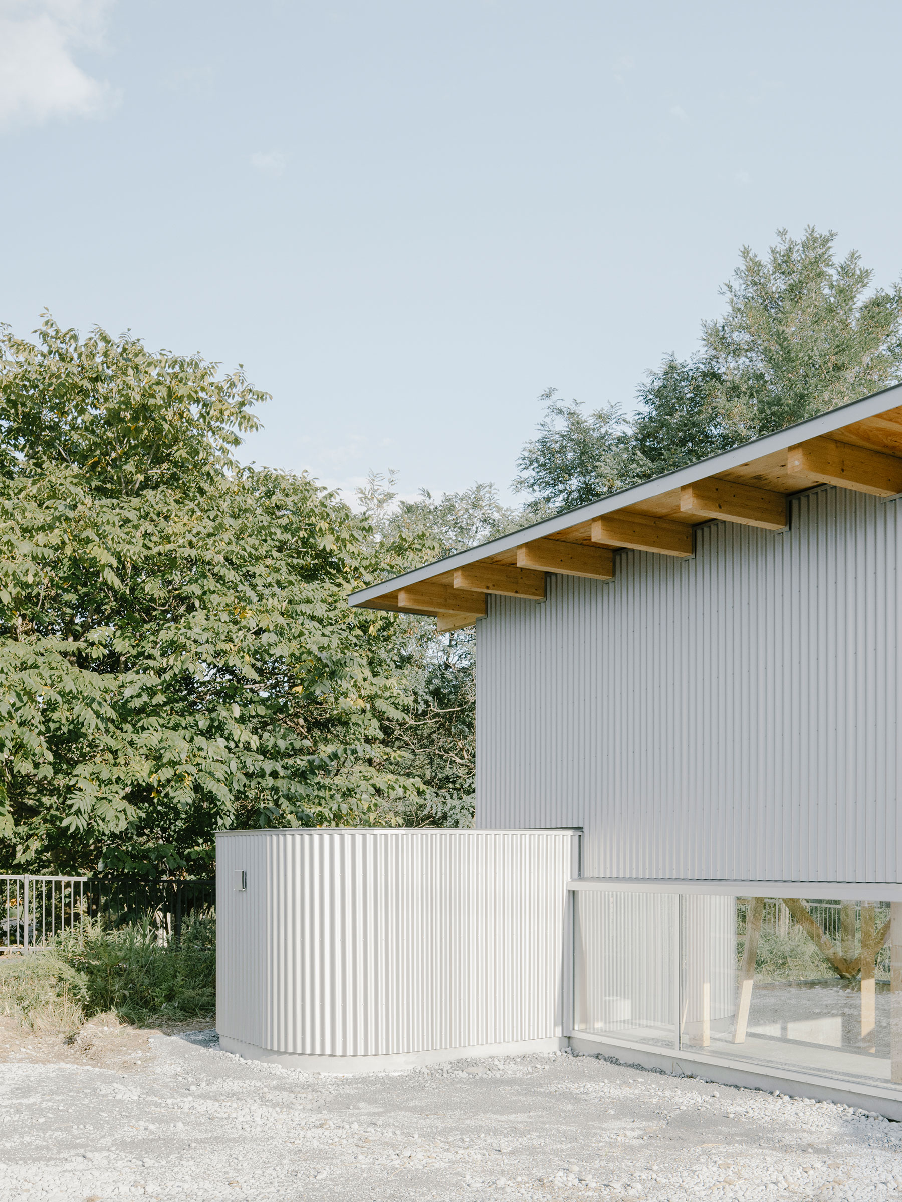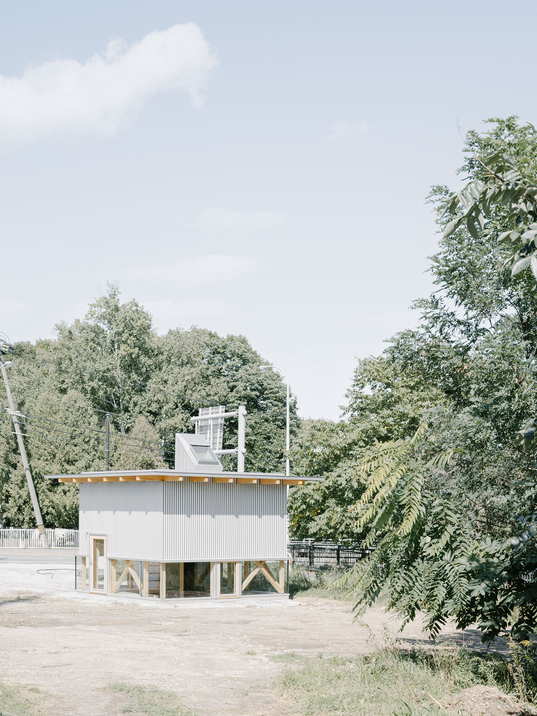YKAAによる、北海道・札幌市の「Hiraya Pavilion」。“漠然とした環境”の中での計画。様々な人々が集まる“小さな場所”として、変化にも柔軟に応えられる“柔らかくも強い形式”を志向。地面に埋め込んだ“基壇”と“四周の開口部”で様々な行為を促す建築を考案 外観、屋根と外壁の詳細 photo©イヨンベク
