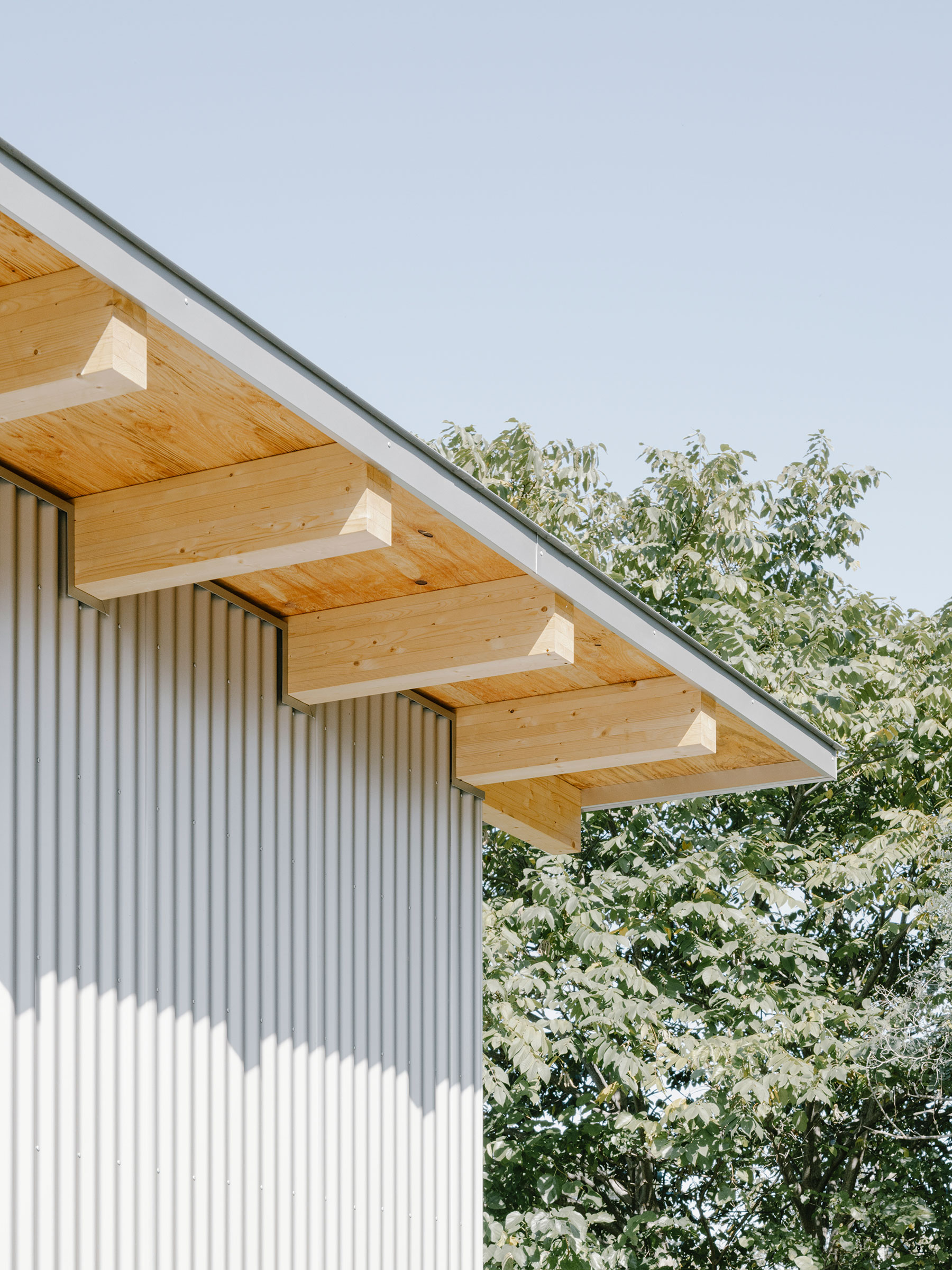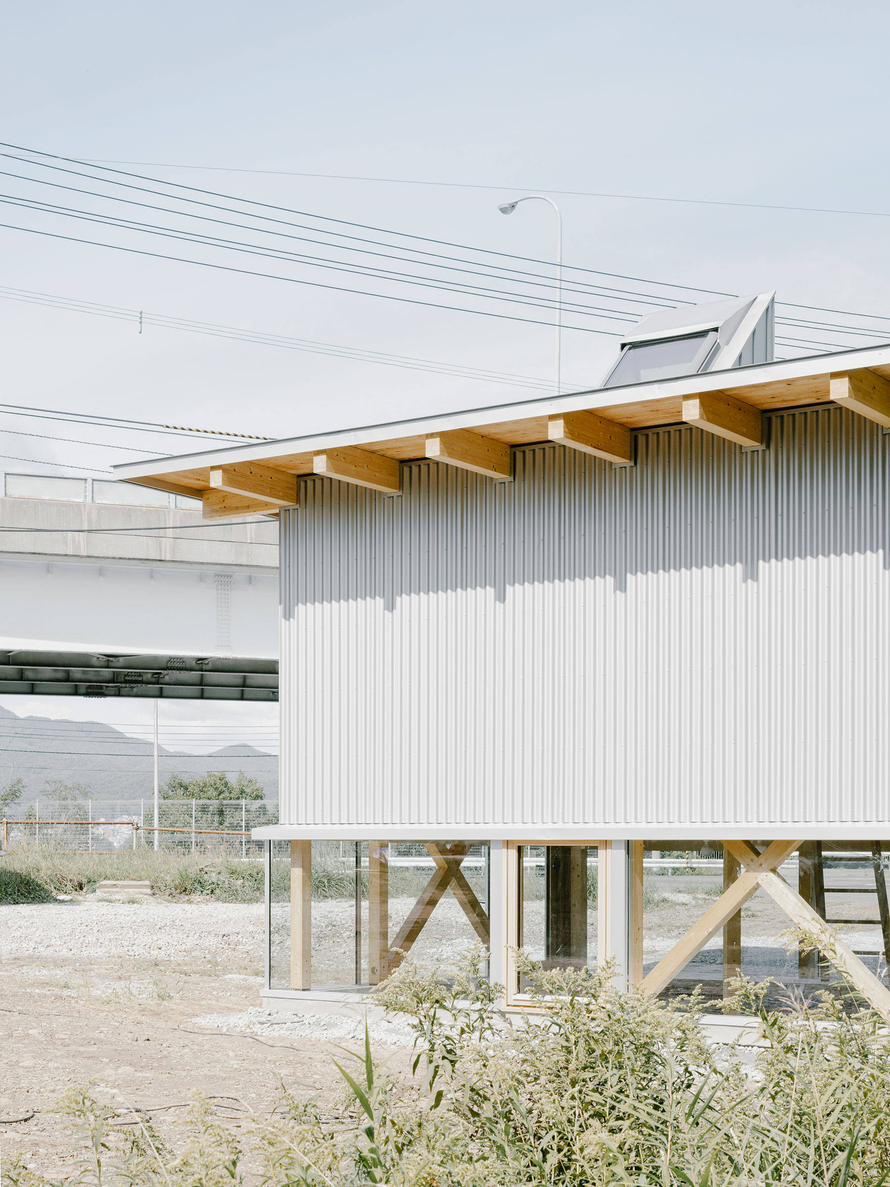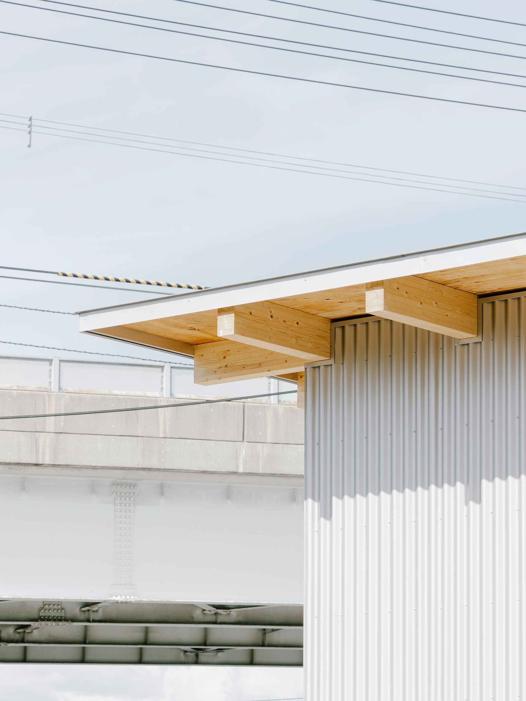 YKAAによる、北海道・札幌市の「Hiraya Pavilion」。“漠然とした環境”の中での計画。様々な人々が集まる“小さな場所”として、変化にも柔軟に応えられる“柔らかくも強い形式”を志向。地面に埋め込んだ“基壇”と“四周の開口部”で様々な行為を促す建築を考案 外観、屋根と外壁の詳細 photo©イヨンベク