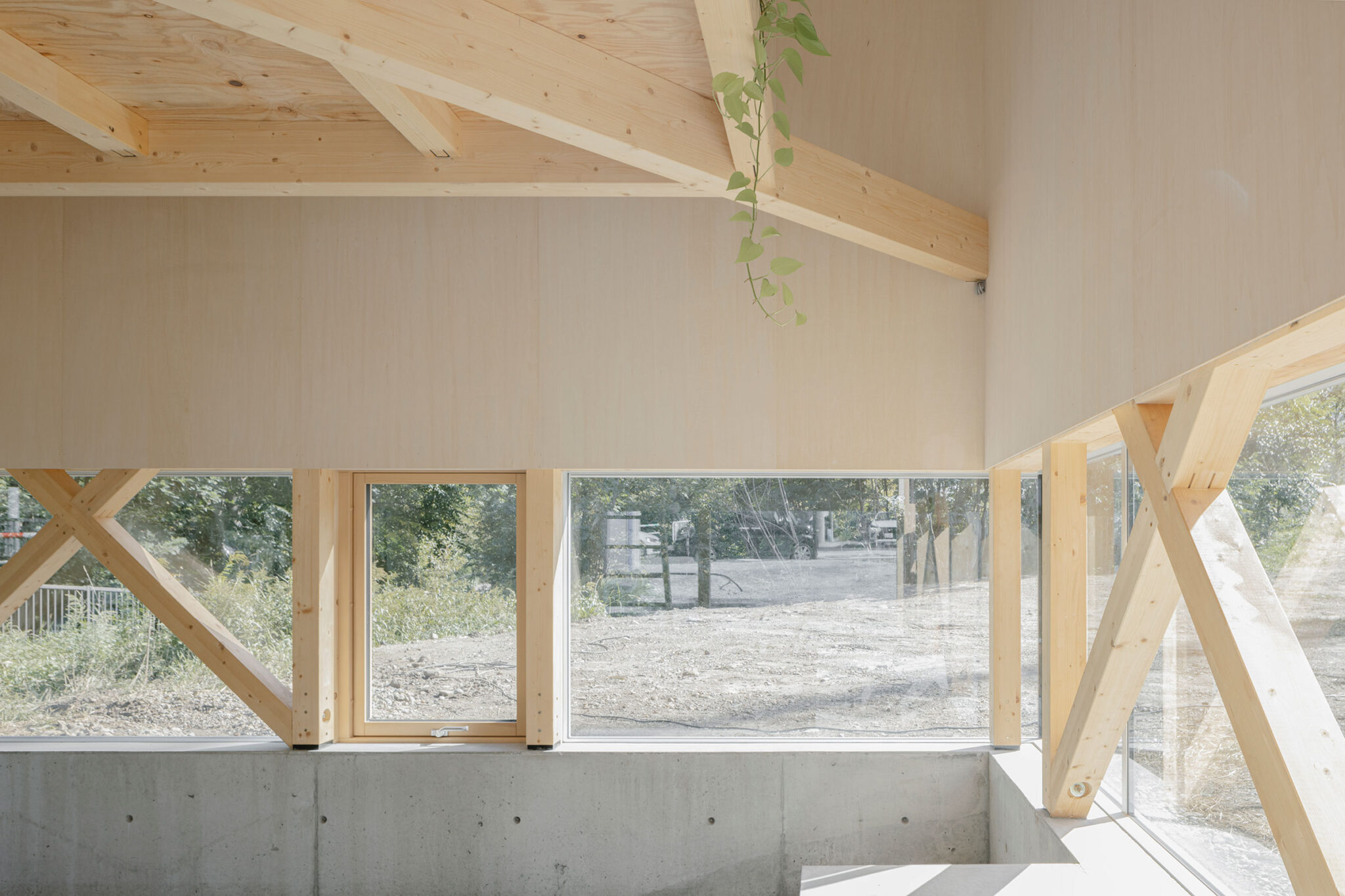 まず建物ボリュームを地面に720mm埋め込みベースとしての基壇を作る。基壇の天端からは4周すべてに開口を設けることで、歩く / 座る / 作業する / 食事する等の様々な行為を促しながら、周囲の庭を取り込むように水平の広がりを確保する。