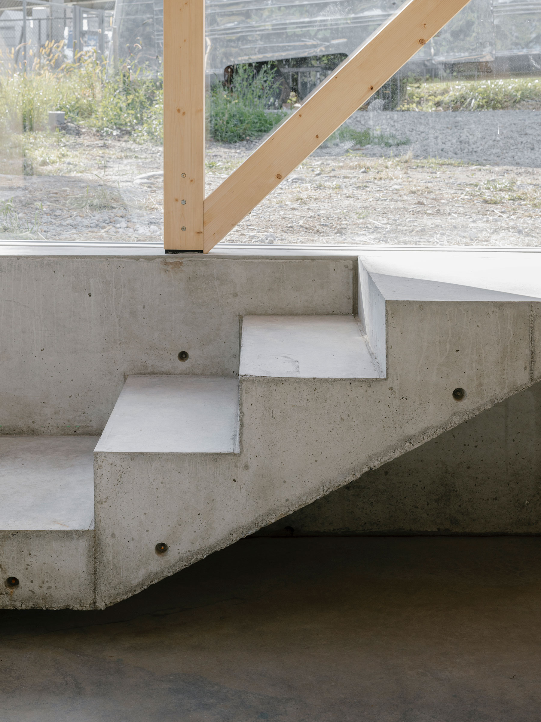 YKAAによる、北海道・札幌市の「Hiraya Pavilion」。“漠然とした環境”の中での計画。様々な人々が集まる“小さな場所”として、変化にも柔軟に応えられる“柔らかくも強い形式”を志向。地面に埋め込んだ“基壇”と“四周の開口部”で様々な行為を促す建築を考案 1階、「座処」、エントランスへの階段。
