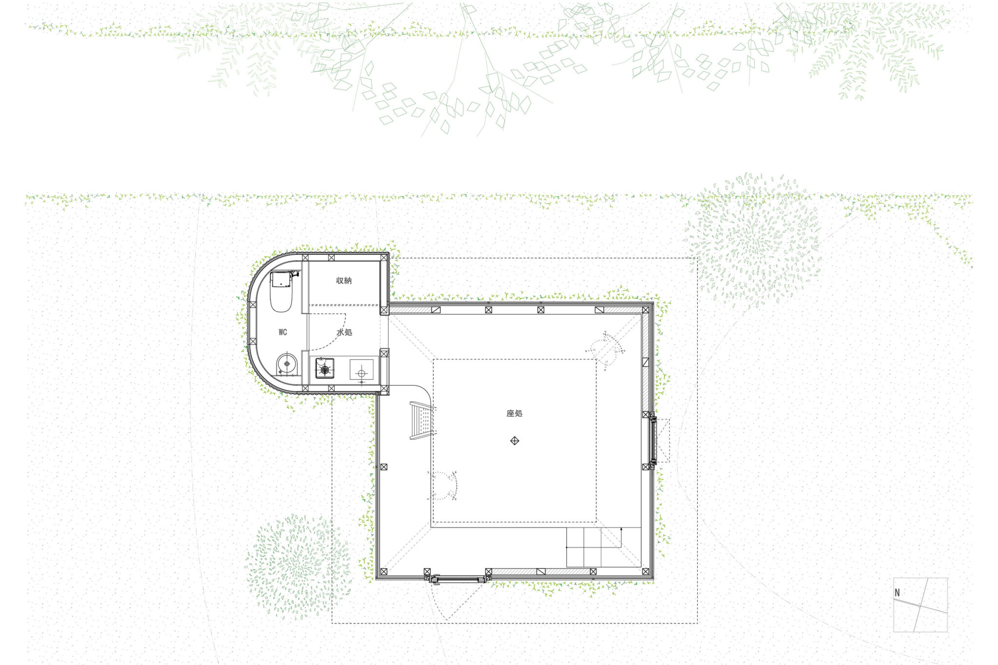 YKAAによる、北海道・札幌市の「Hiraya Pavilion」。“漠然とした環境”の中での計画。様々な人々が集まる“小さな場所”として、変化にも柔軟に応えられる“柔らかくも強い形式”を志向。地面に埋め込んだ“基壇”と“四周の開口部”で様々な行為を促す建築を考案 1階平面図 image©YKAA