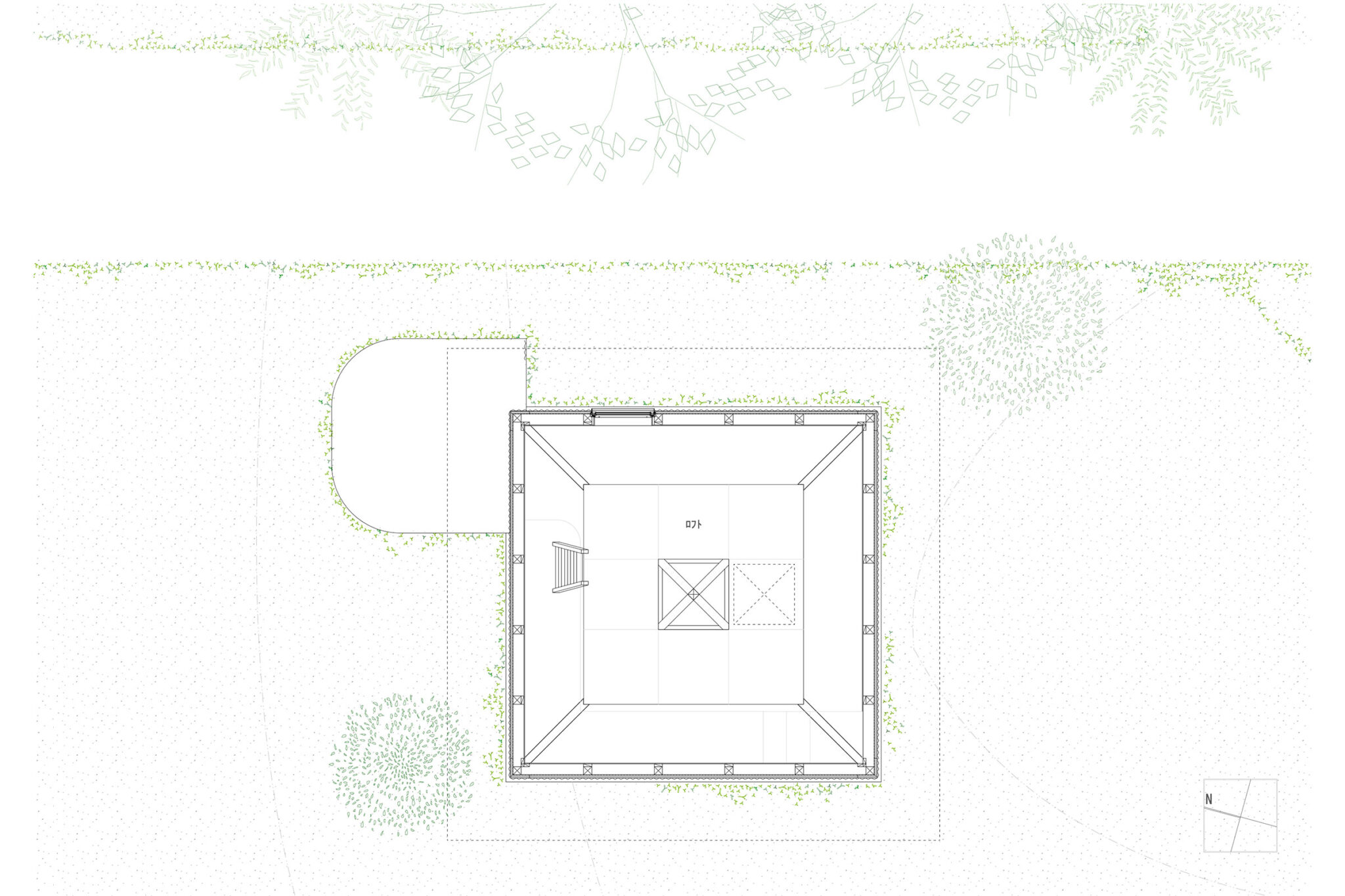 YKAAによる、北海道・札幌市の「Hiraya Pavilion」。“漠然とした環境”の中での計画。様々な人々が集まる“小さな場所”として、変化にも柔軟に応えられる“柔らかくも強い形式”を志向。地面に埋め込んだ“基壇”と“四周の開口部”で様々な行為を促す建築を考案 ロフト平面図 image©YKAA