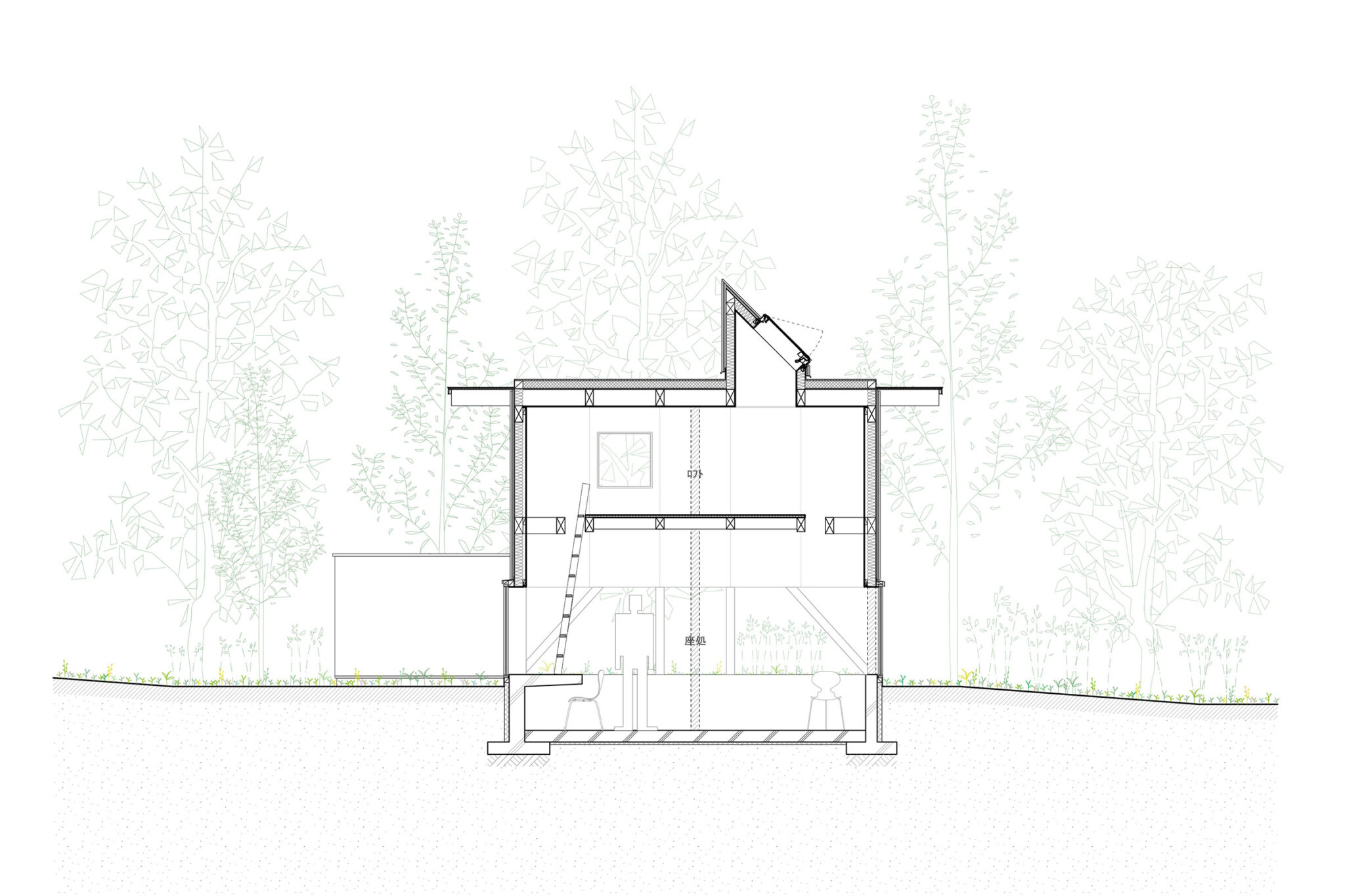 YKAAによる、北海道・札幌市の「Hiraya Pavilion」。“漠然とした環境”の中での計画。様々な人々が集まる“小さな場所”として、変化にも柔軟に応えられる“柔らかくも強い形式”を志向。地面に埋め込んだ“基壇”と“四周の開口部”で様々な行為を促す建築を考案 断面図 image©YKAA