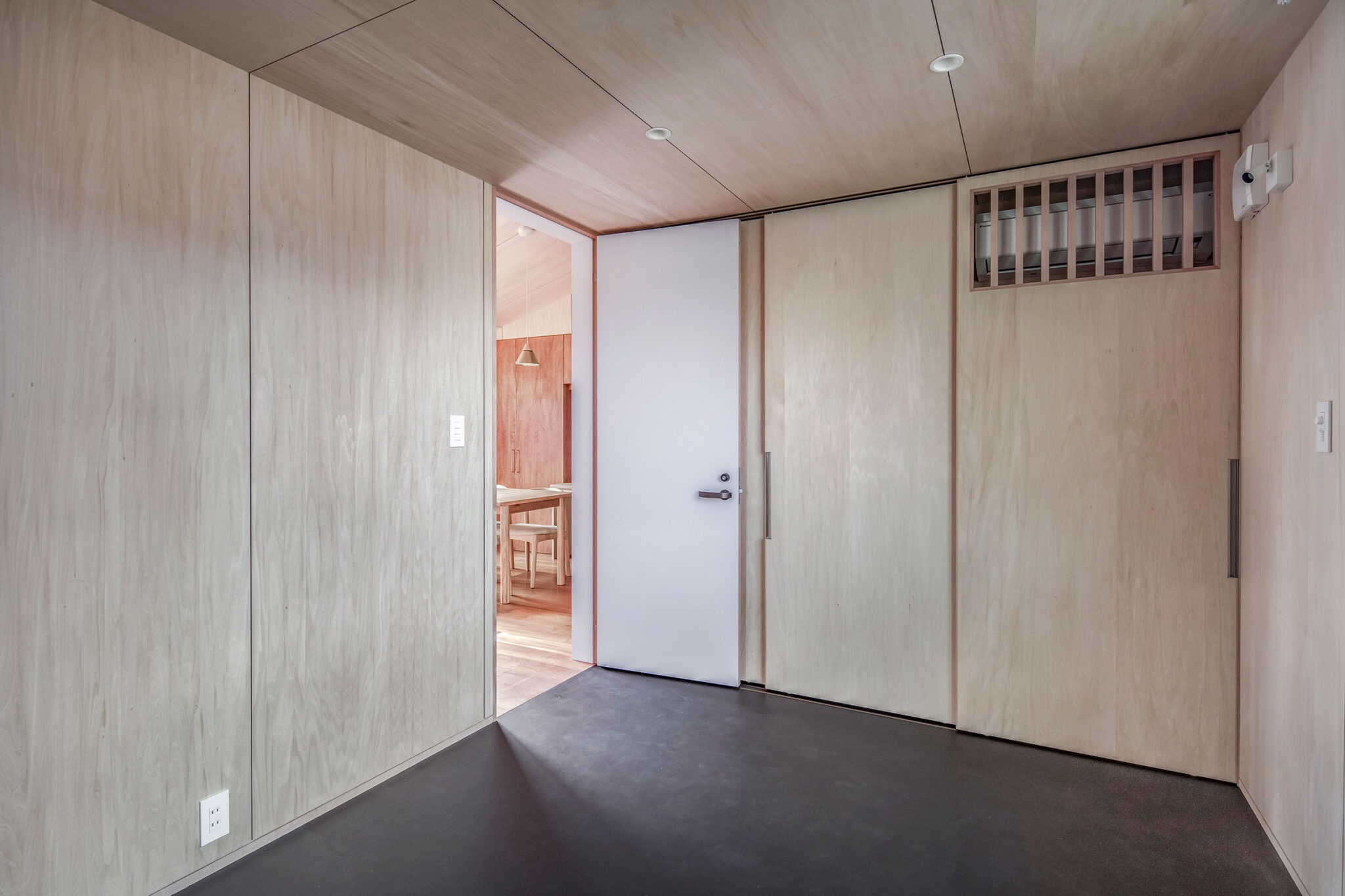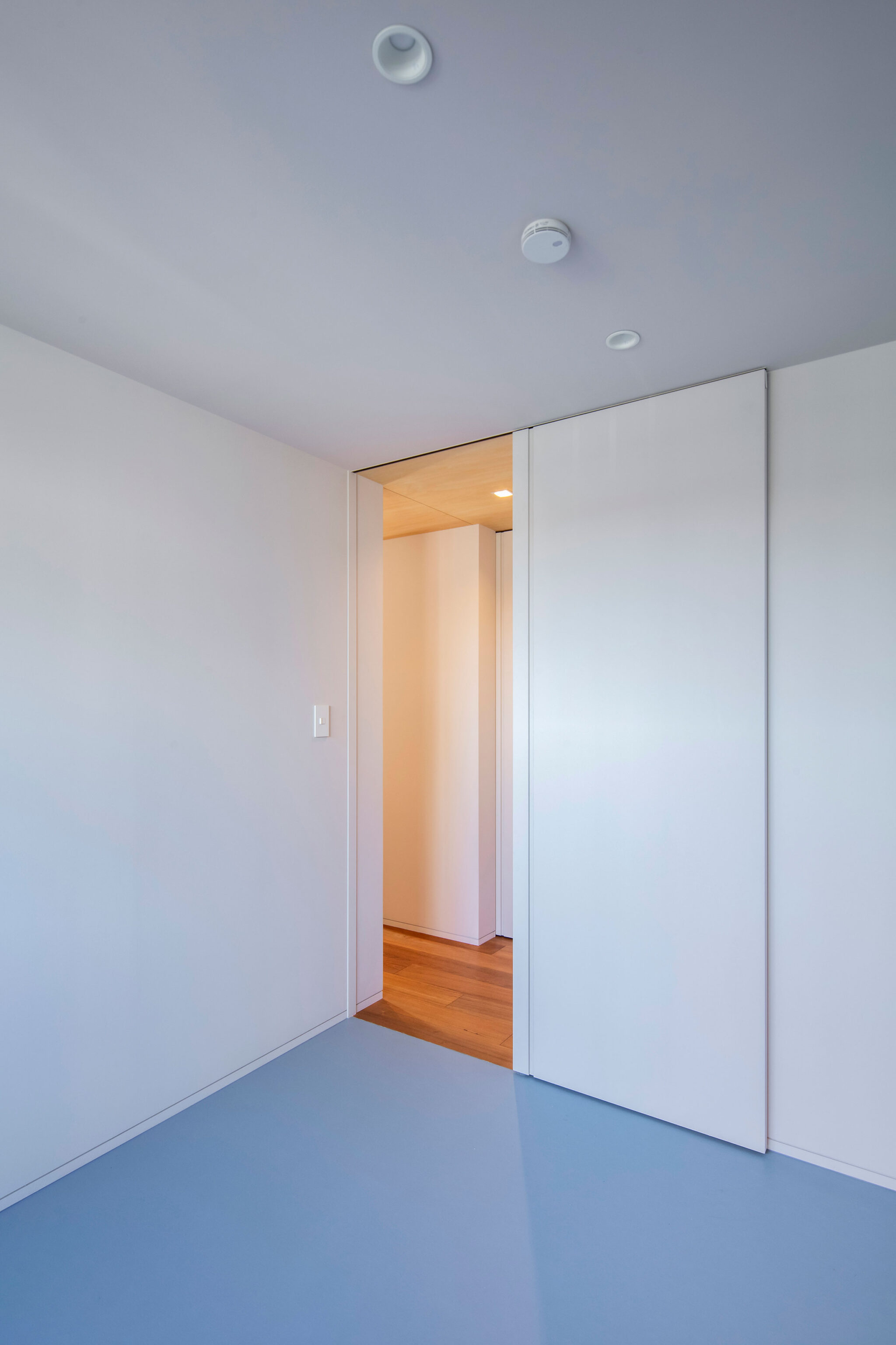 小林敬政による、大阪市の「K邸」。施主家族が40年以上暮らした住まいの建替。既存を建物を超えた“記憶の器”と捉え、刷新ではなく“継承”する設計を志向。旧家屋の間取りを参照して“再構築”した平面構成で“空間体験”を通して記憶を喚起する 2階、寝室 photo©多田ユウコ写真事務所